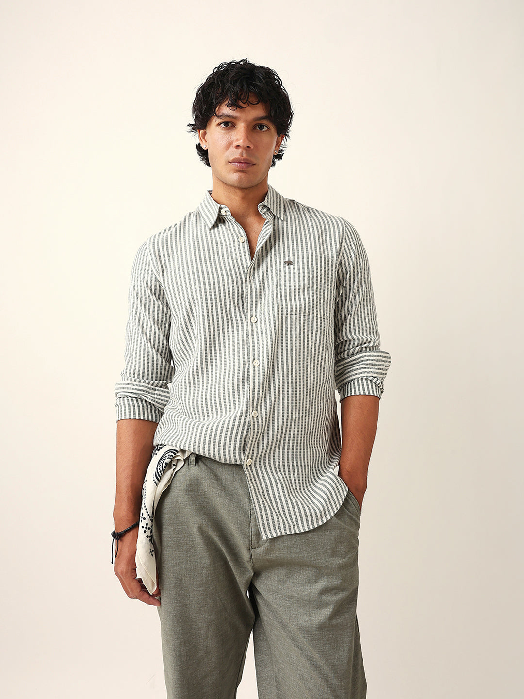 Shop Green & White Vertical Woven Pinstriped Slim Fit Casual Shirt Online.