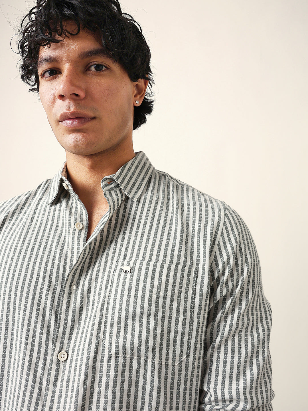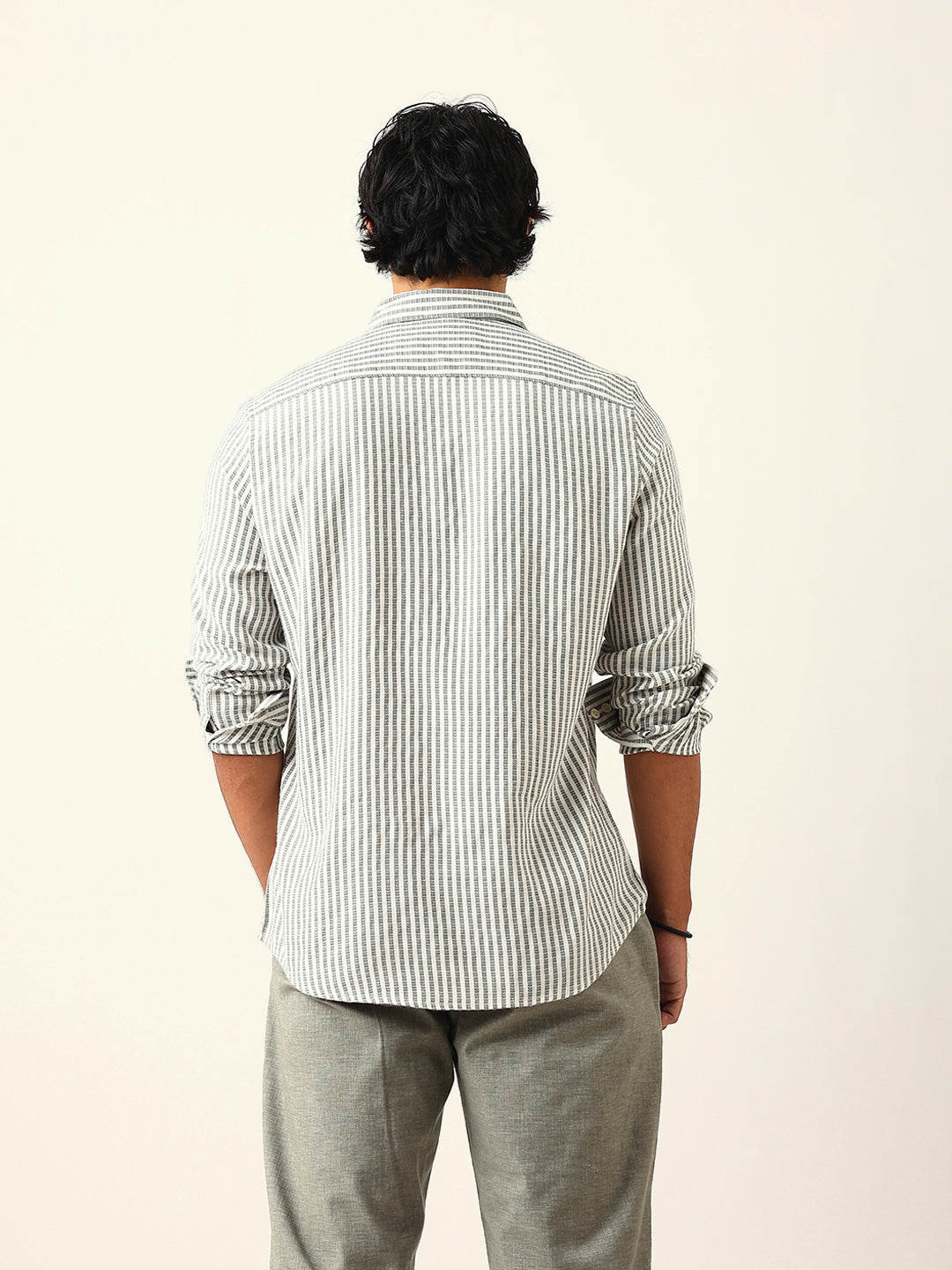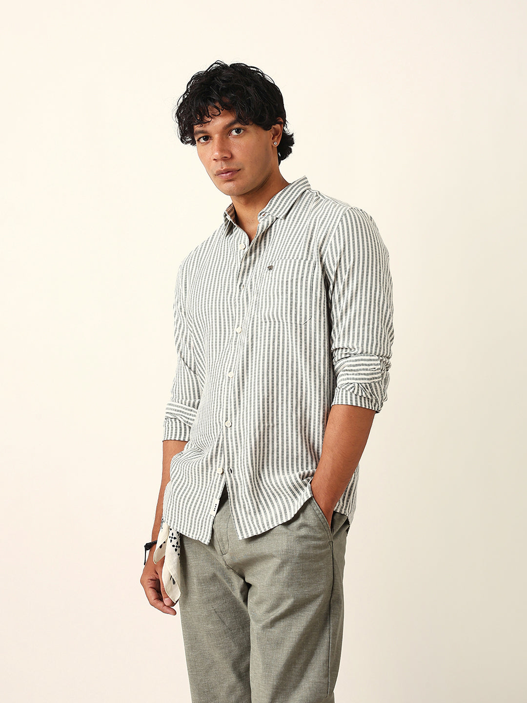 Green & White Vertical Woven Pinstriped Slim Fit Casual Shirt
