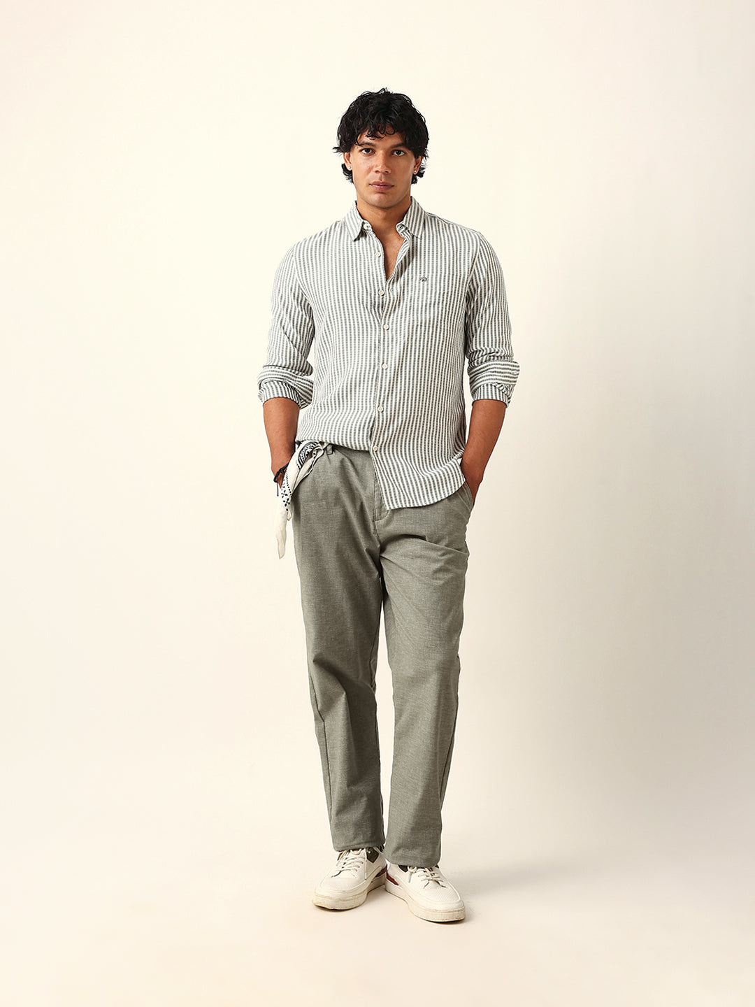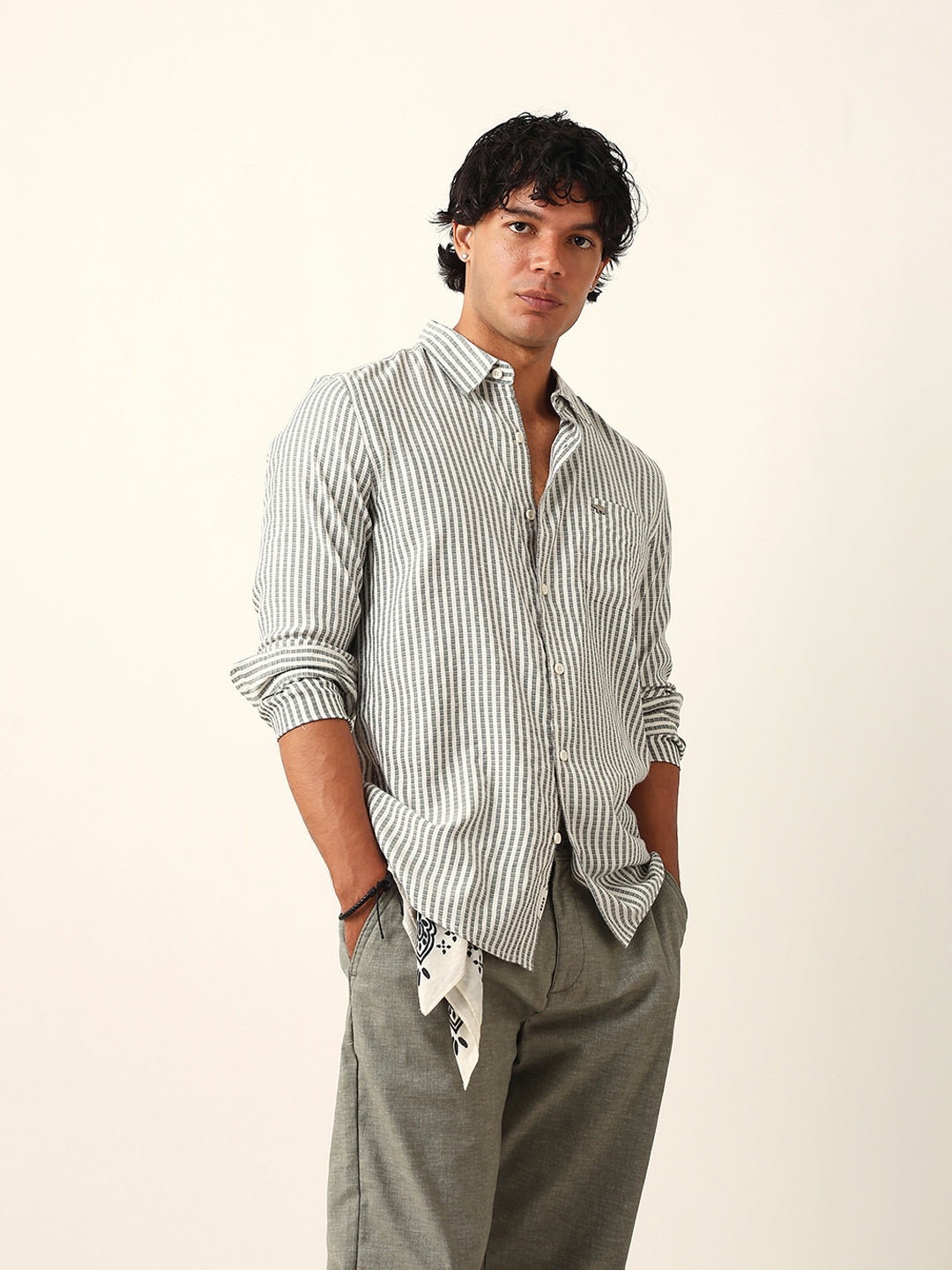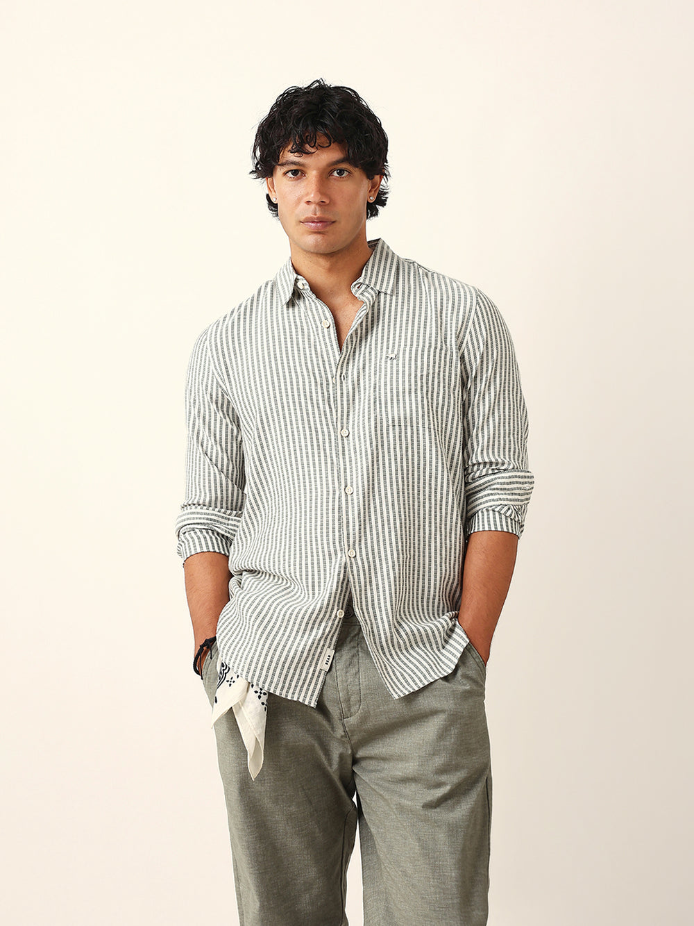 Green & White Vertical Woven Pinstriped Slim Fit Casual Shirt