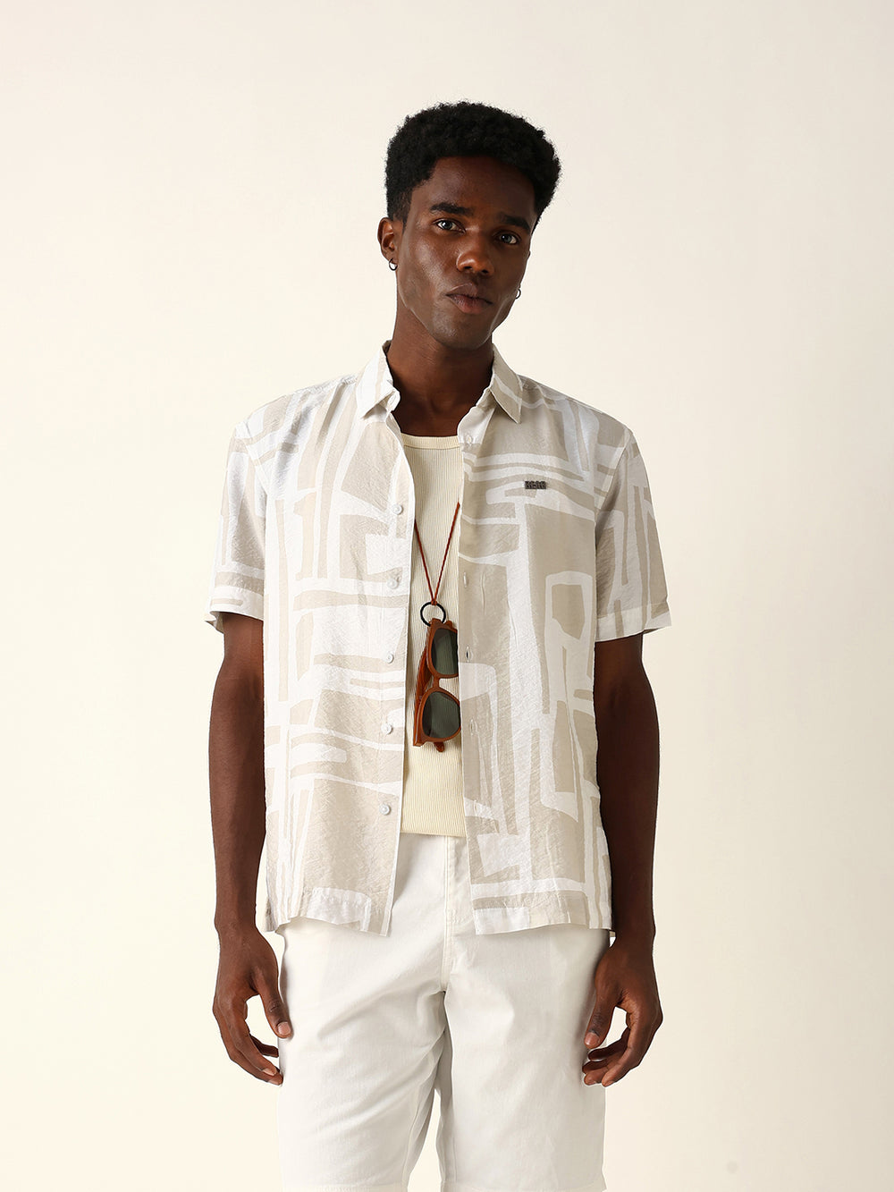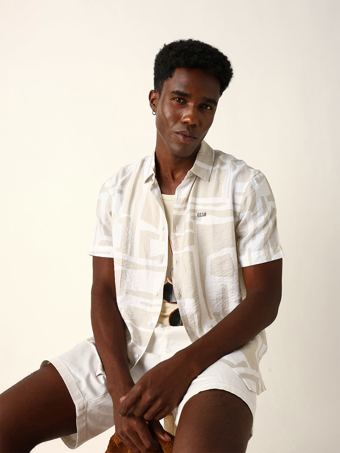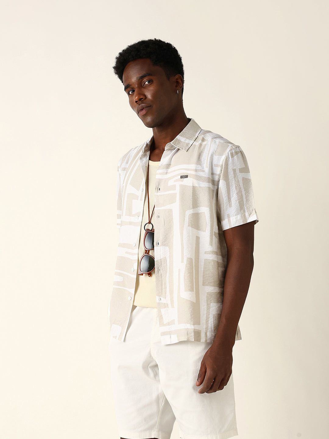 White & Beige Relaxed Fit Abstract Stroke Print Half Sleeve Casual Shirt