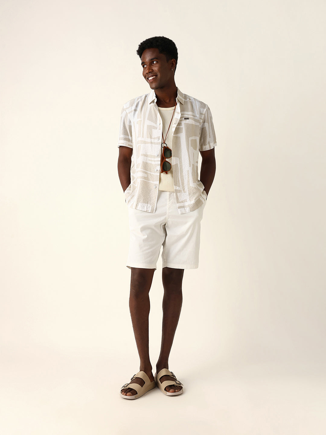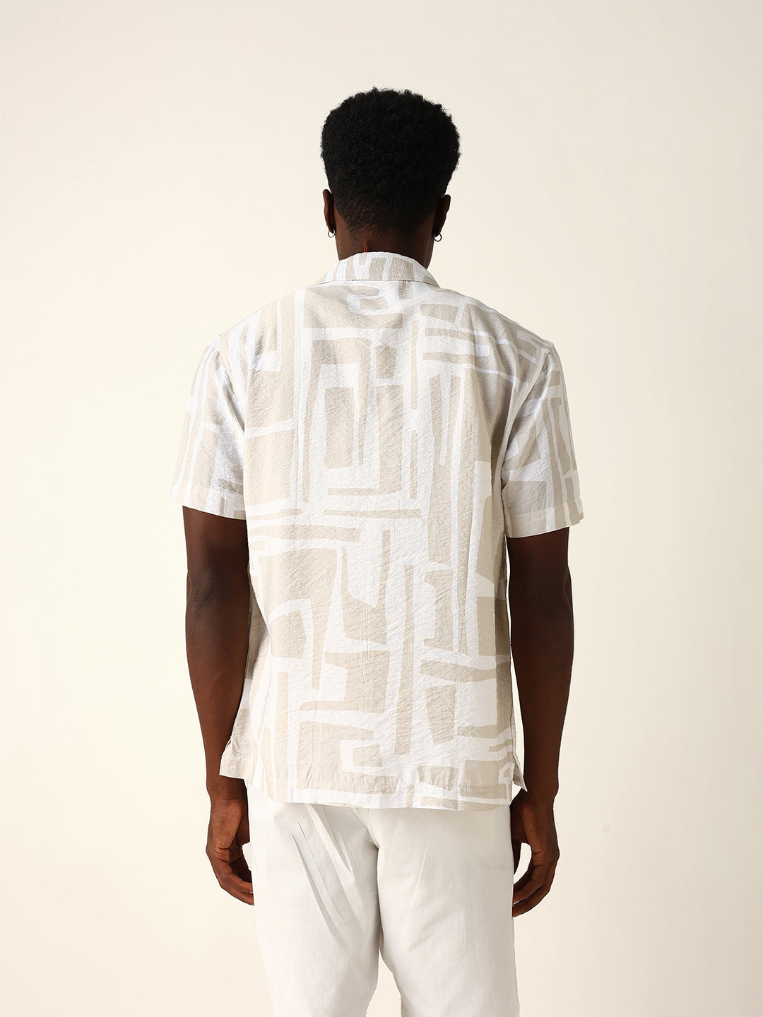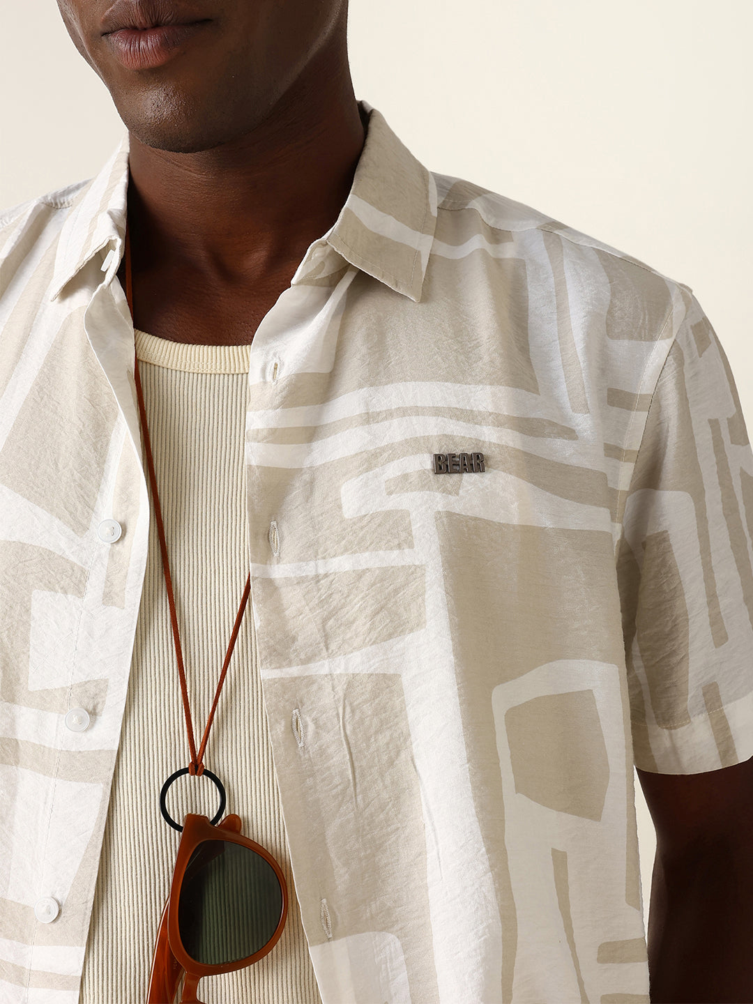 White & Beige Relaxed Fit Abstract Stroke Print Half Sleeve Casual Shirt
