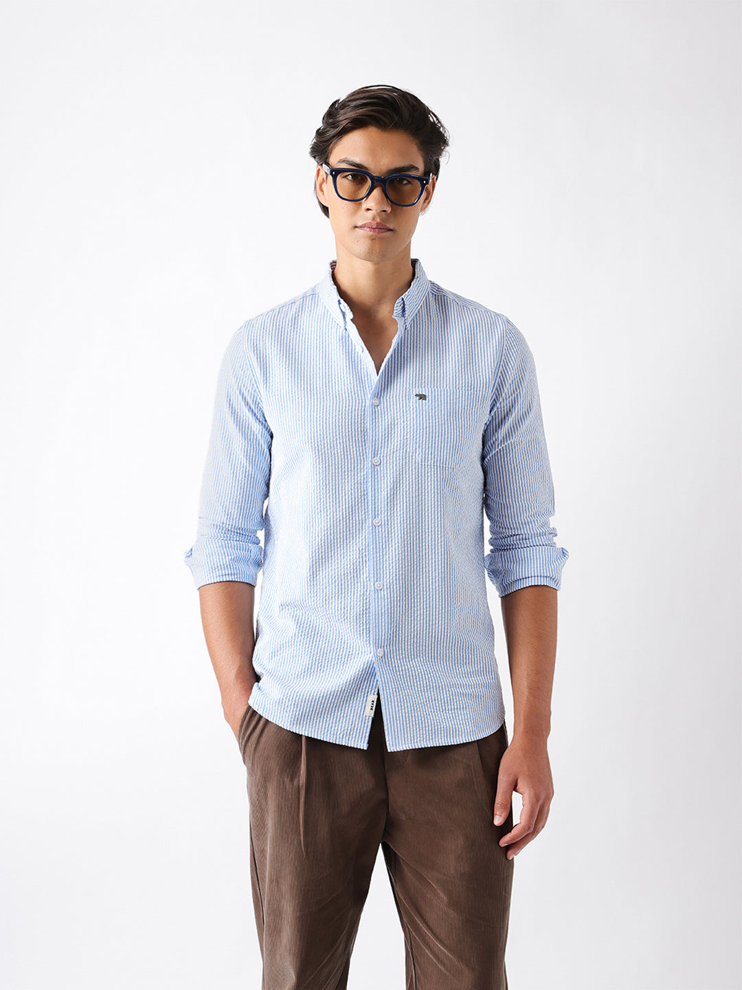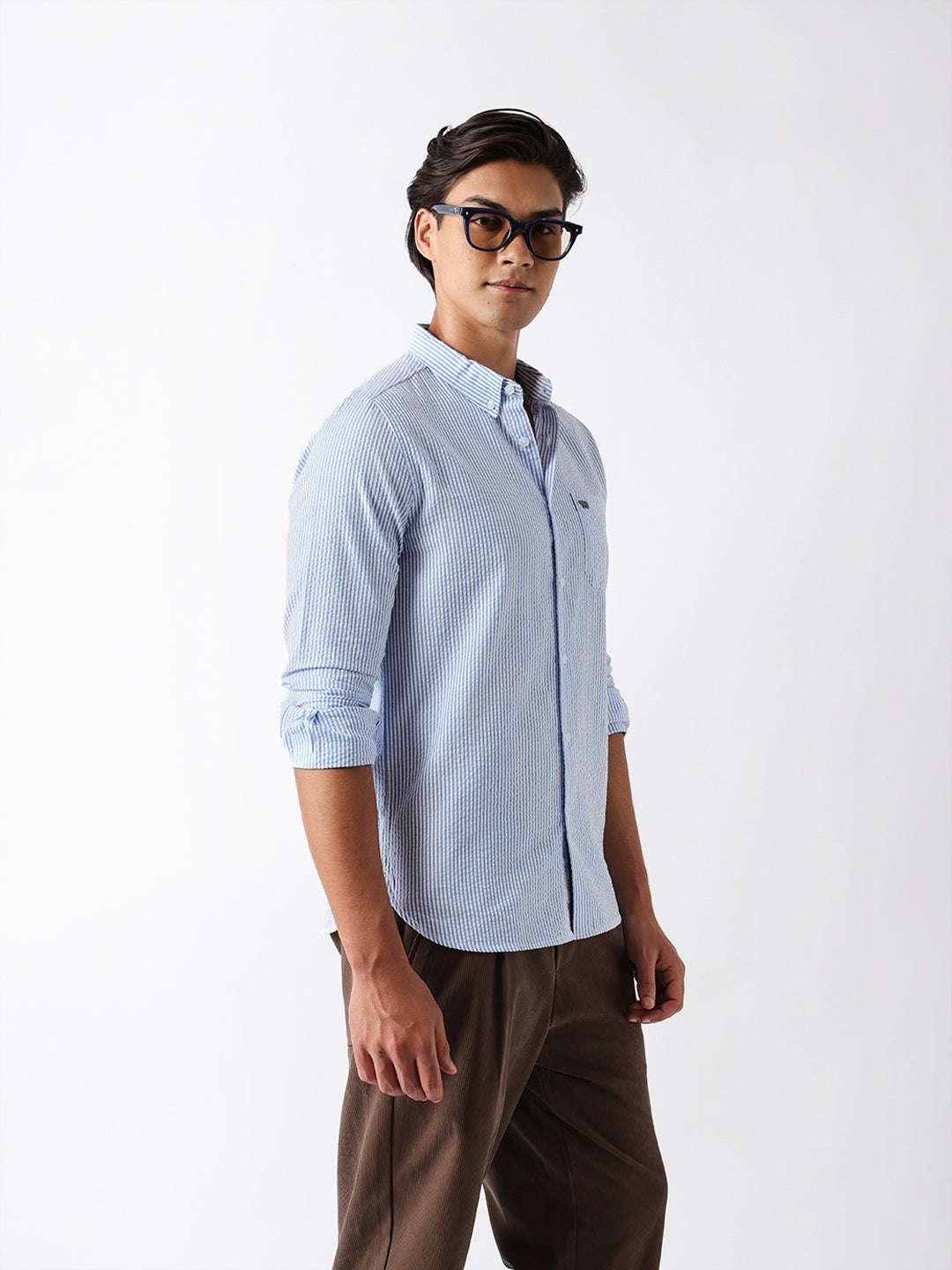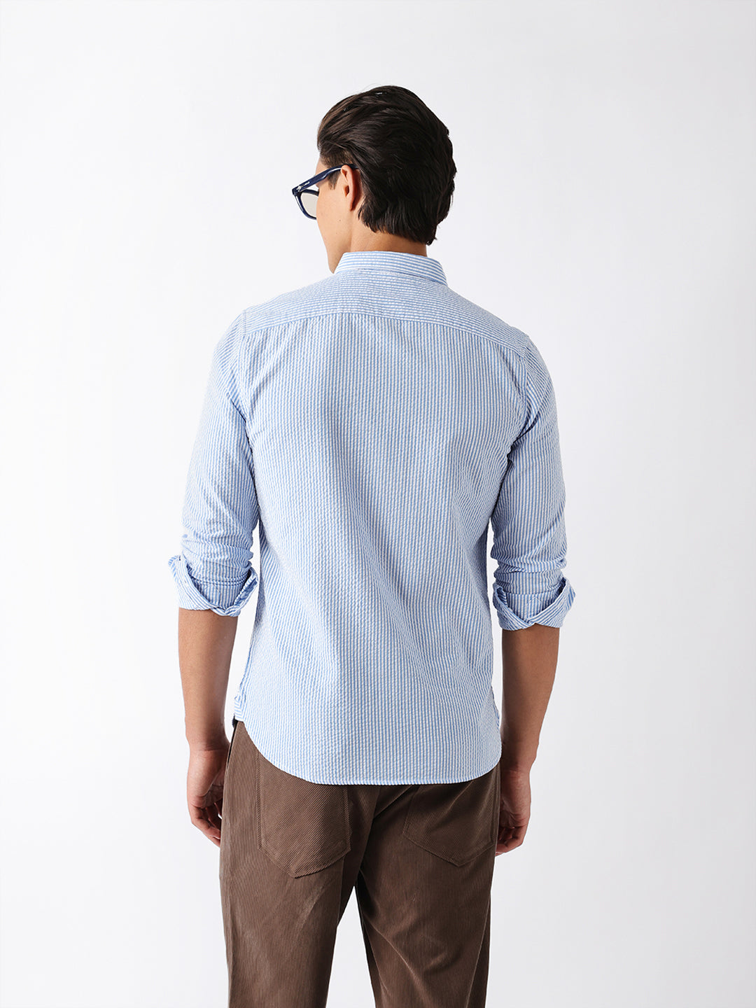 - Pattern: Vertical seersucker pinstripe design with crinkled texture