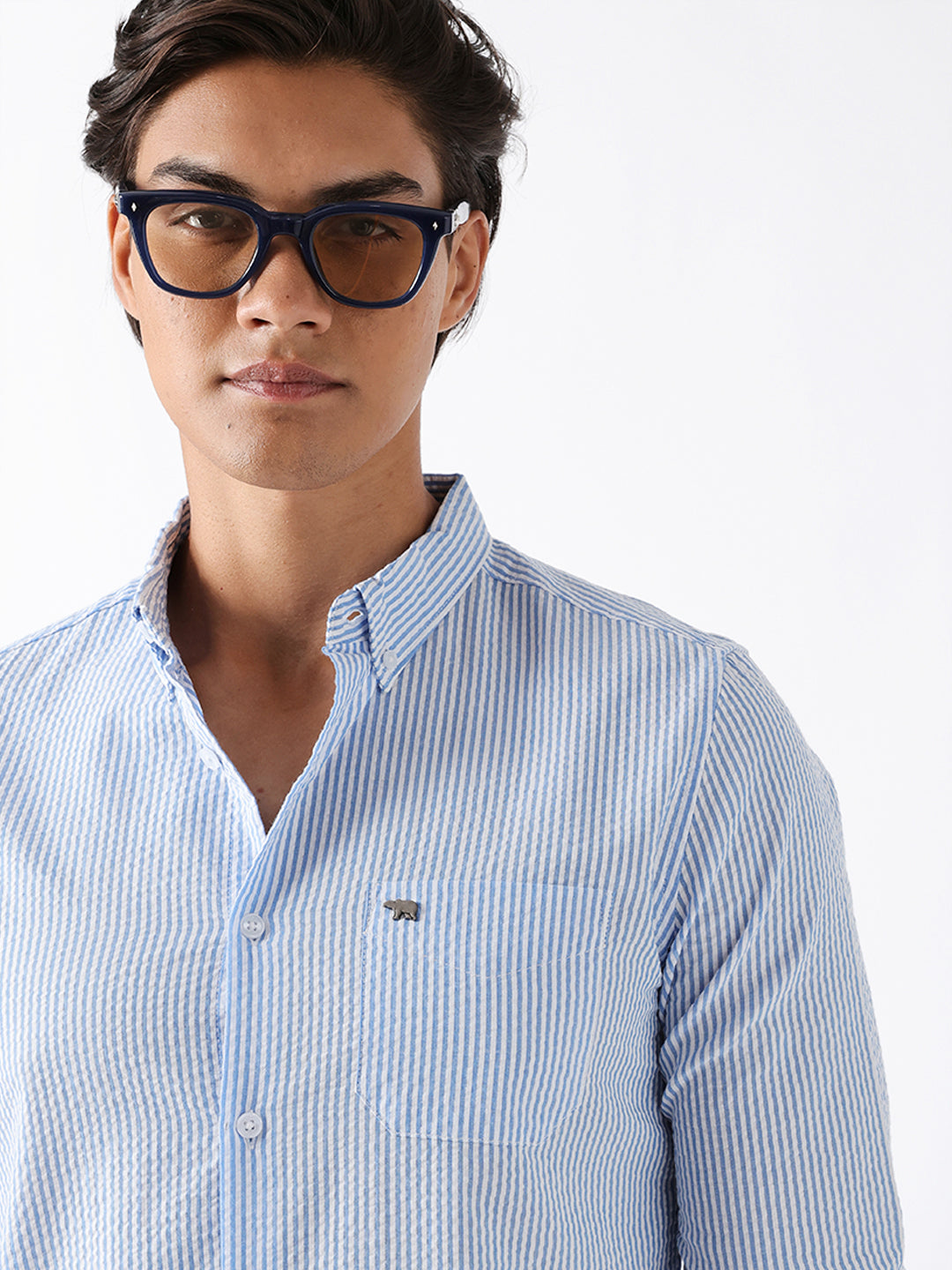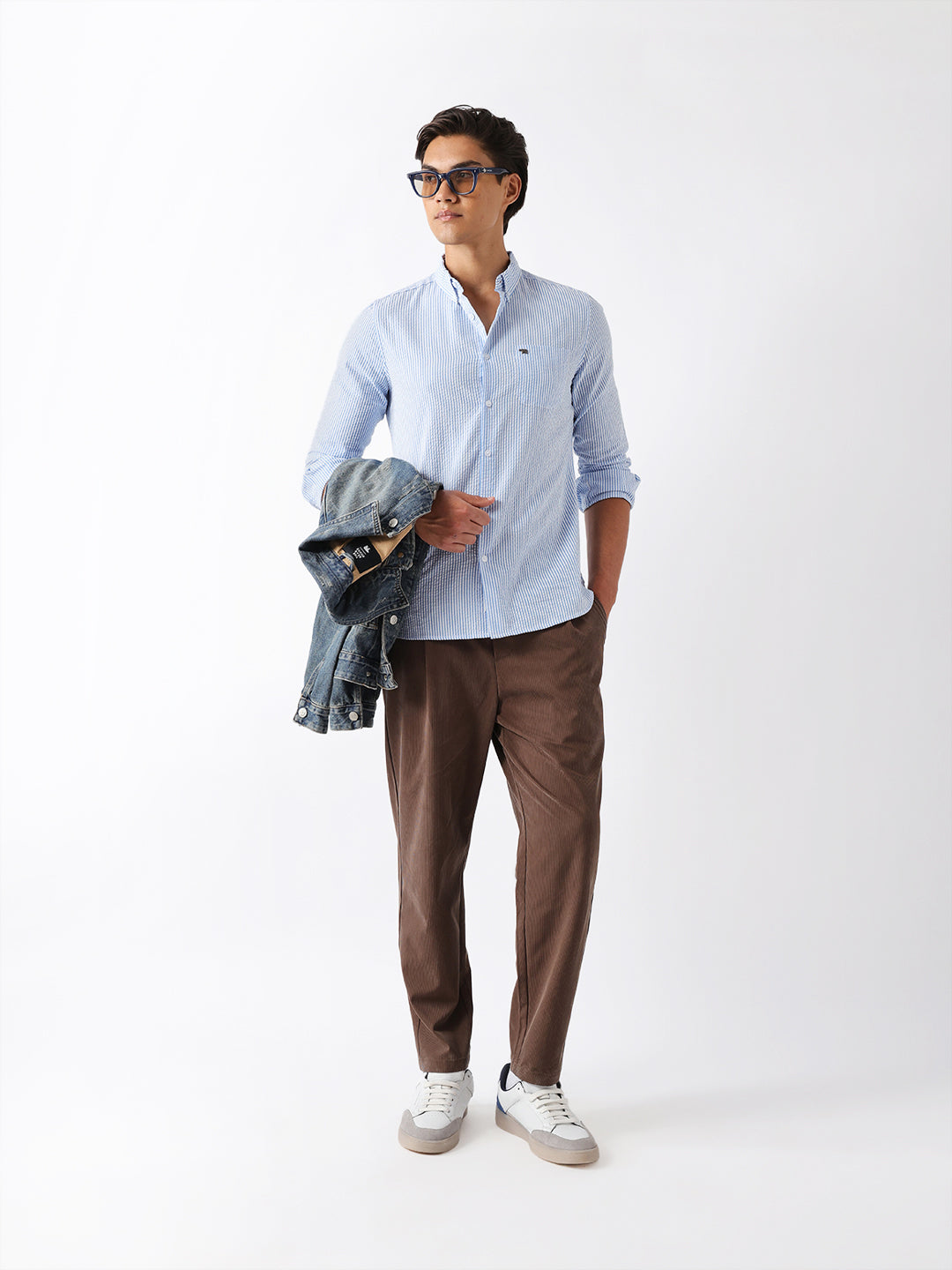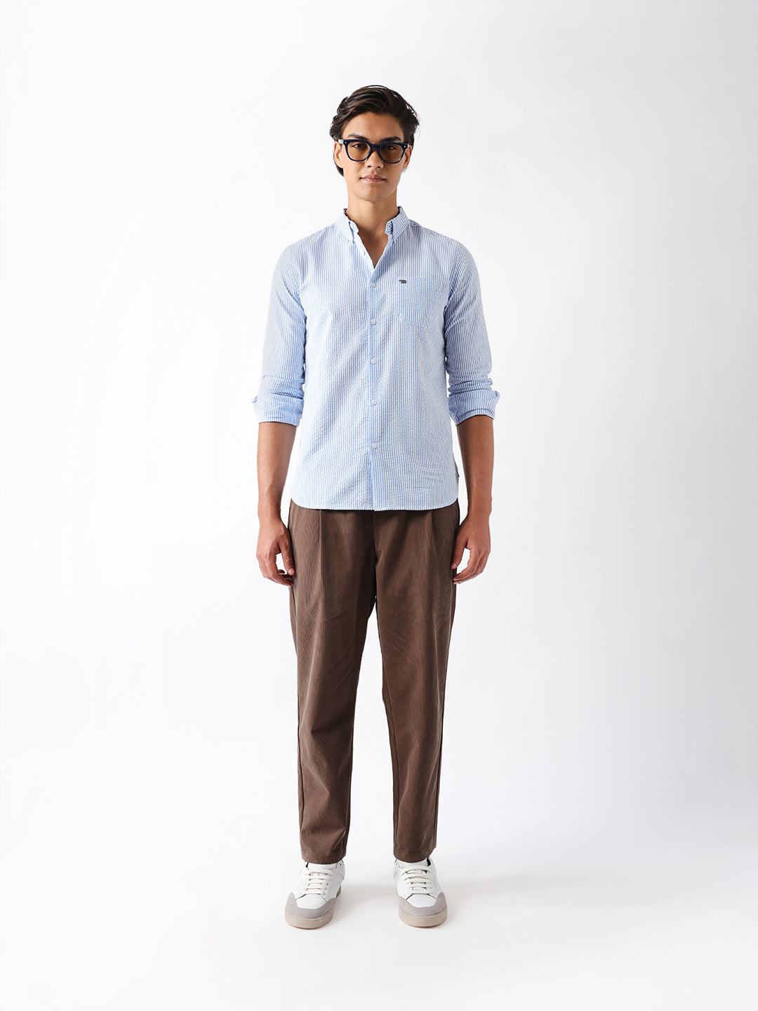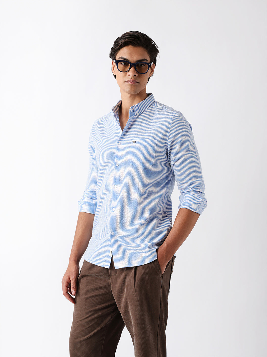 - Pattern: Vertical seersucker pinstripe design with crinkled texture