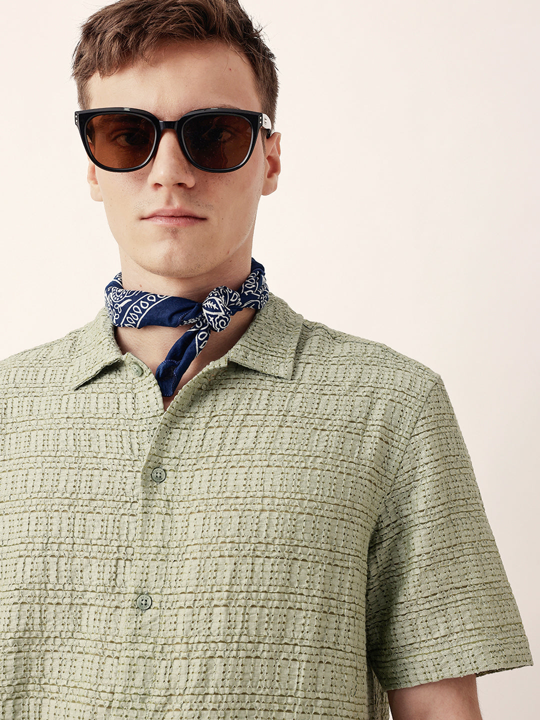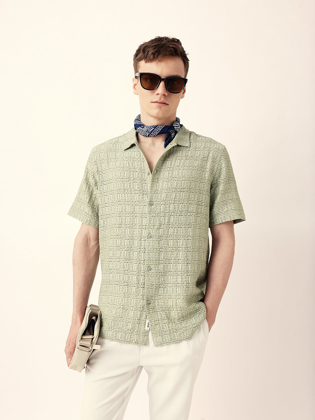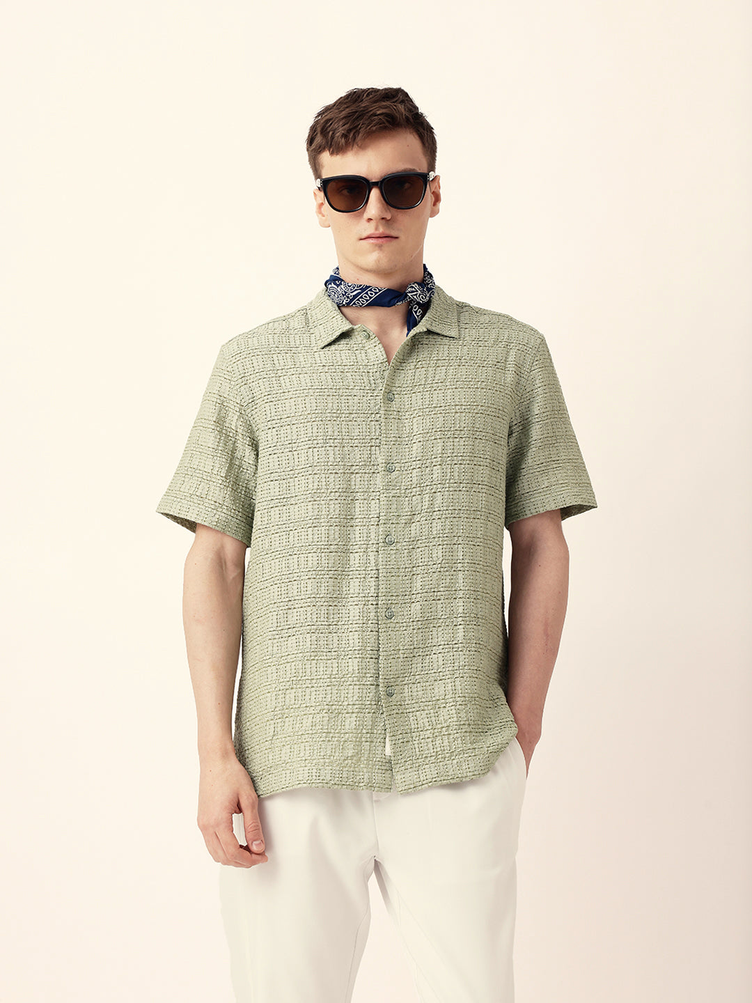 Light Green Textured Geometric Relaxed Fit Casual Half Sleeve Shirt