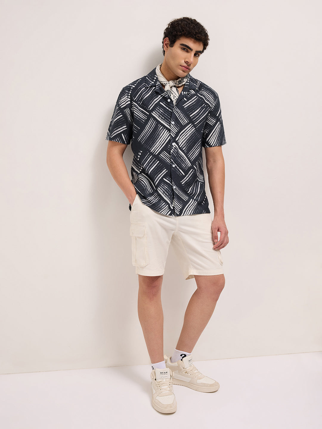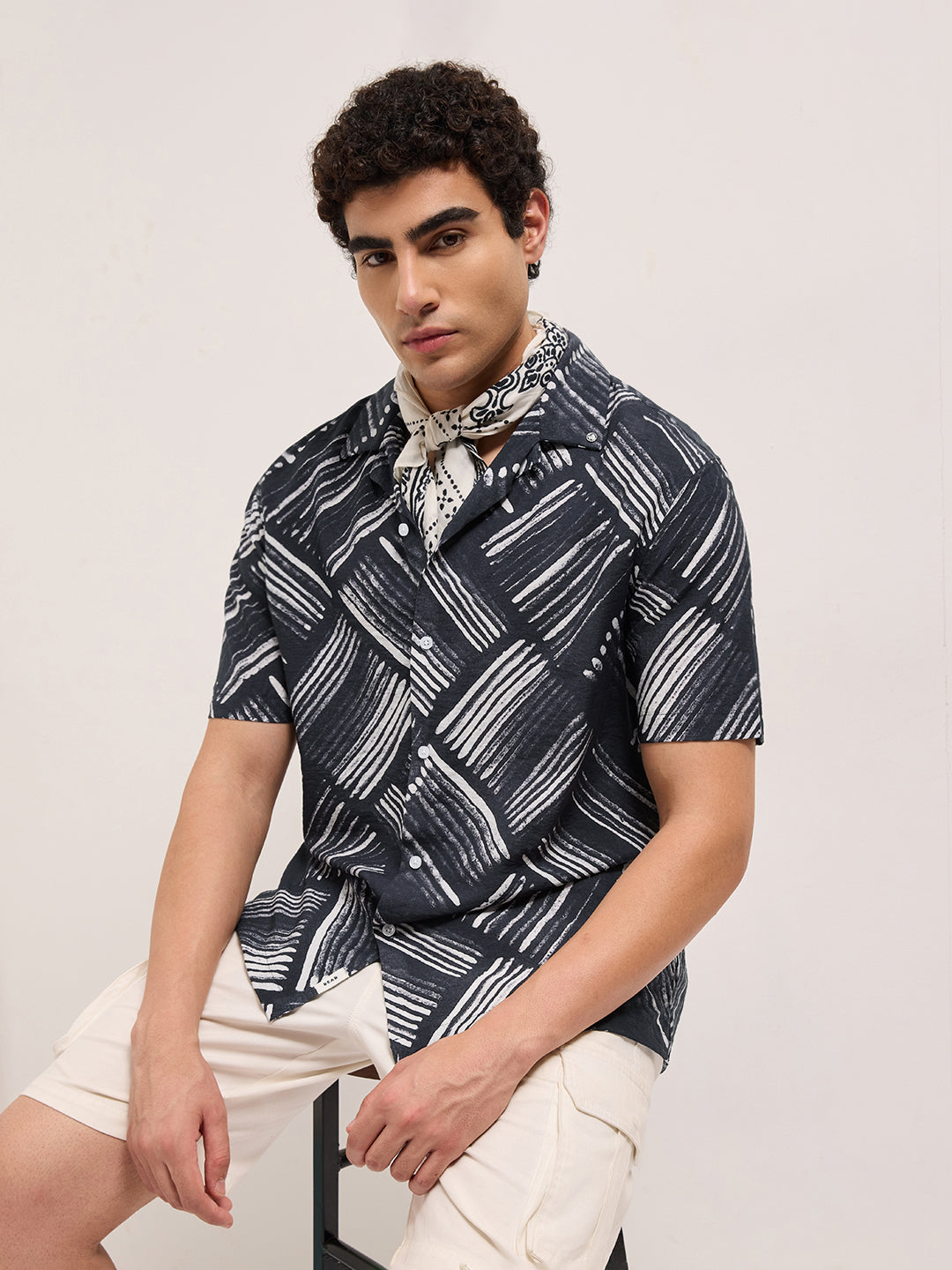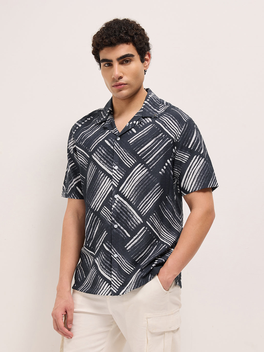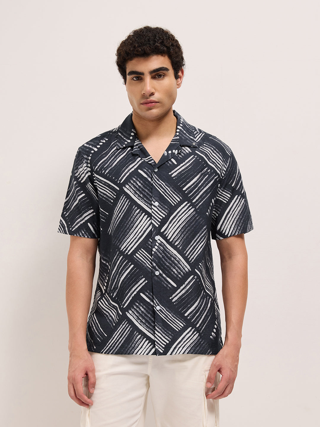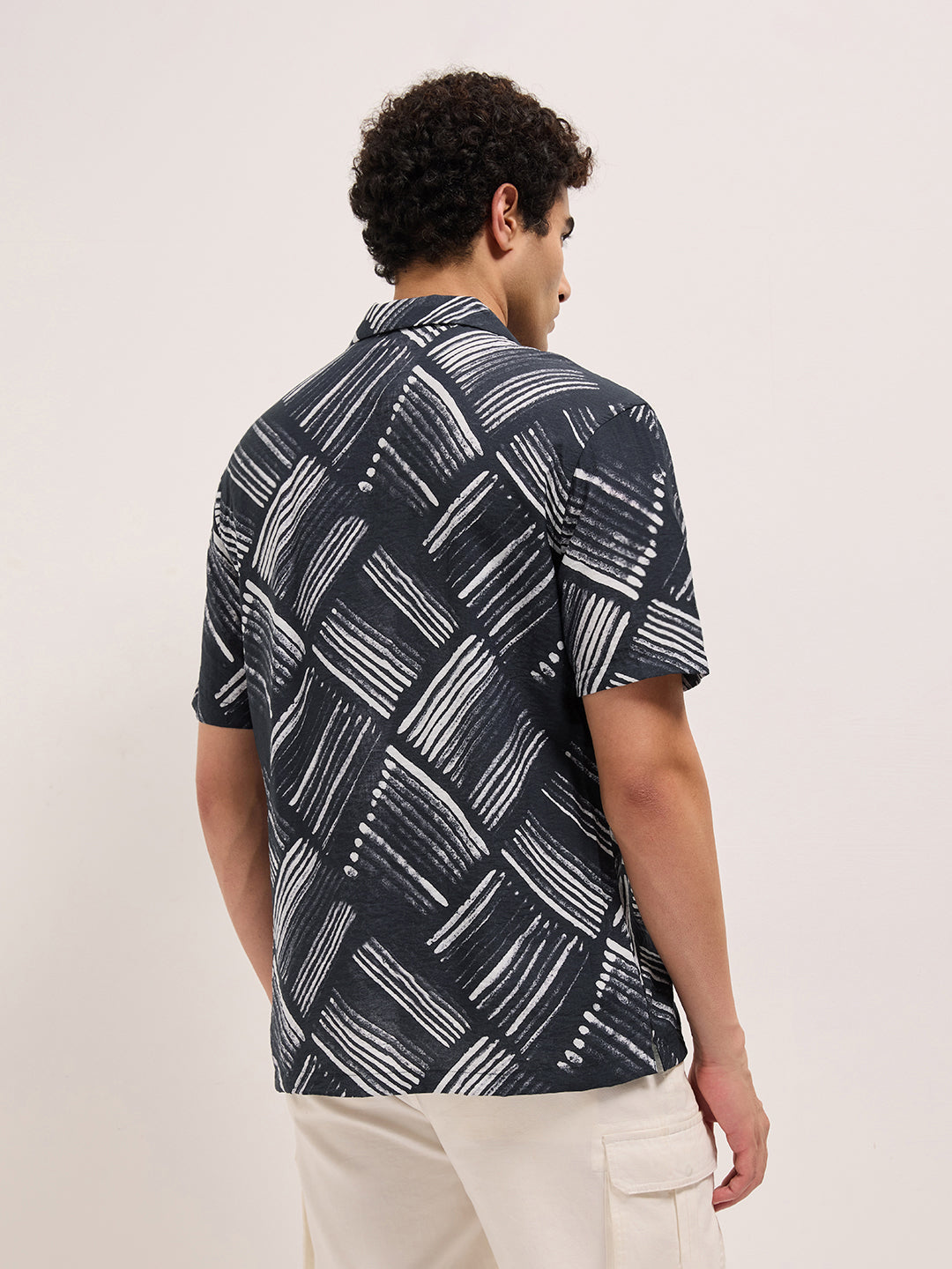 Black Abstract Brushstroke Printed Relaxed Fit Cuban Collar Casual Shirt