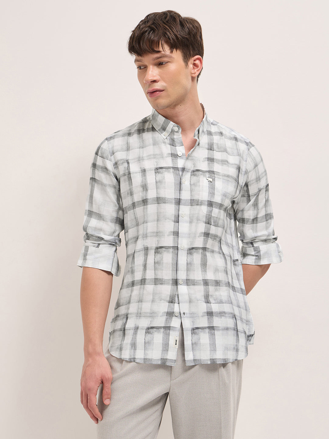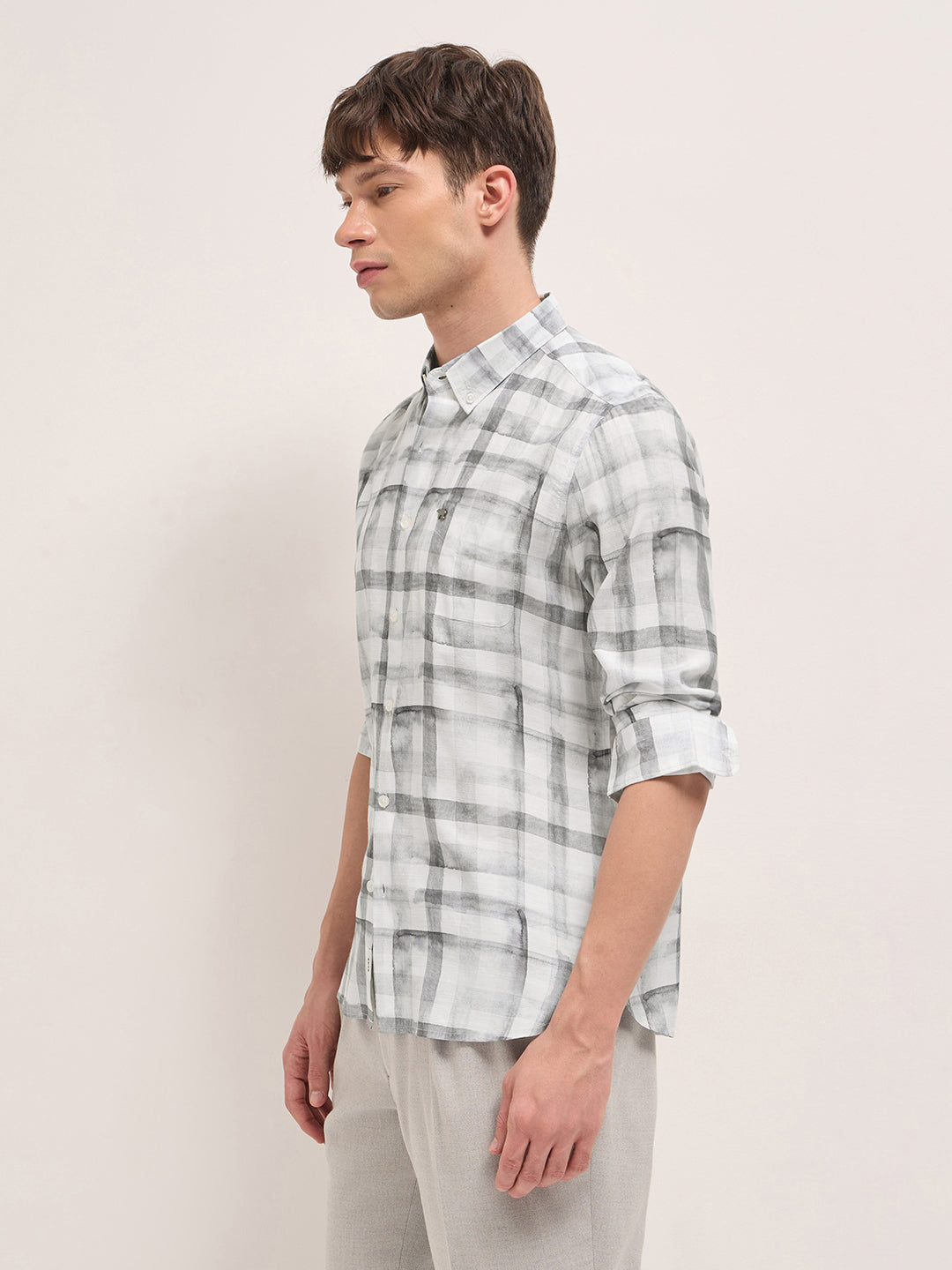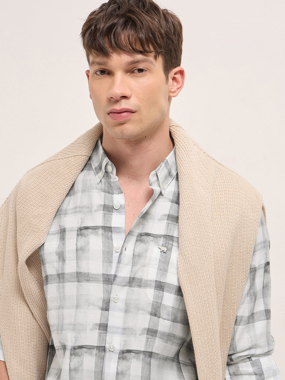 Grey & White Slim Fit Casual Shirt with Printed Checks