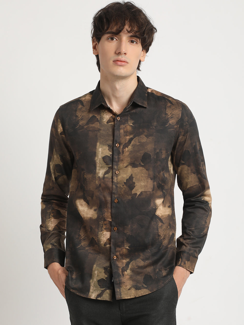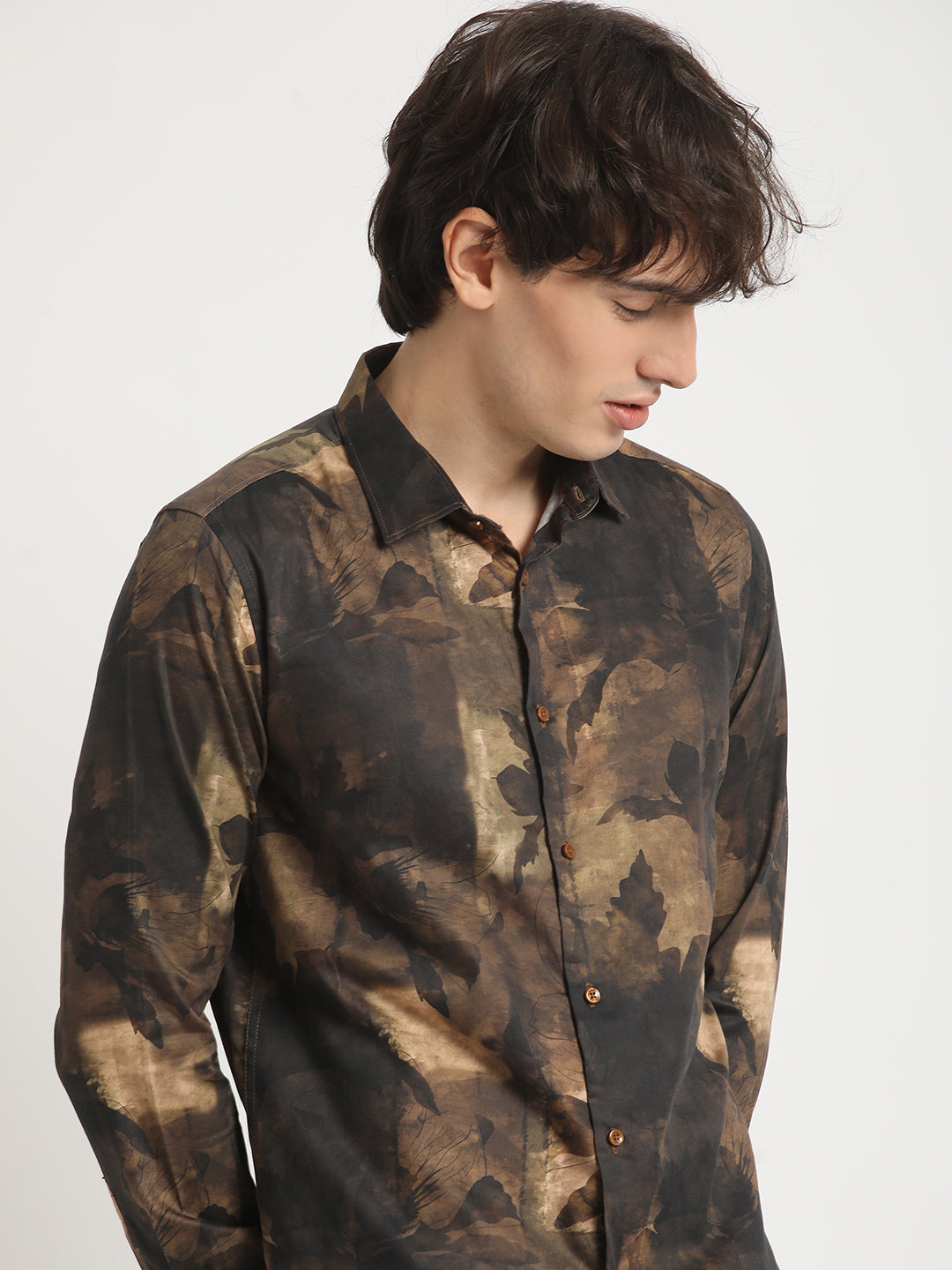 Shop Men's Brown Marble Swirl Pattern Long-Sleeve Slim Fit Casual Shirt Online