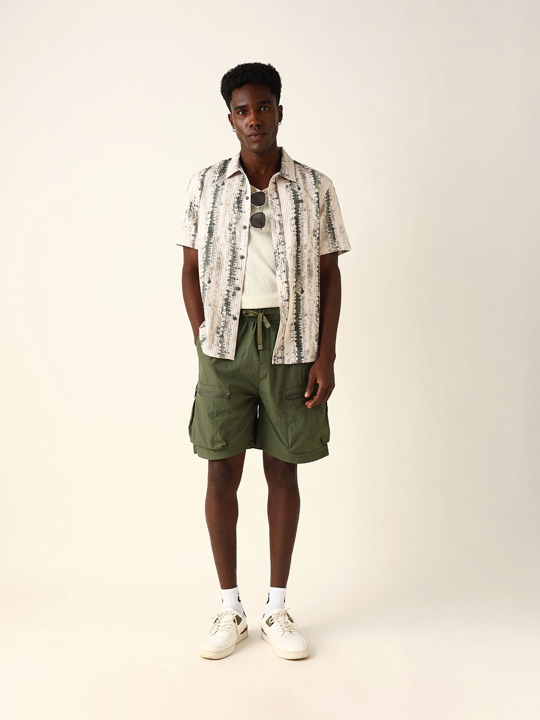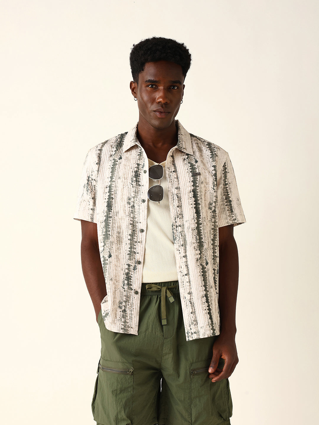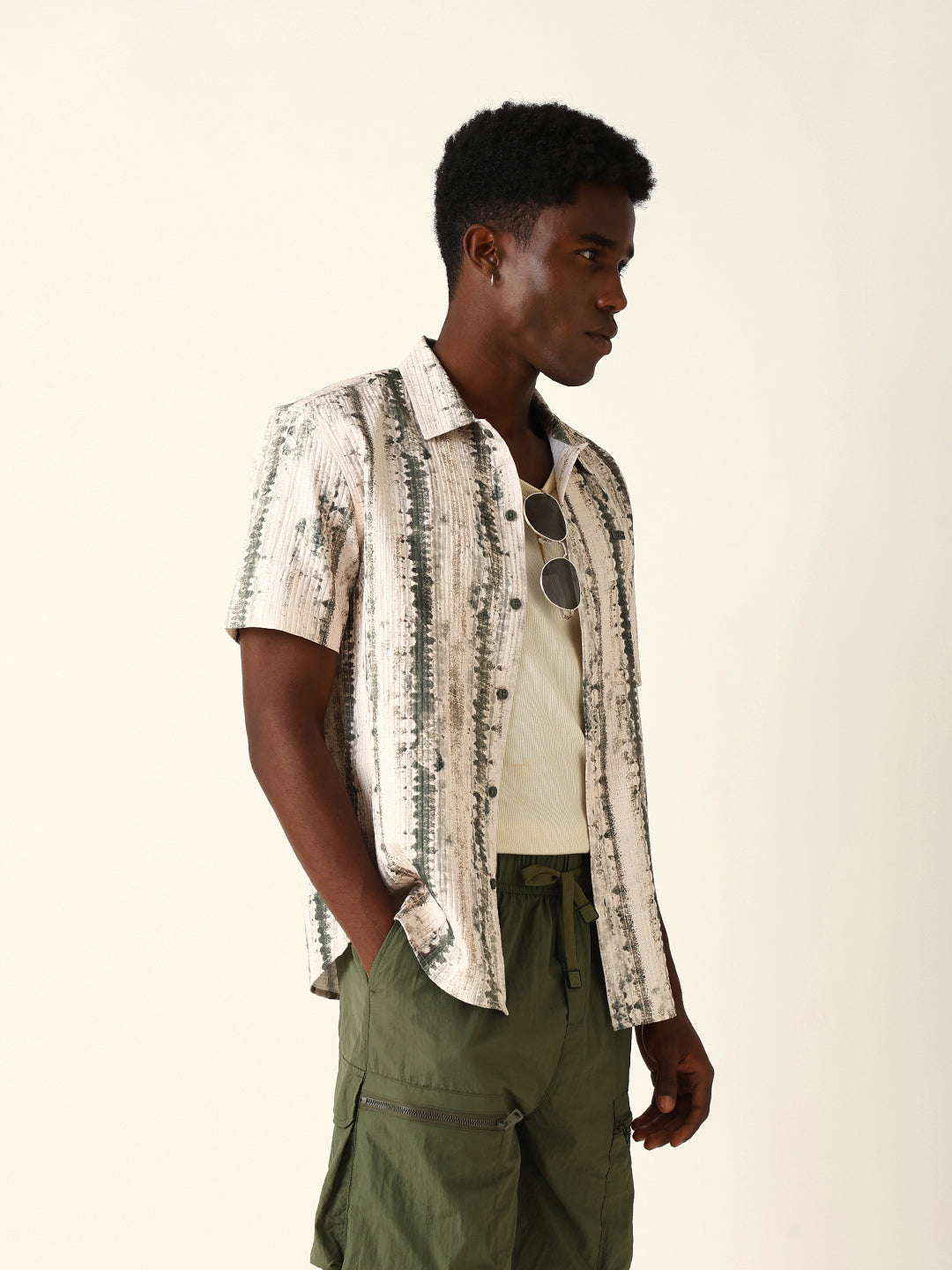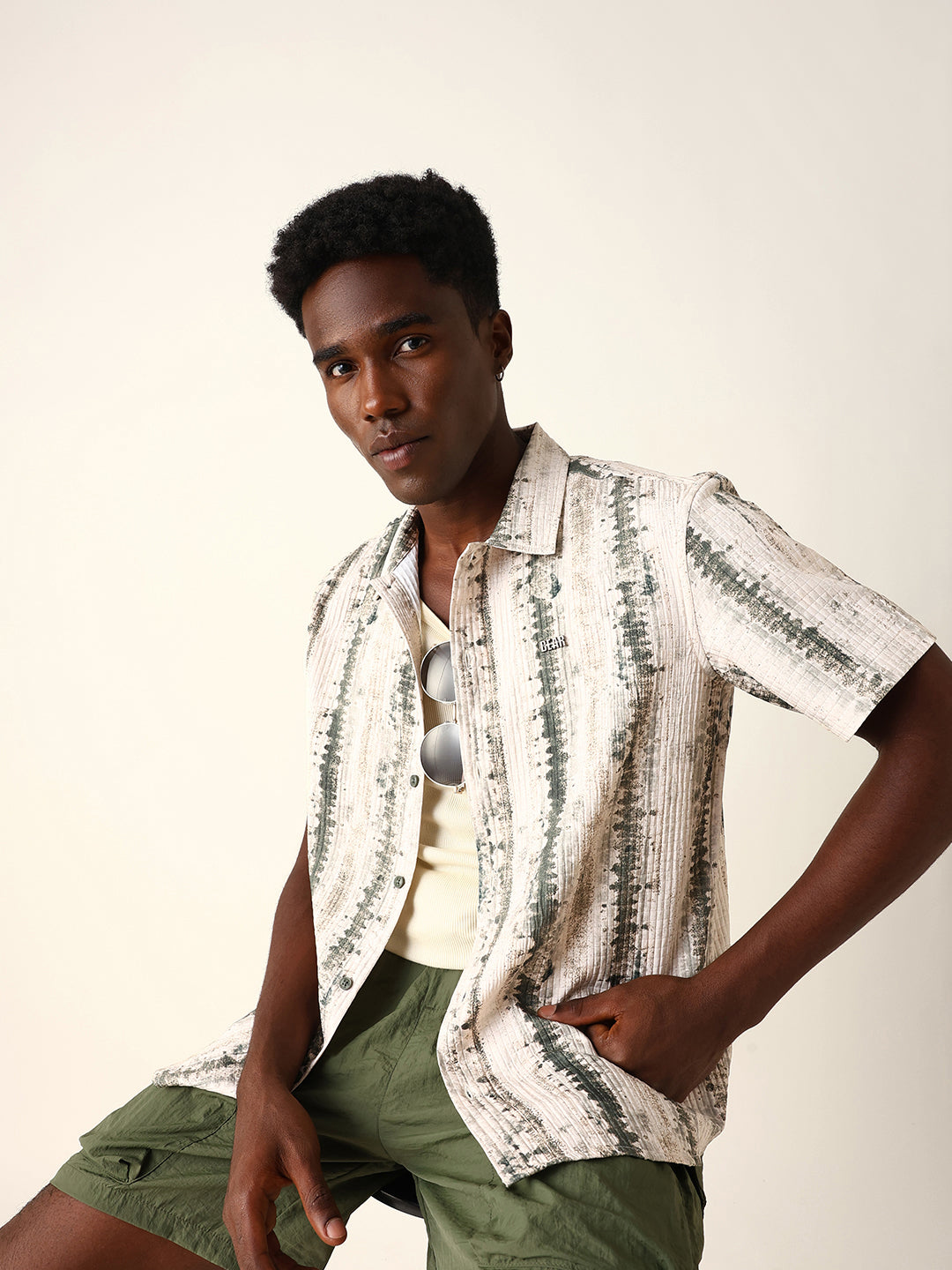Beige & Olive Abstract Textured Printed Relaxed Fit Casual Shirt