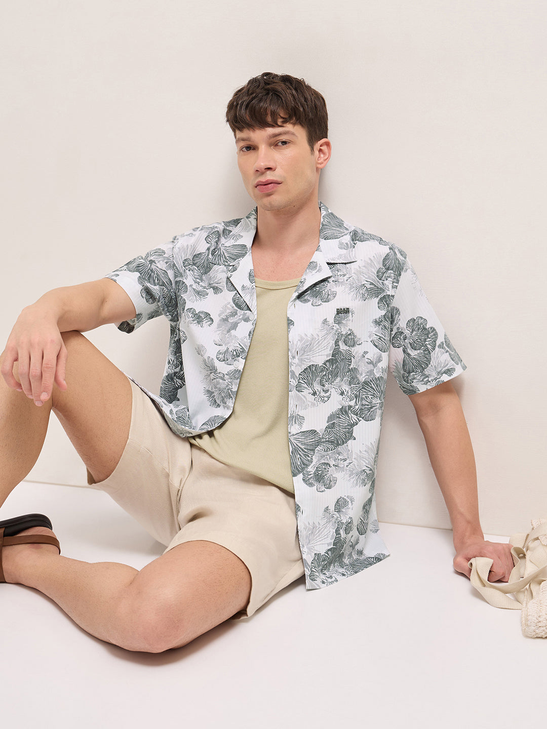 Shop White Tropical Floral Print Relaxed Fit Cuban Collar Shirt Online.