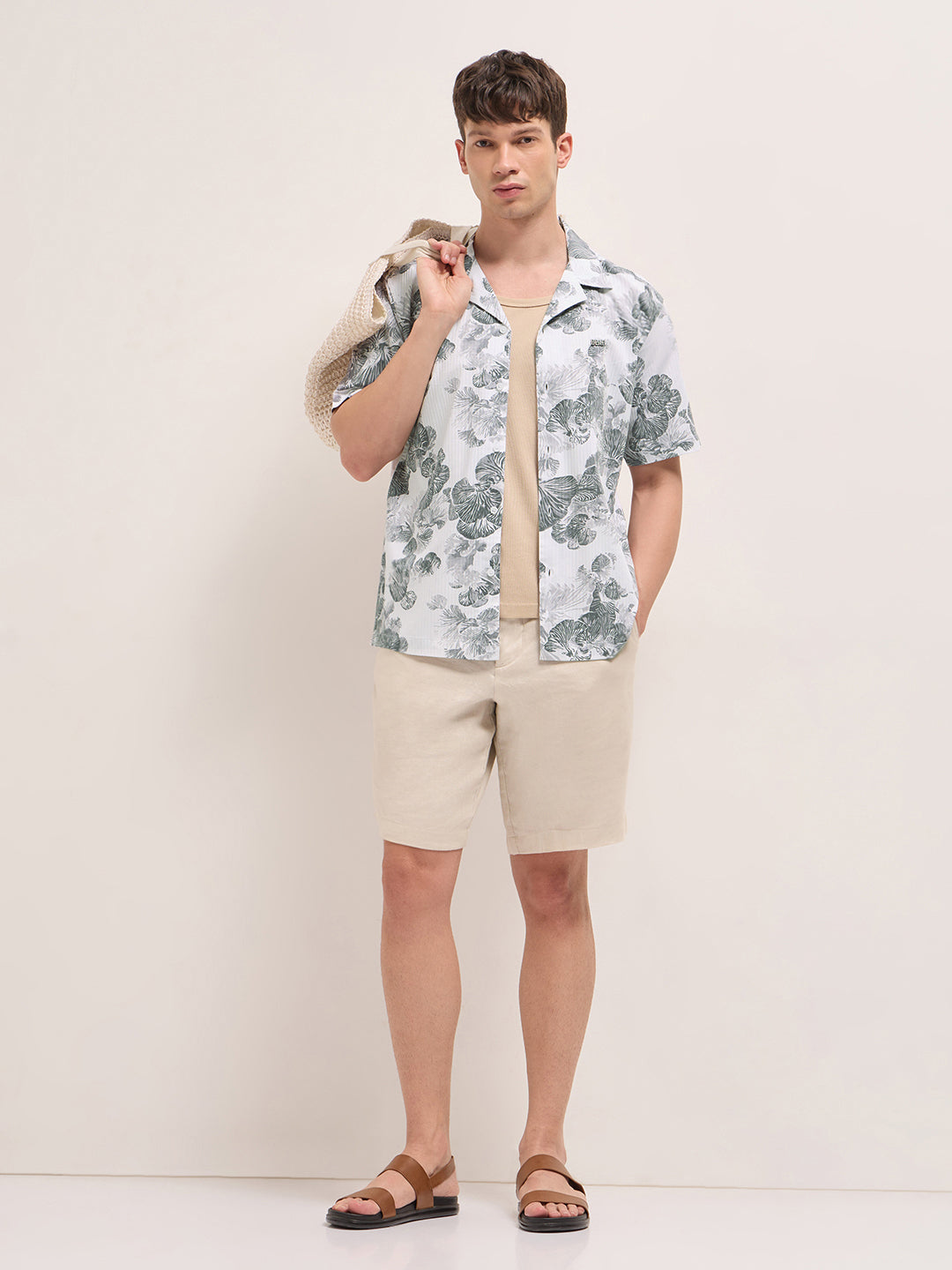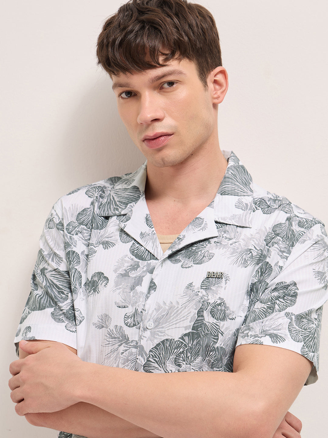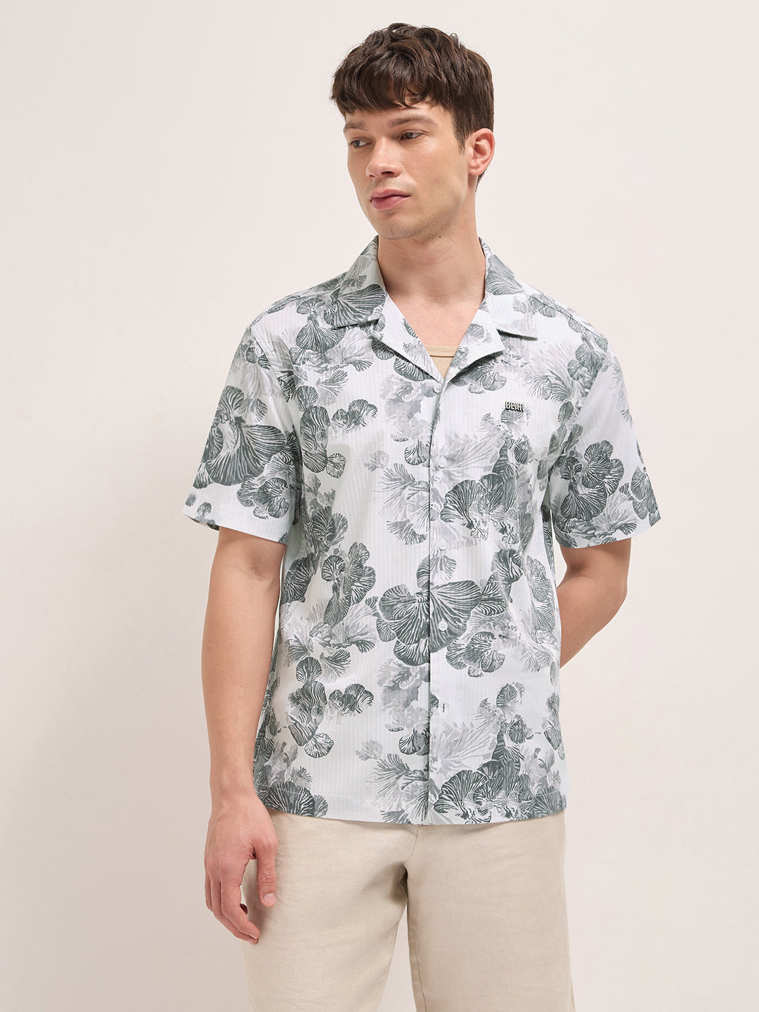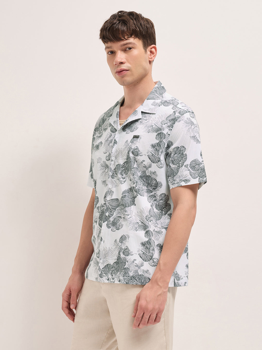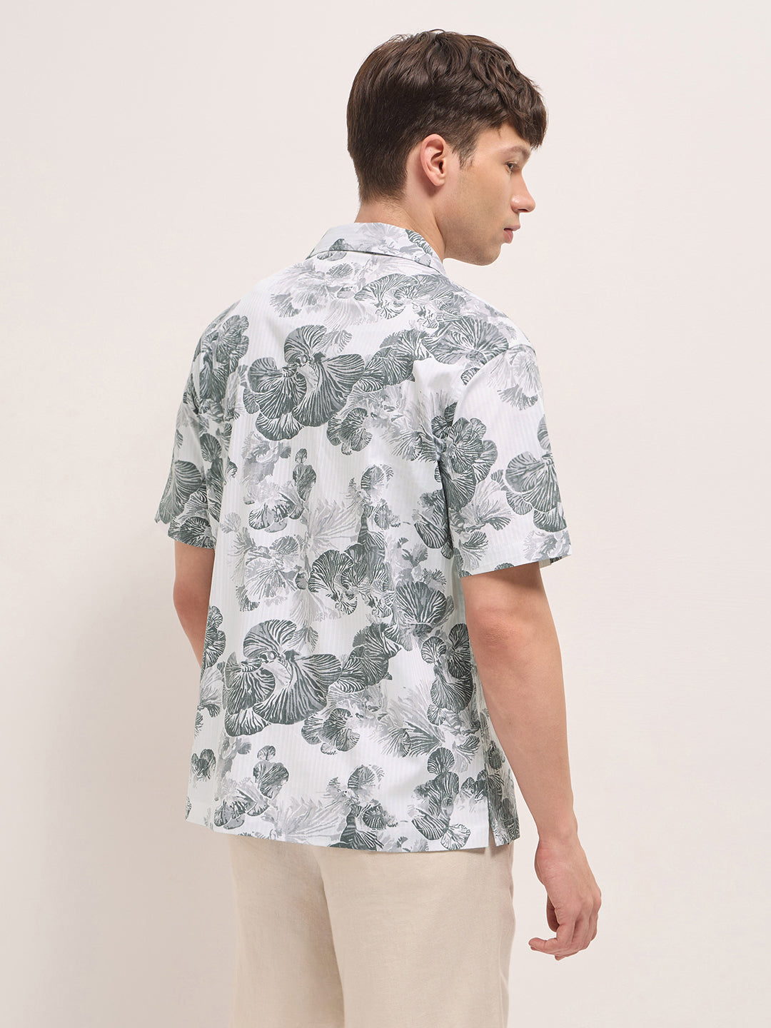 White Tropical Floral Print Relaxed Fit Cuban Collar Shirt