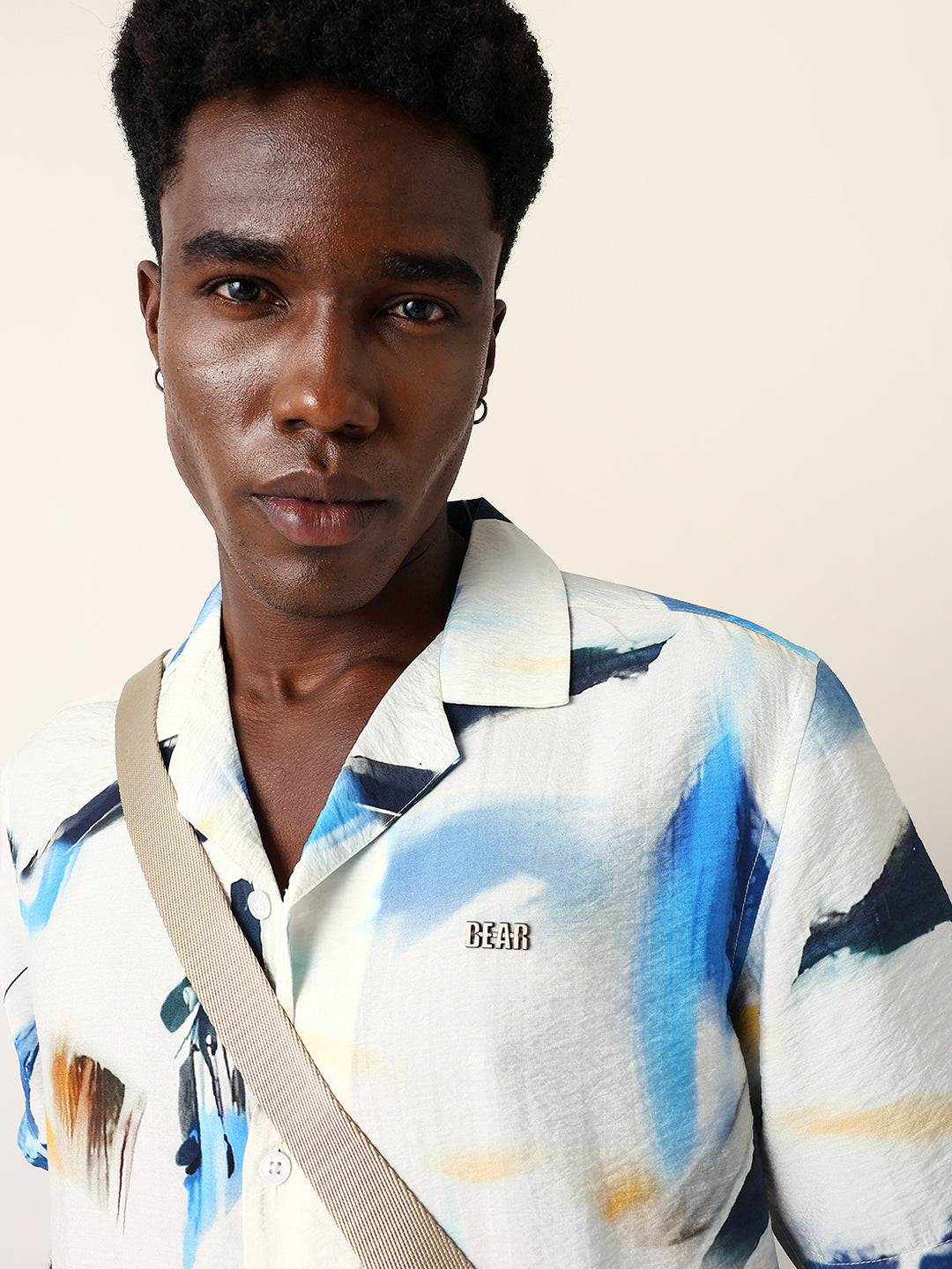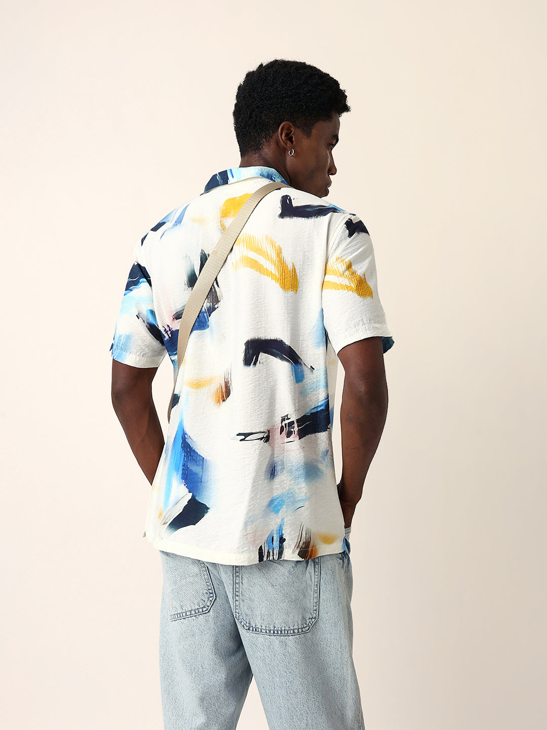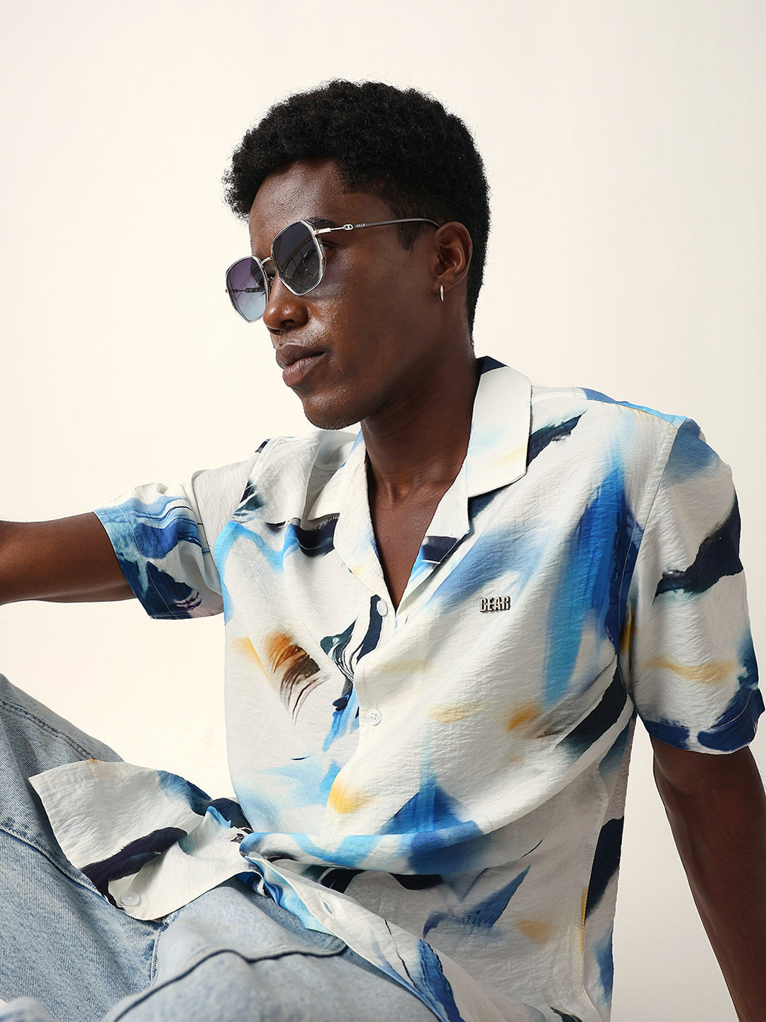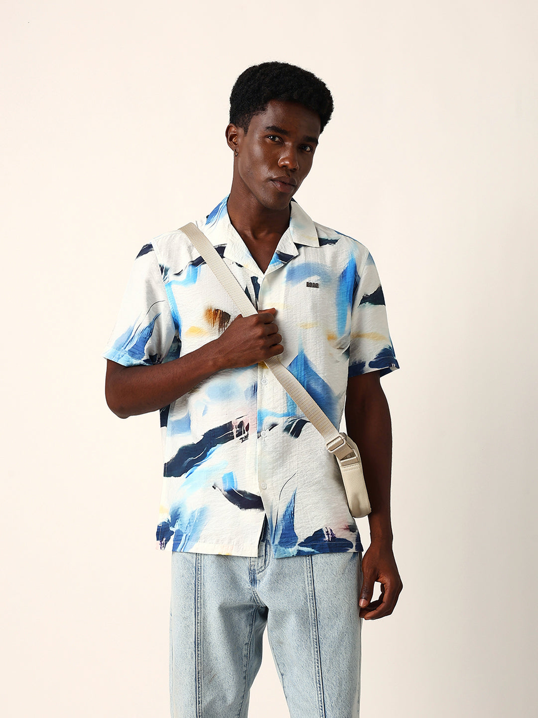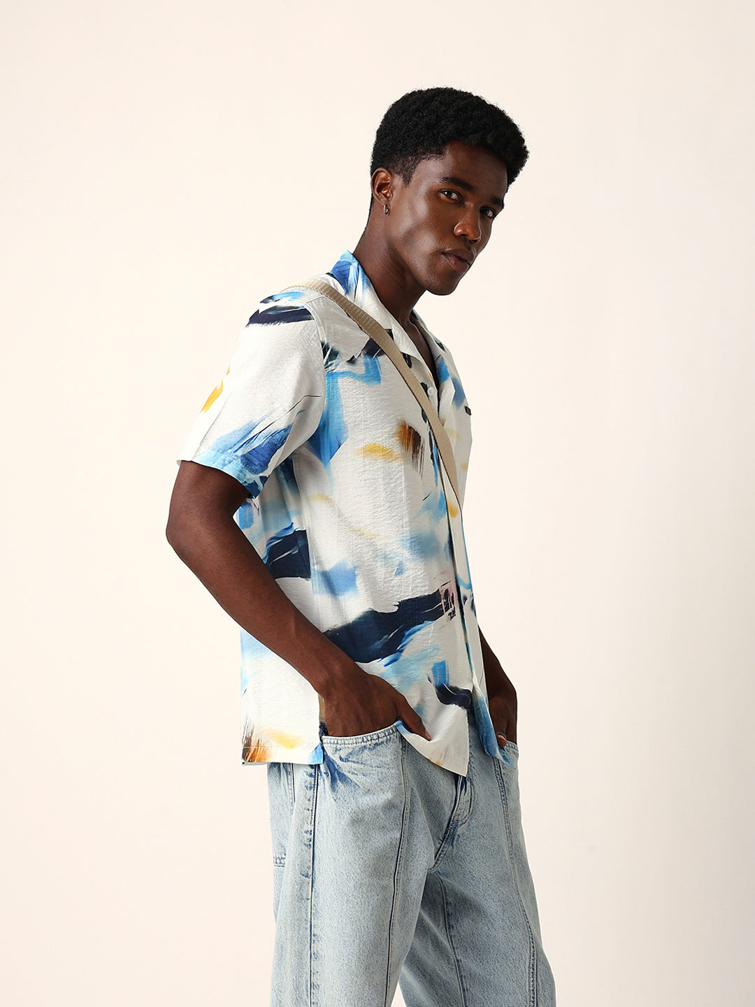 Shop White & Blue Abstract Watercolor Printed Relaxed Fit Short Sleeve Shirt Online.