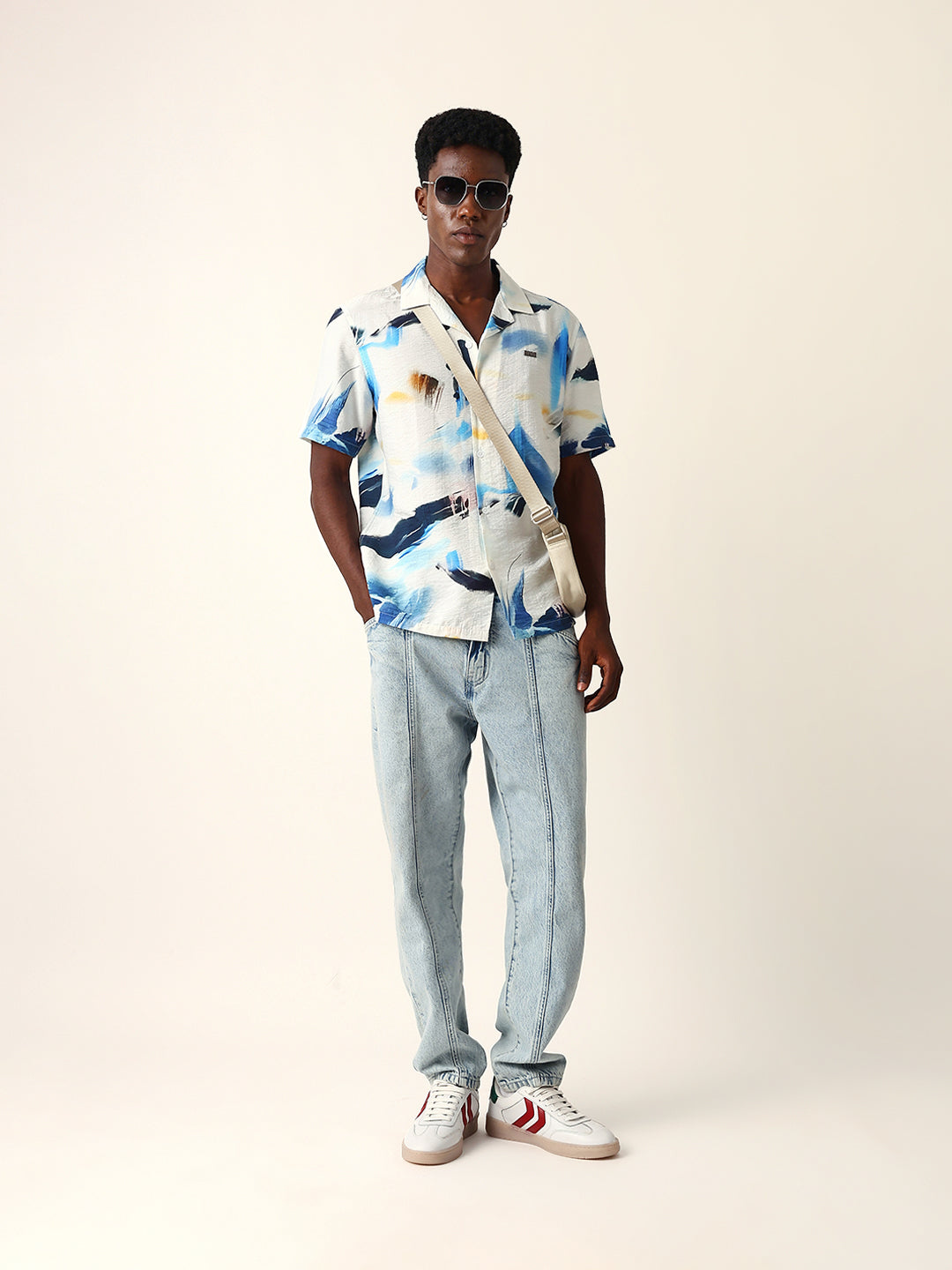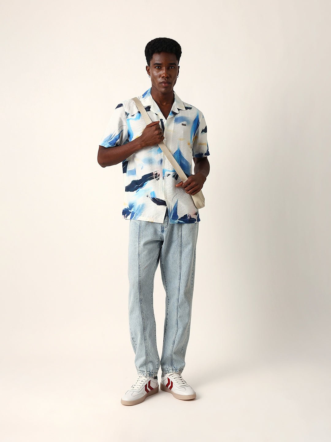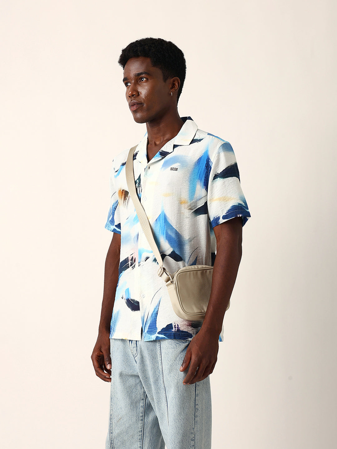 White & Blue Abstract Watercolor Printed Relaxed Fit Short Sleeve Shirt