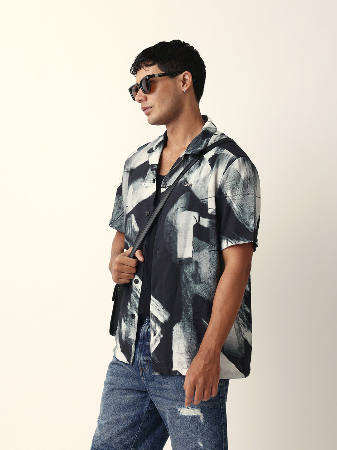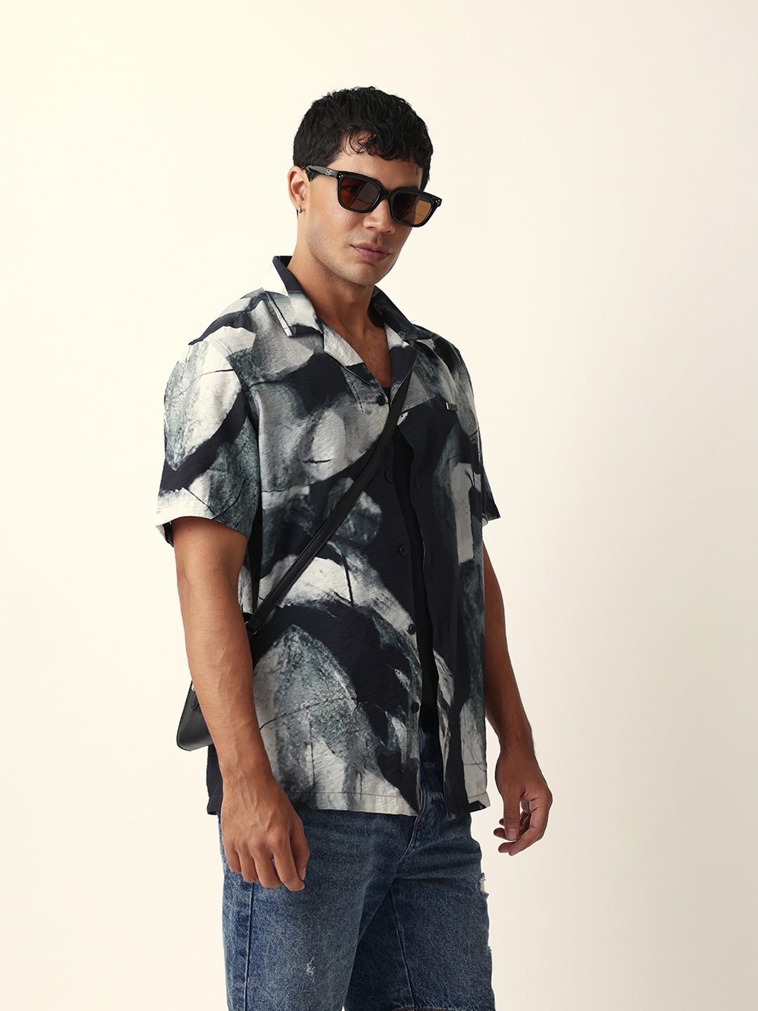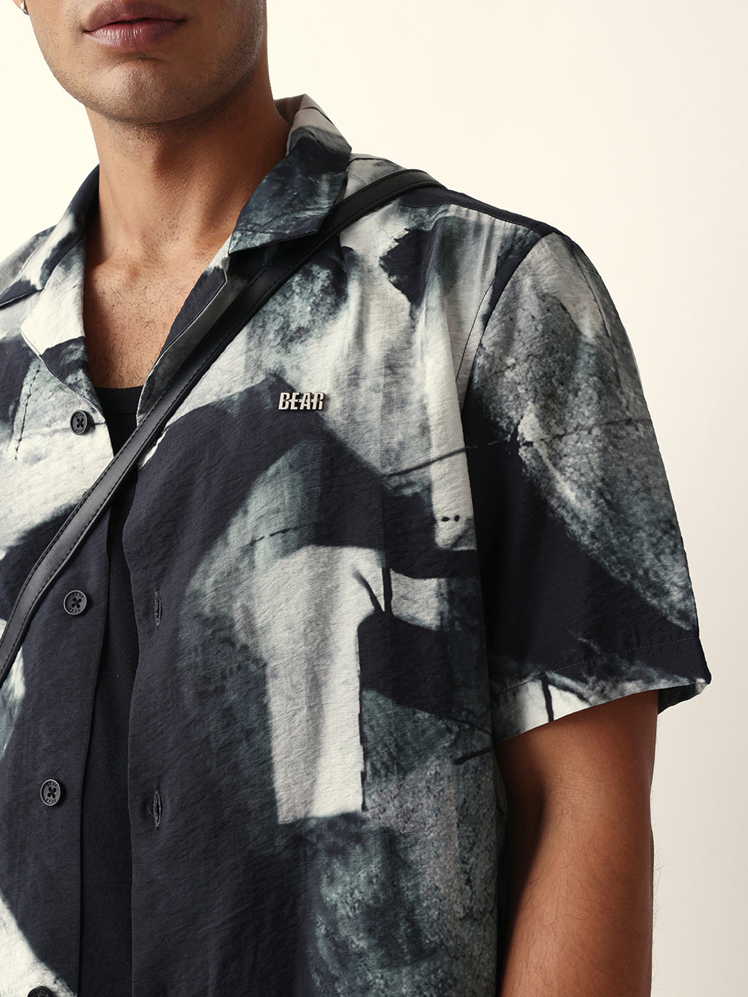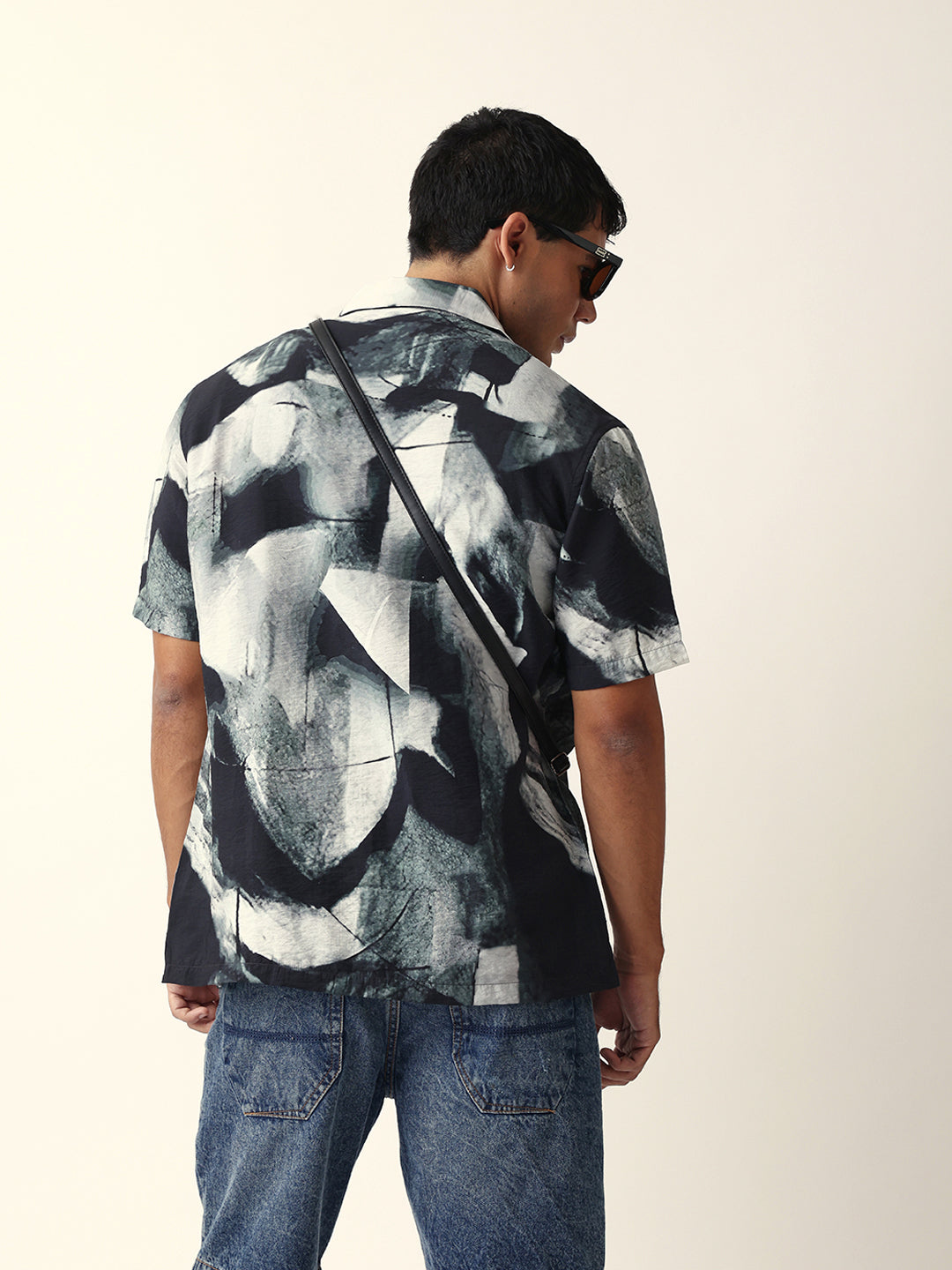 Shop Black & Grey Relaxed Fit Abstract Brushstroke Print Half Sleeve Casual Shirt Online.