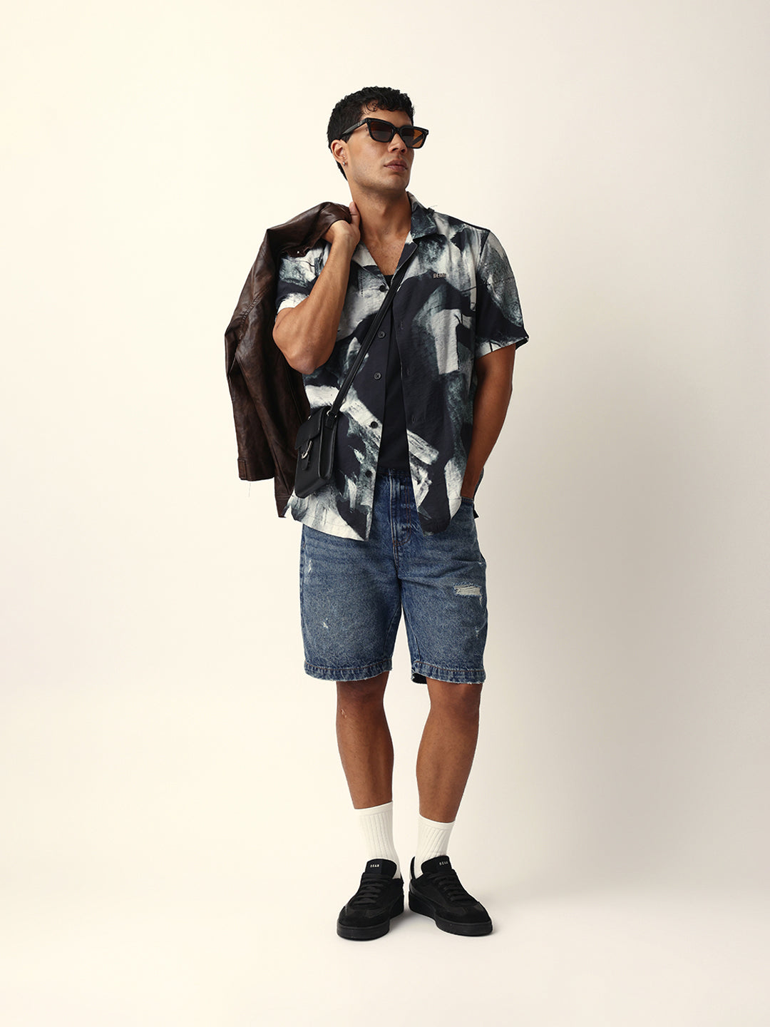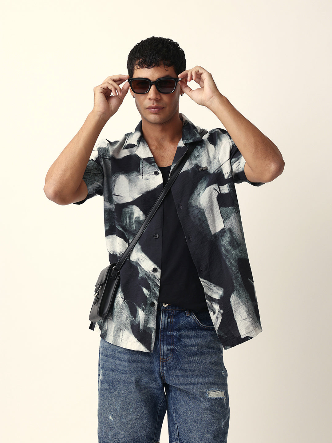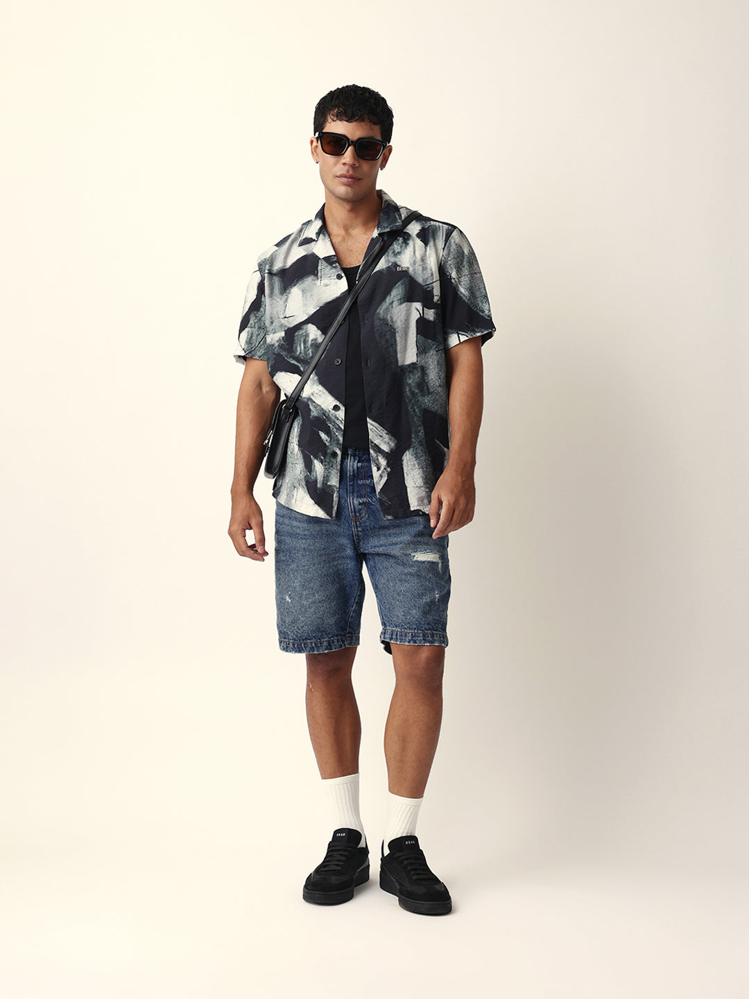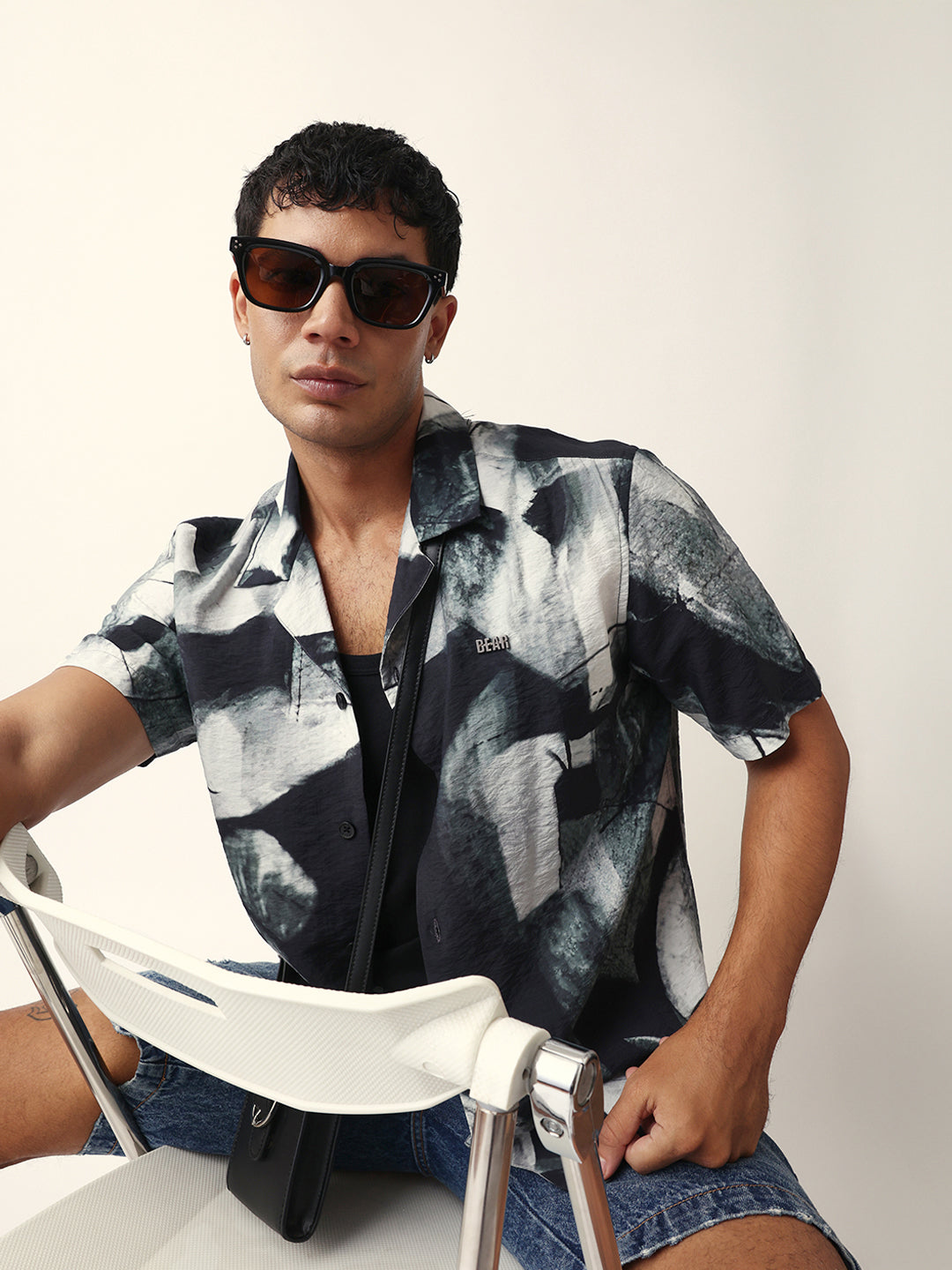 Shop Black & Grey Relaxed Fit Abstract Brushstroke Print Half Sleeve Casual Shirt Online.