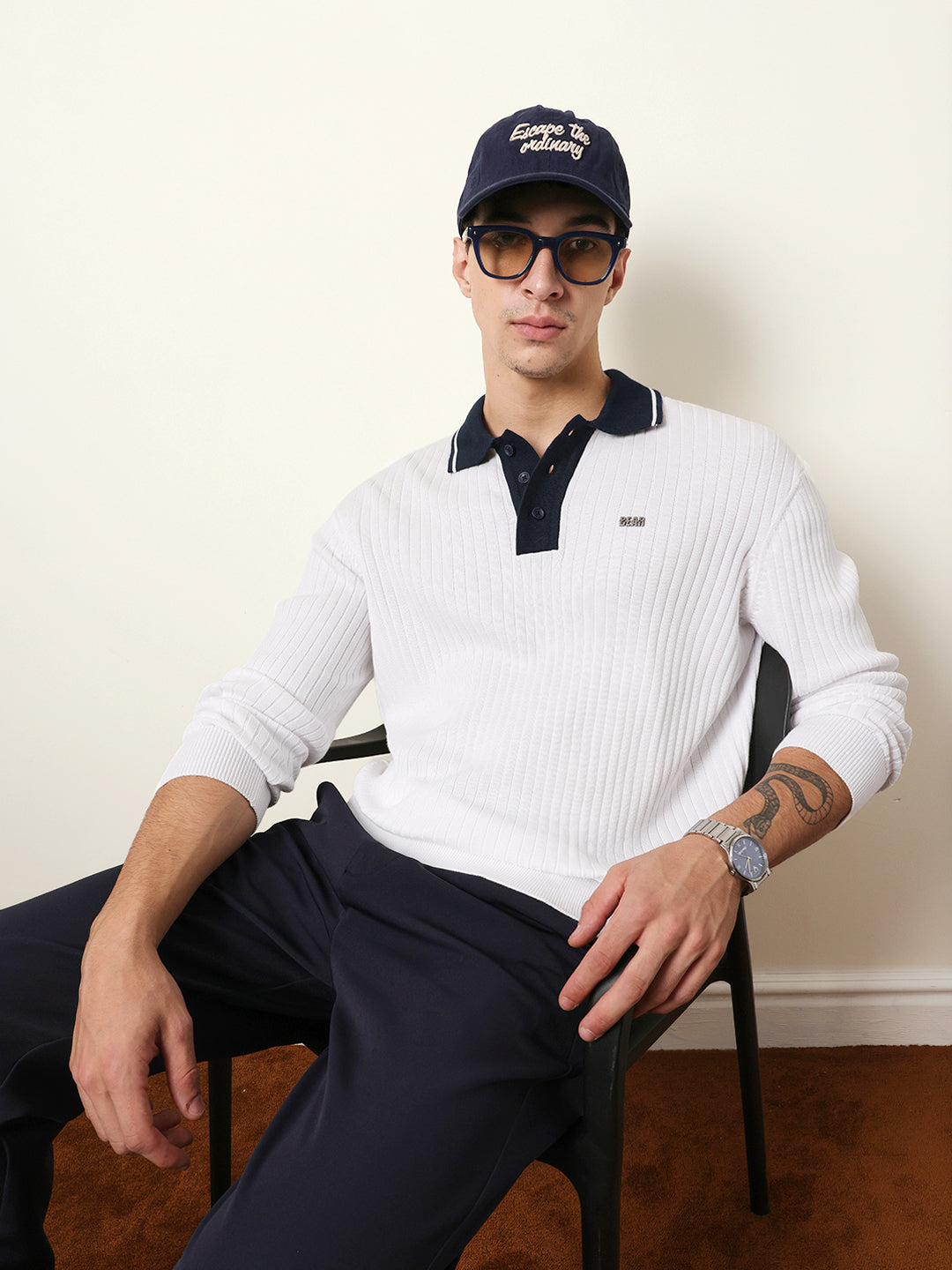 • Collar: Contrast Blue polo collar with a half-button placket