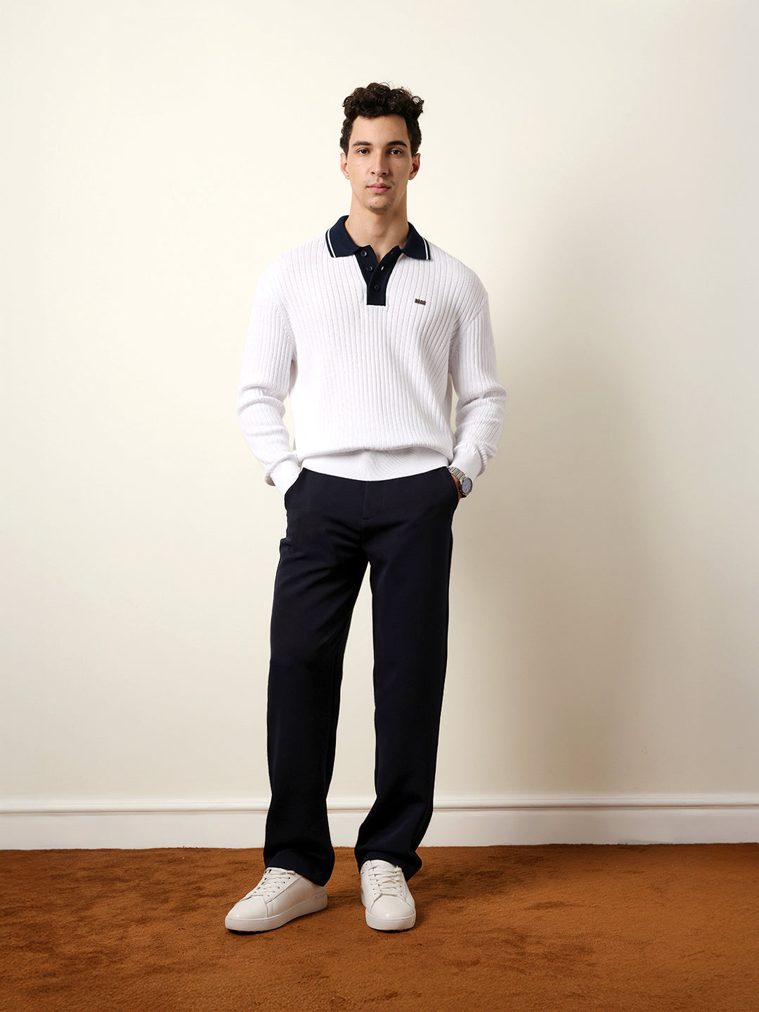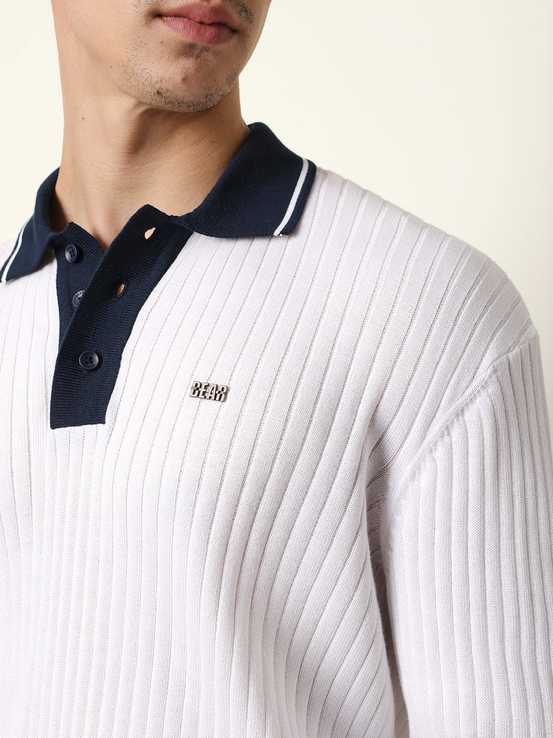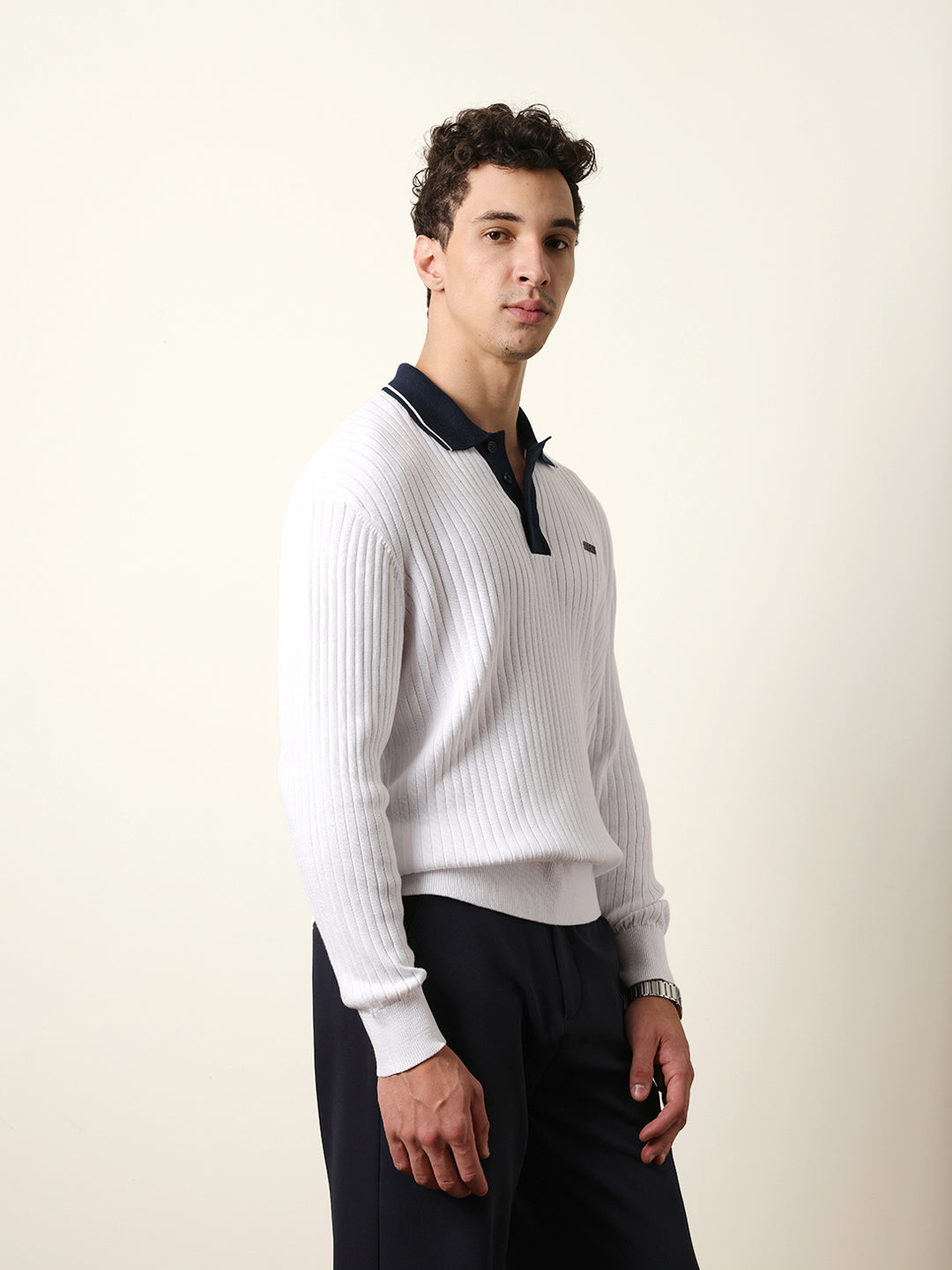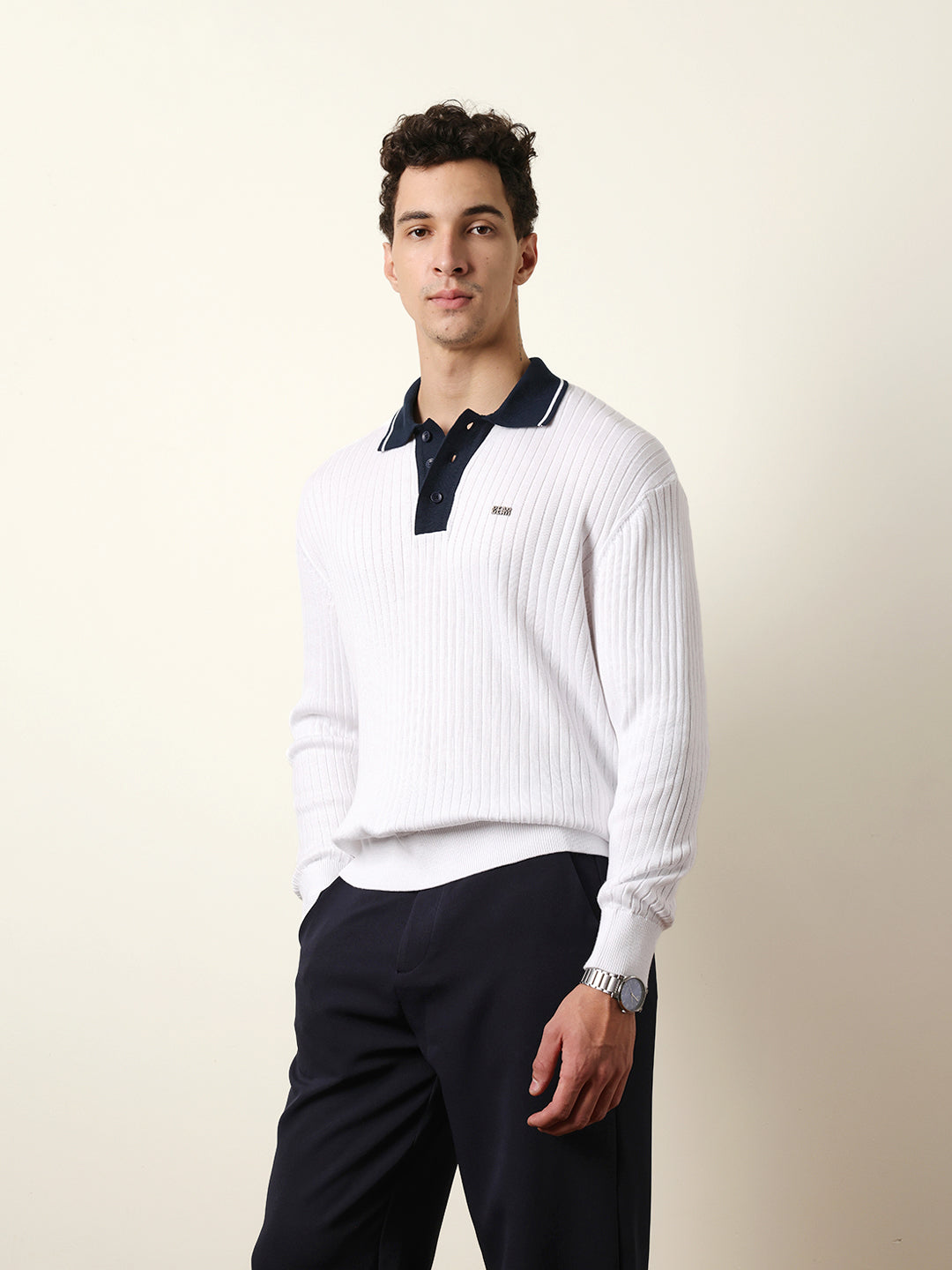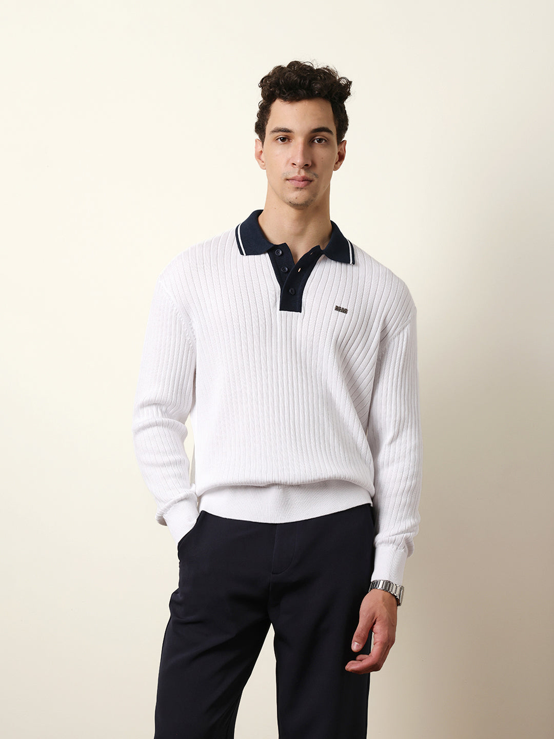Shop White Relaxed Fit Contrast Collar Long Sleeve Polo with Ribbed Hem & Cuffs Online.