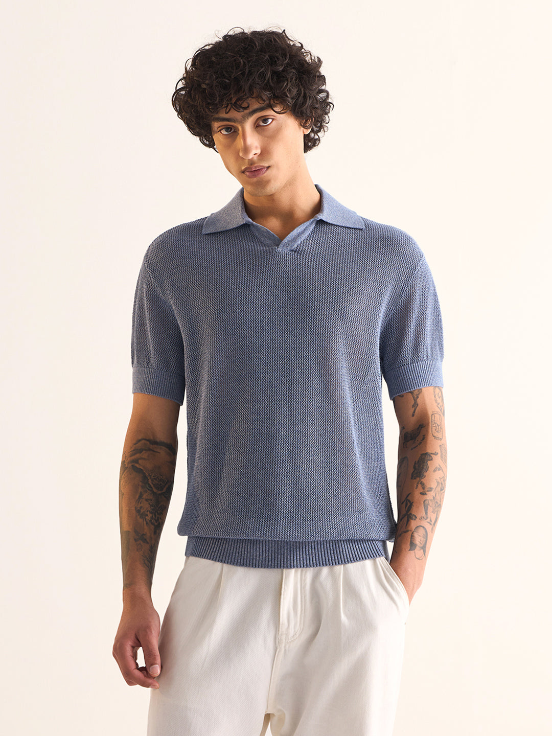 Blue Textured Knit Polo Regular Fit with V-Notch Placket & Semi-Transparent Effect