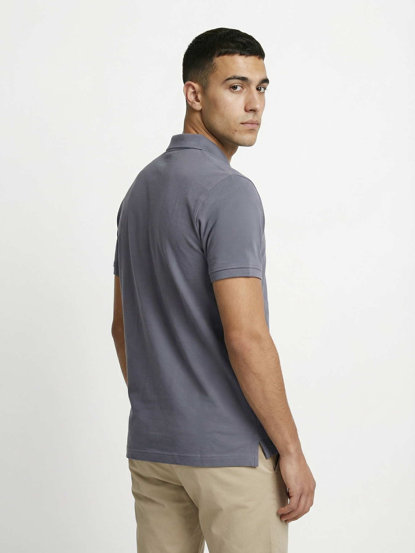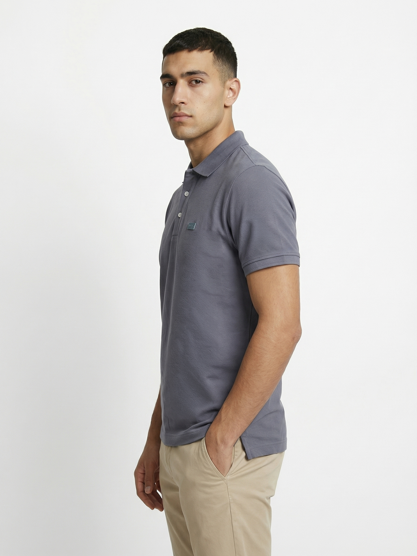 - Placket: Classic polo button placket with 3-button closure