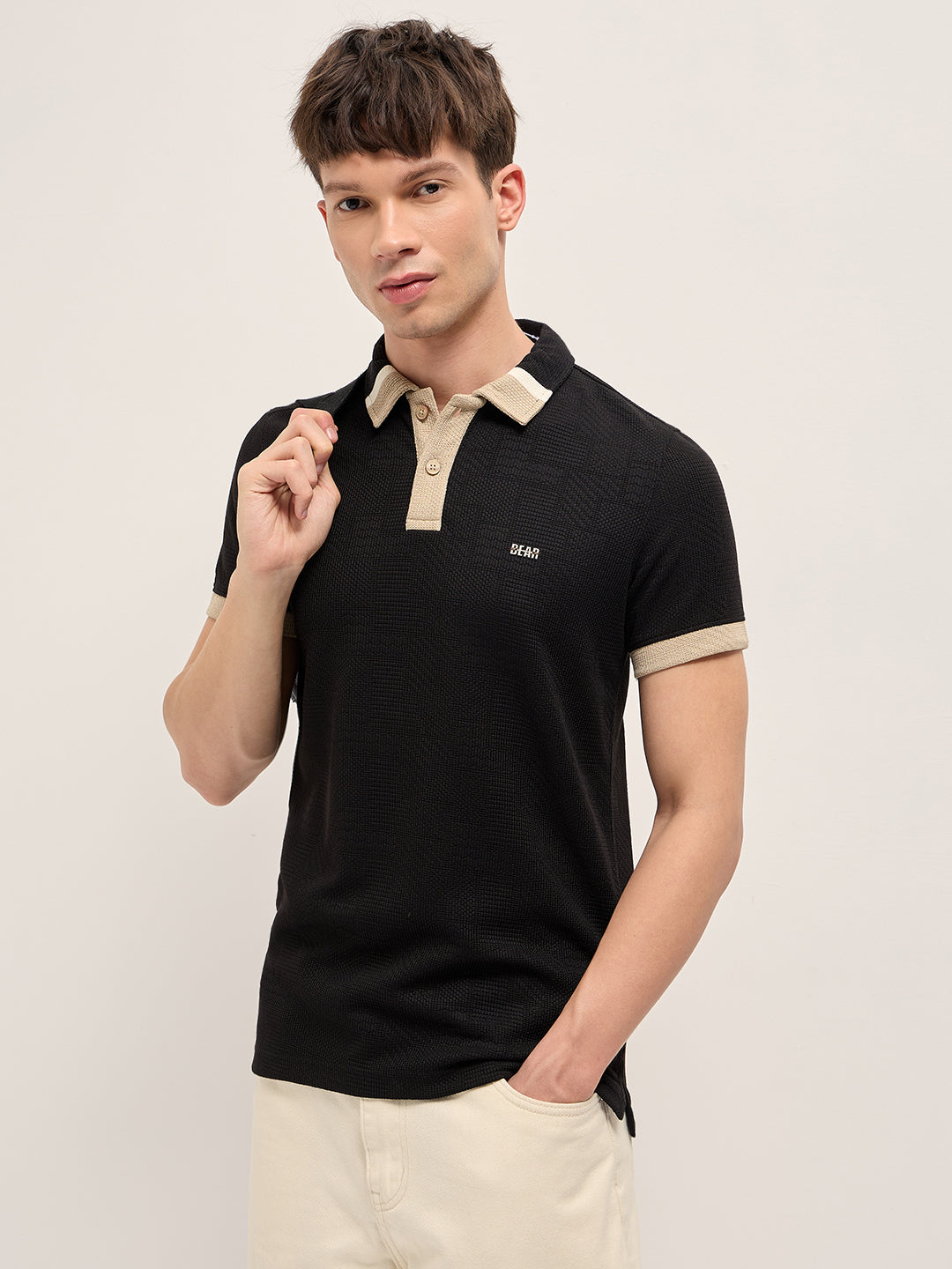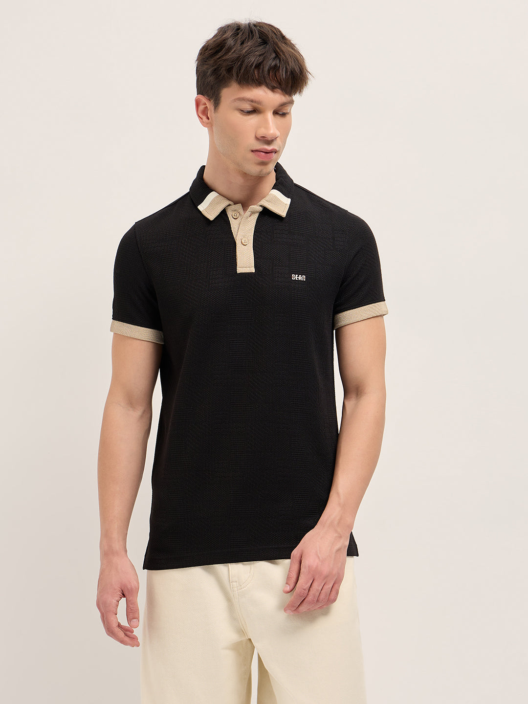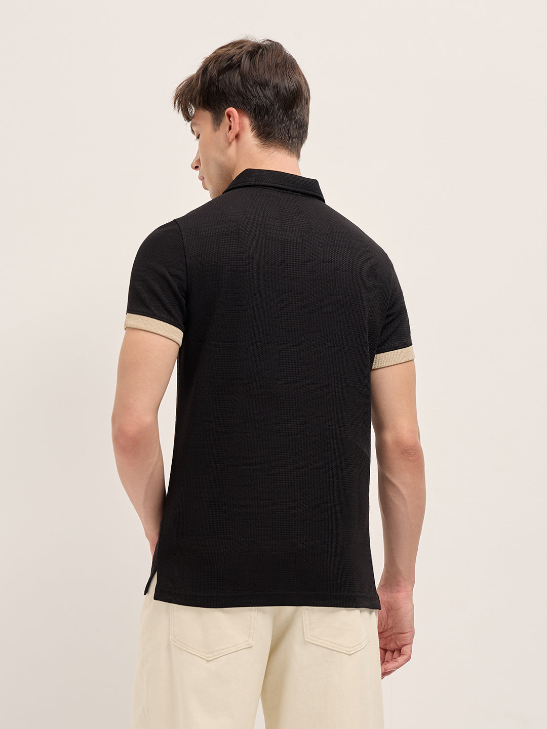 Black Geometric Textured Knit Slim Fit Polo with Contrast Collar and Cuff Detailing