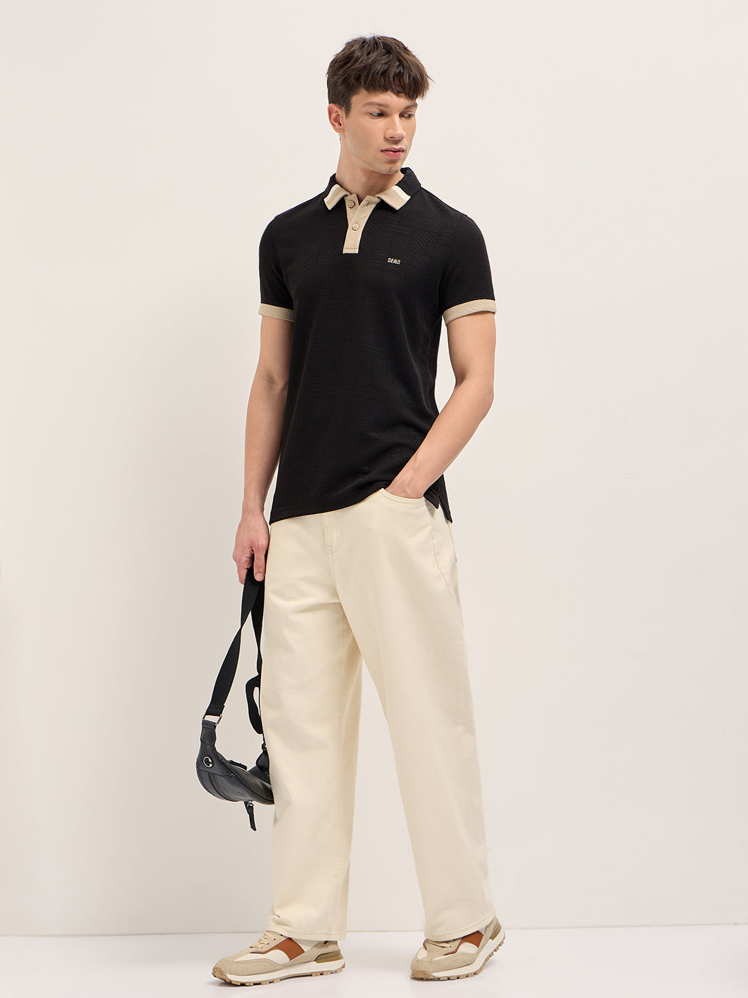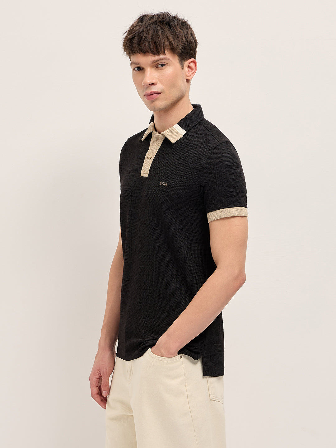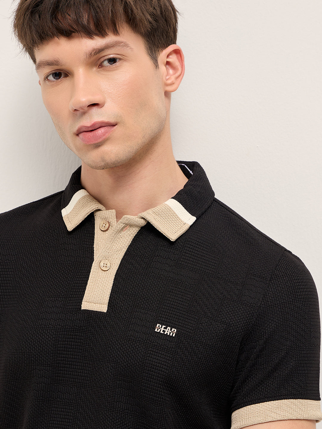 Black Geometric Textured Knit Slim Fit Polo with Contrast Collar and Cuff Detailing