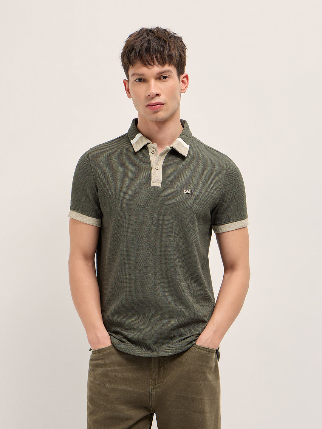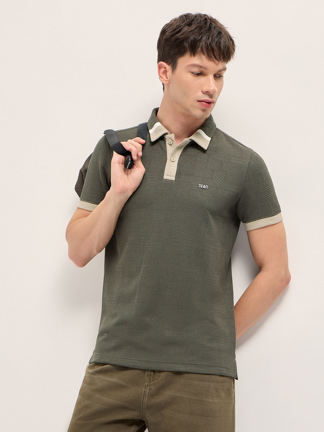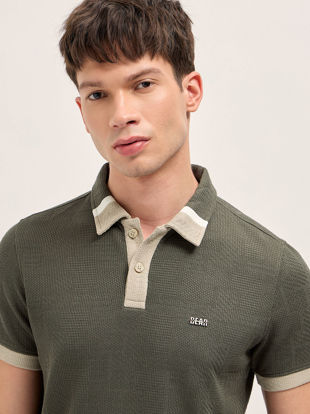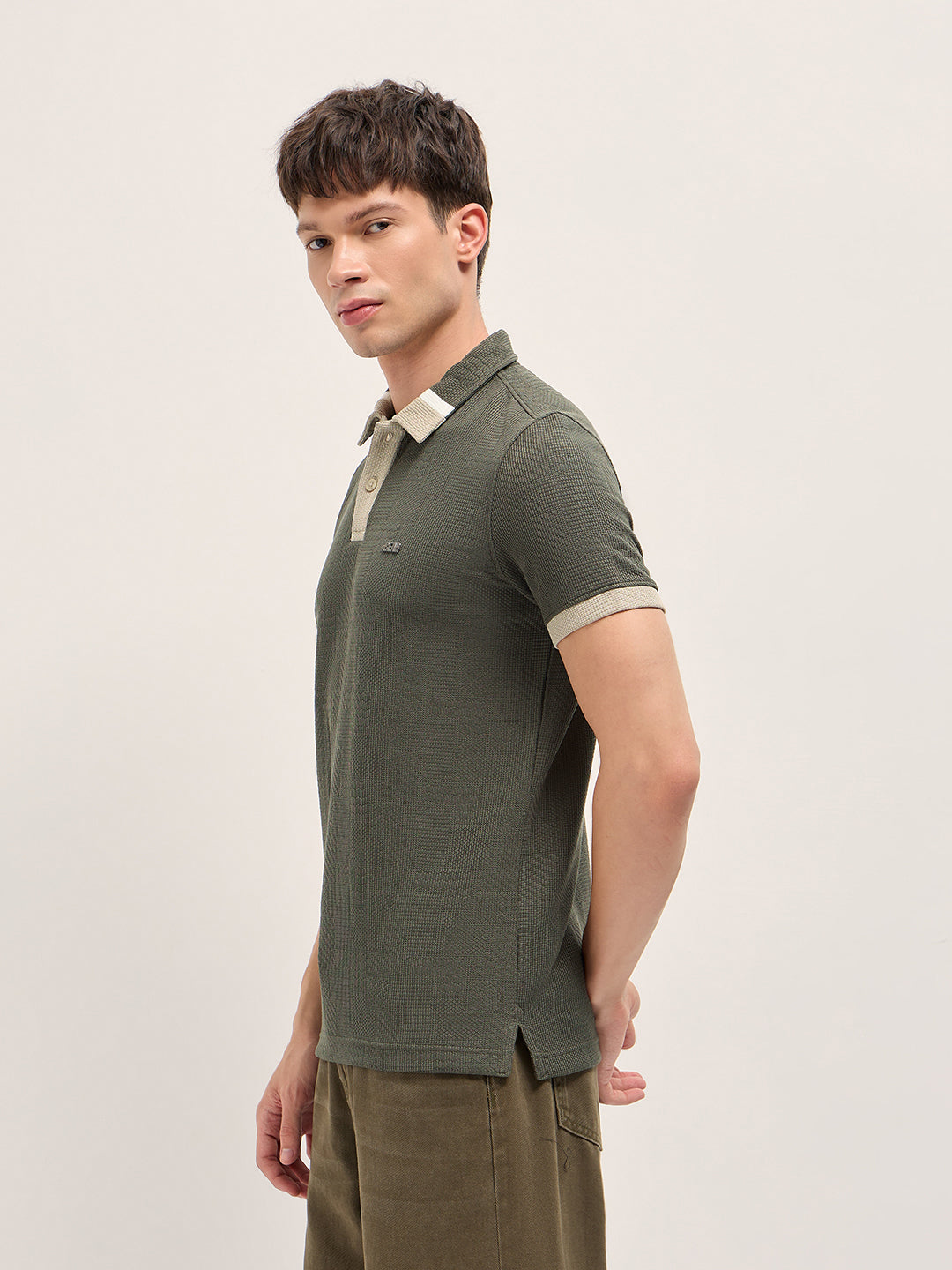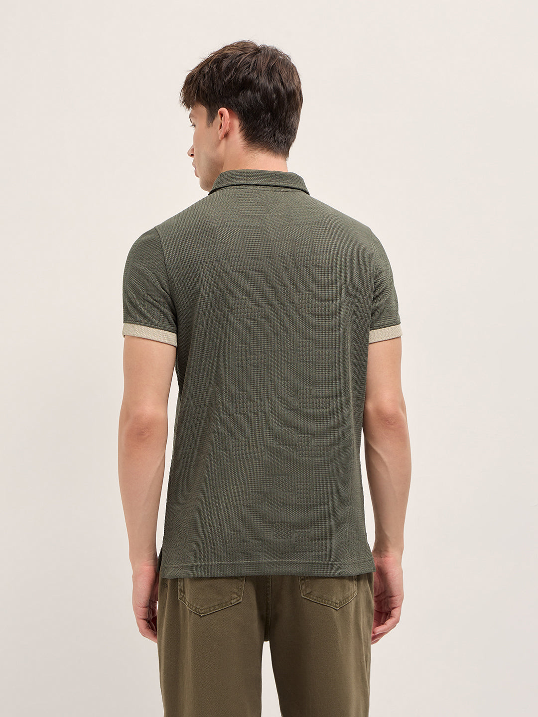 Olive Geometric Textured Knit Slim Fit Polo with Contrast Collar and Cuff Detailing