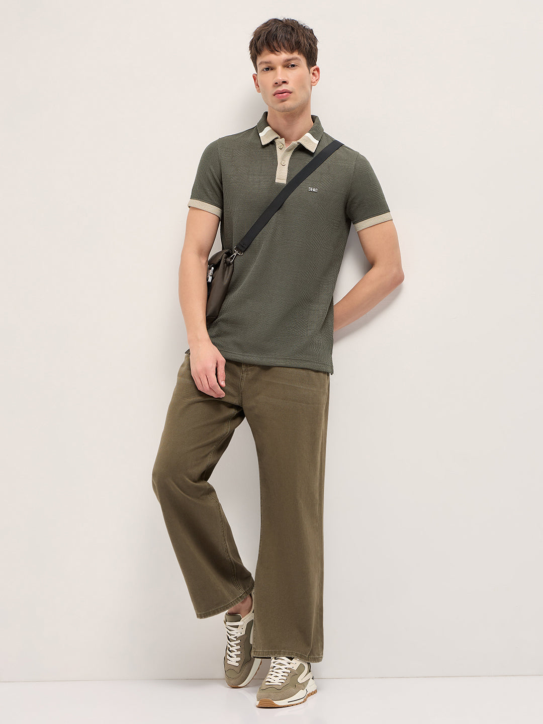 Shop Olive Geometric Textured Knit Slim Fit Polo with Contrast Collar and Cuff Detailing Online.