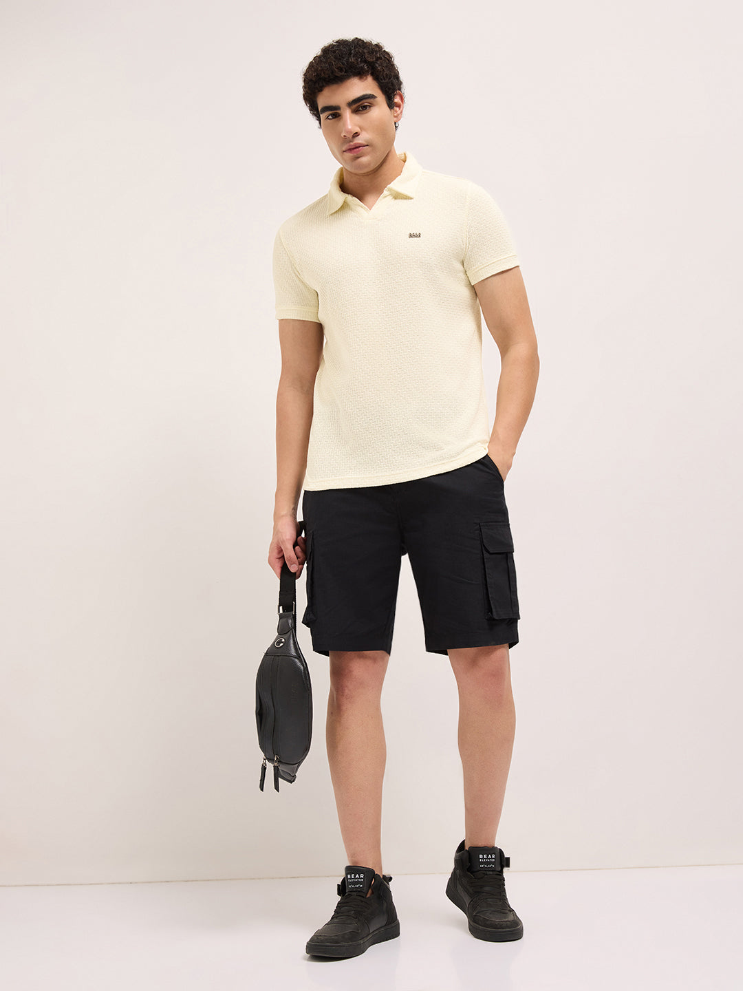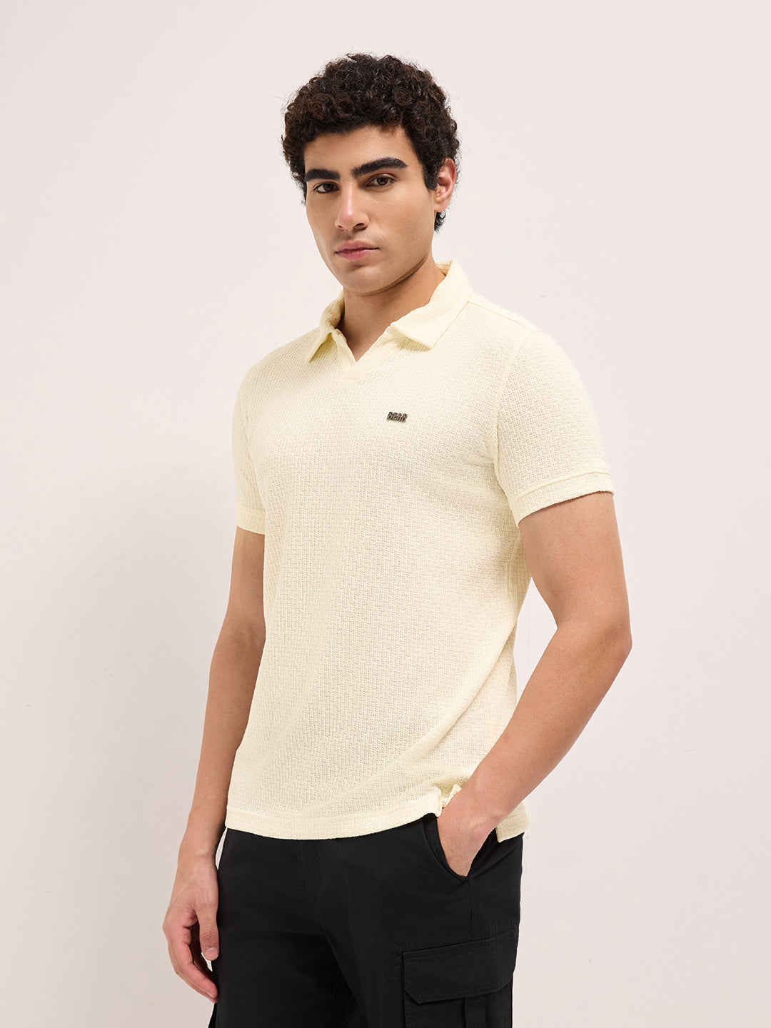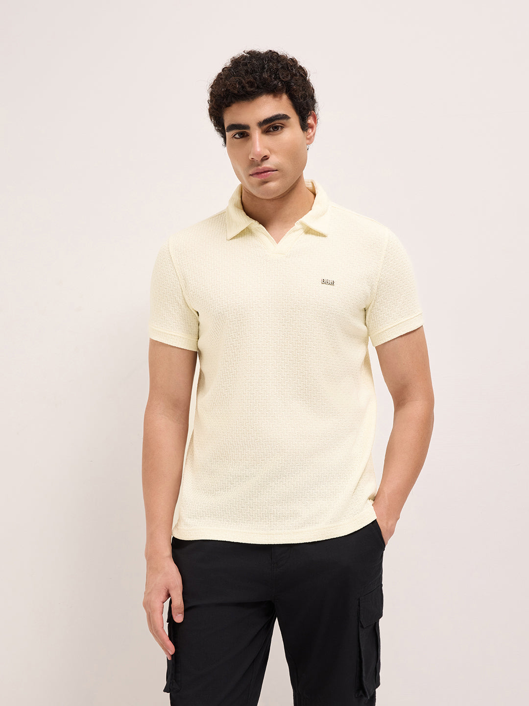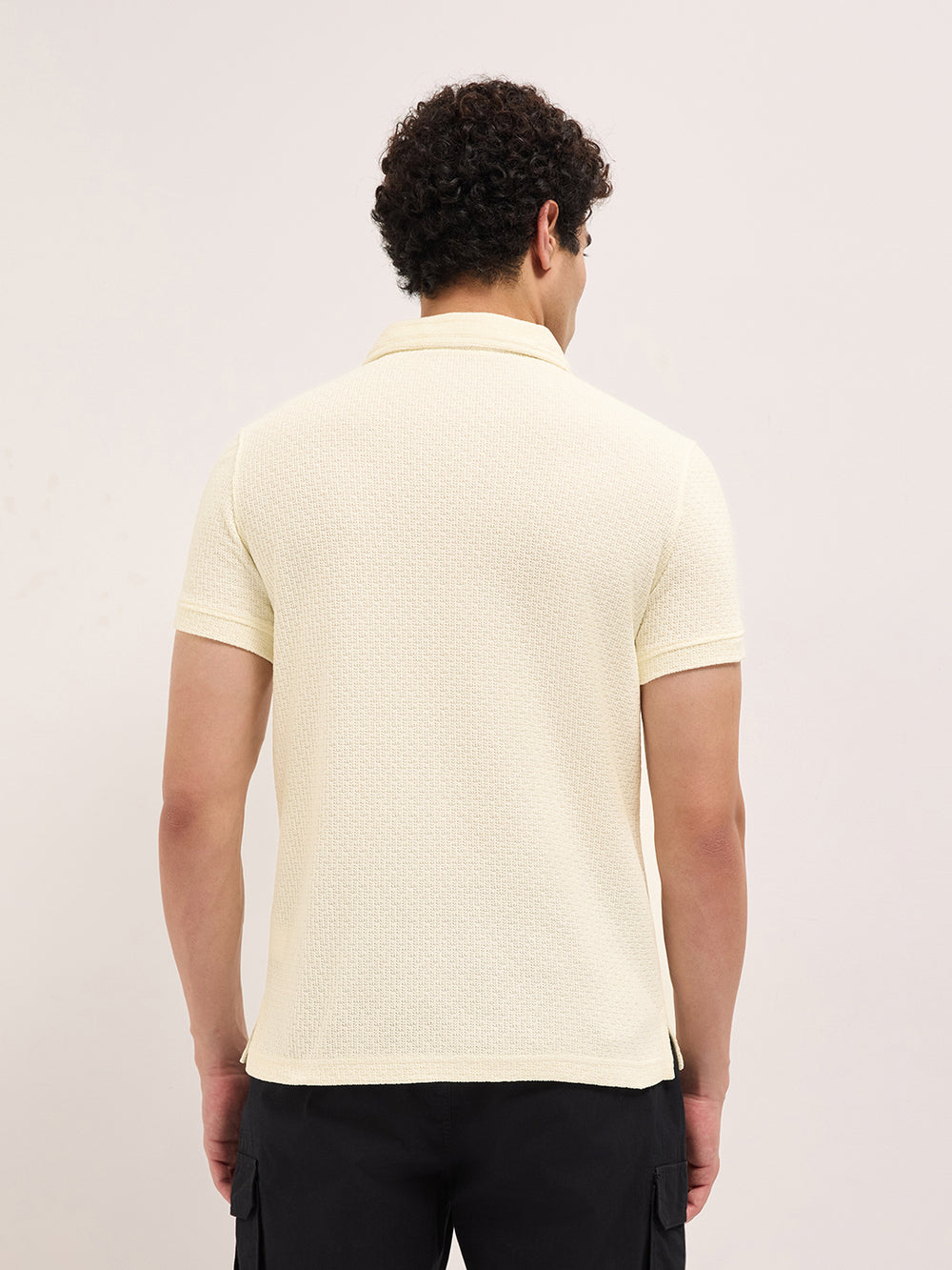 Shop Off-White Textured Knit Regular Fit Polo with Open V-Notch Placket Online.
