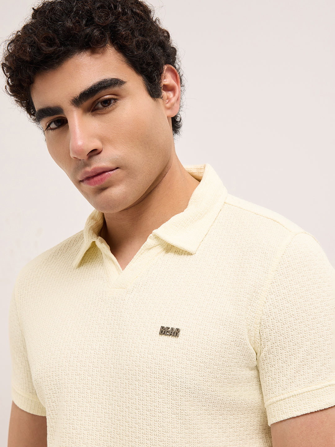 Off-White Textured Knit Regular Fit Polo with Open V-Notch Placket