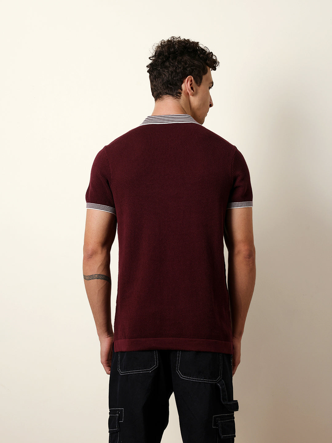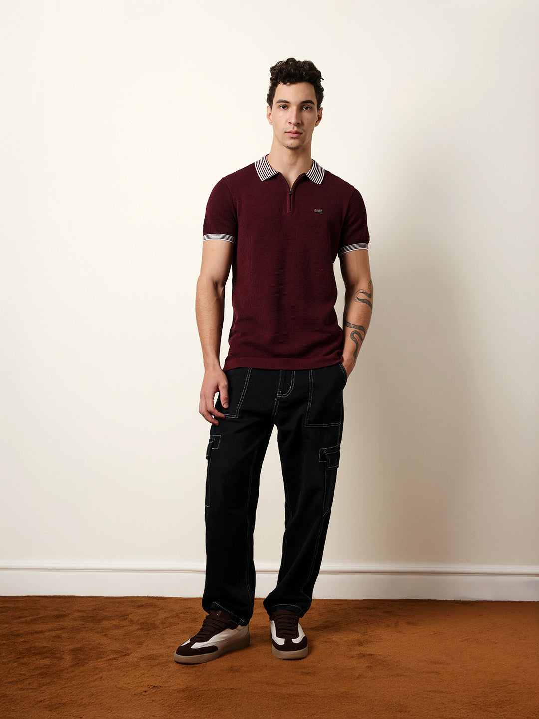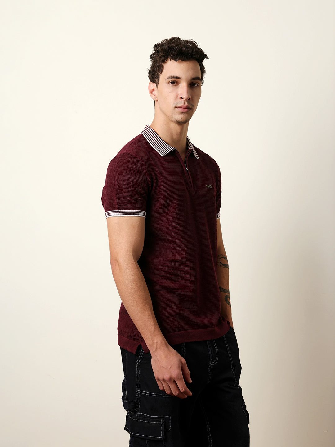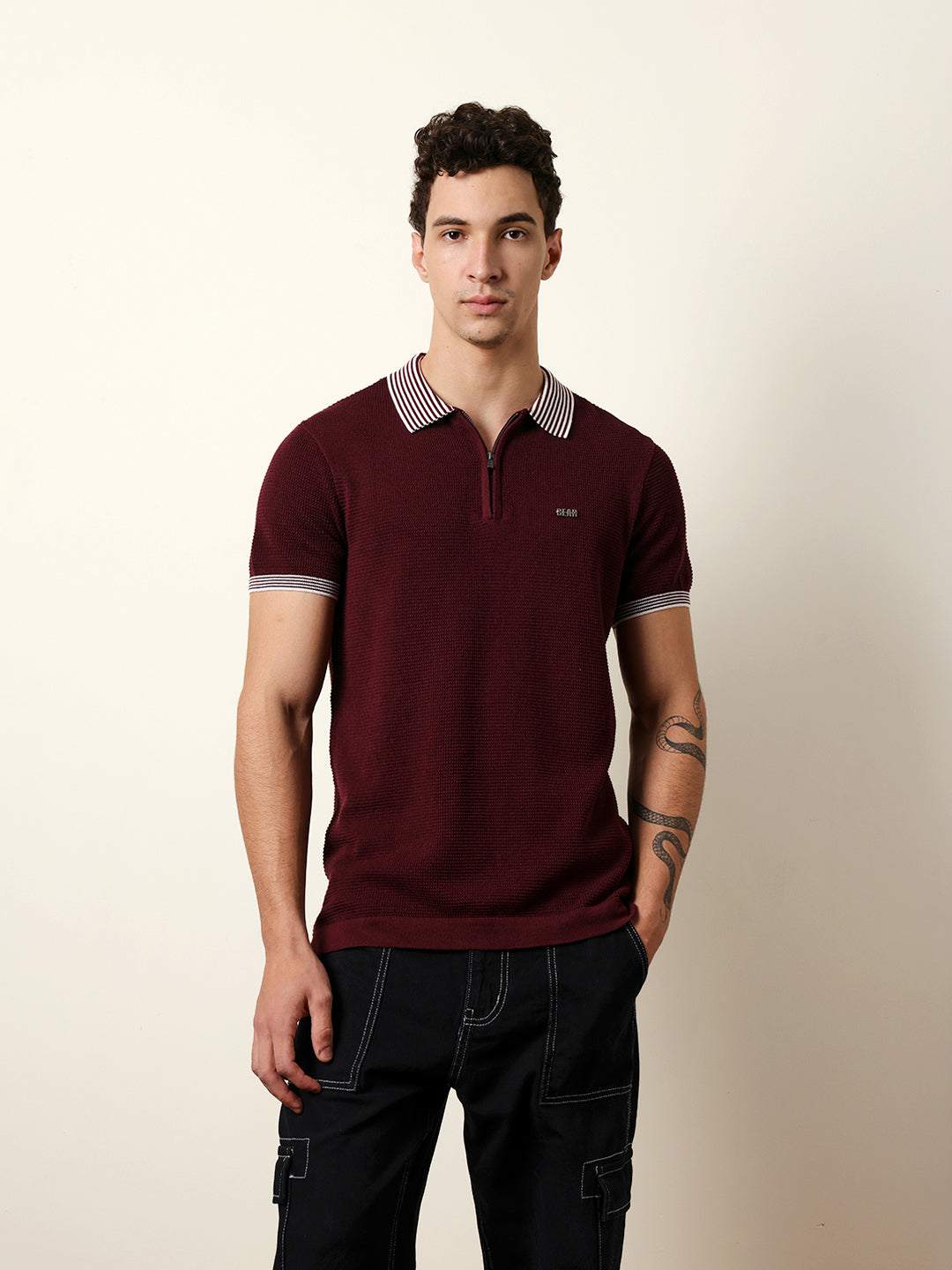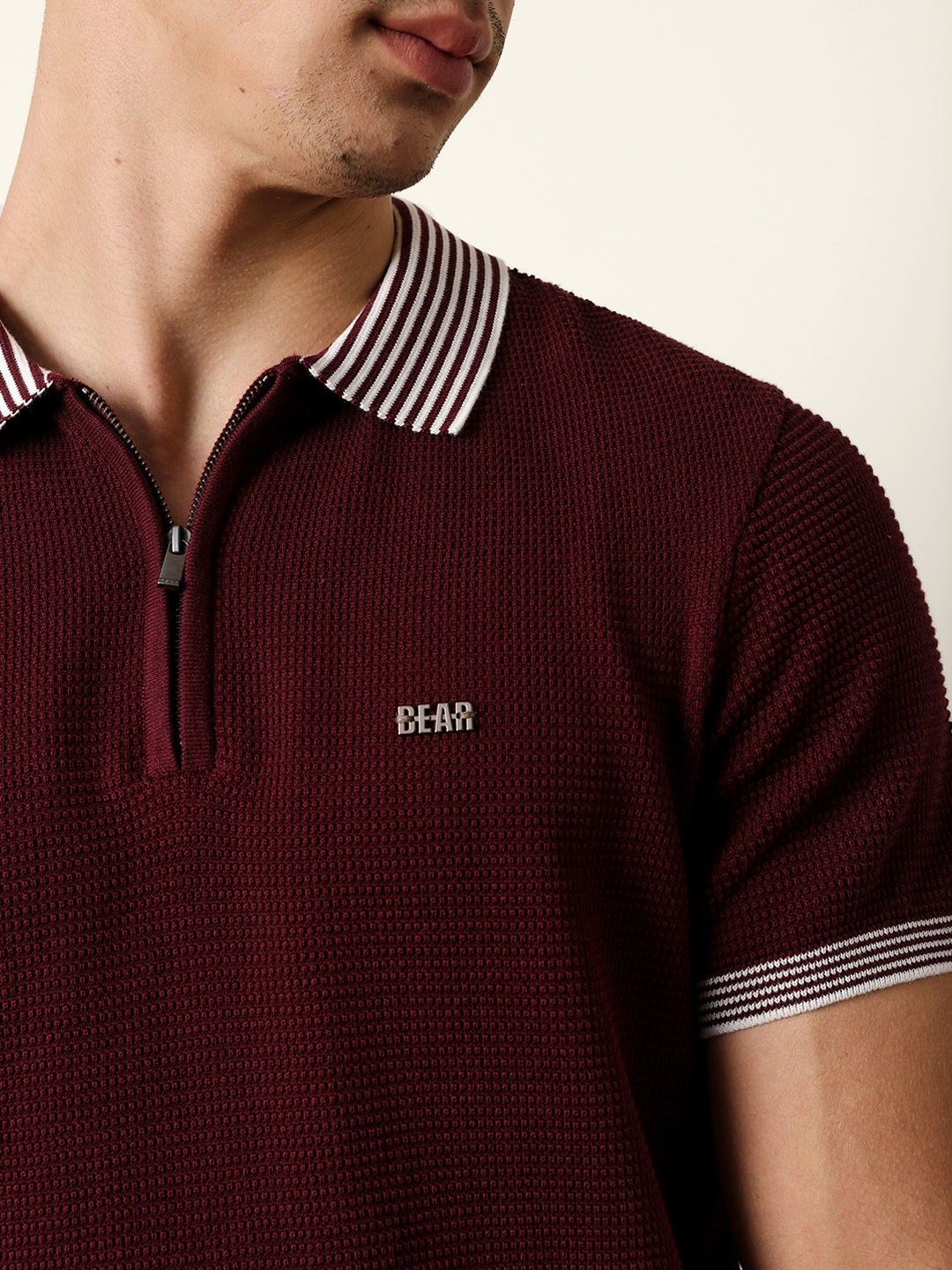 - Neck: Polo neck with a half-zip placket