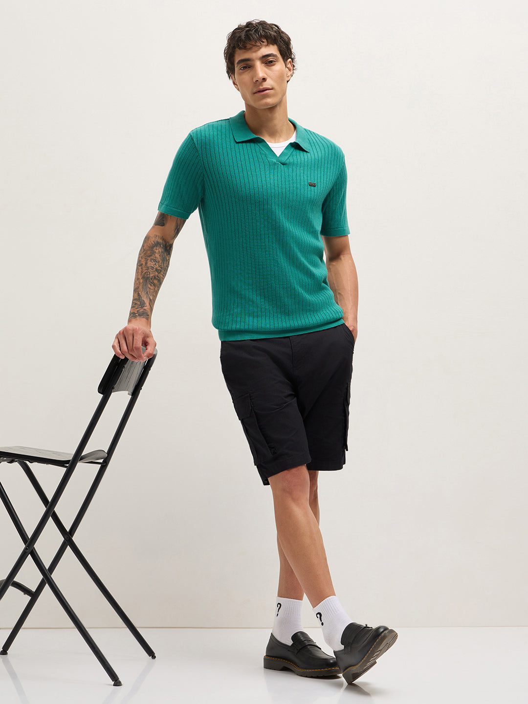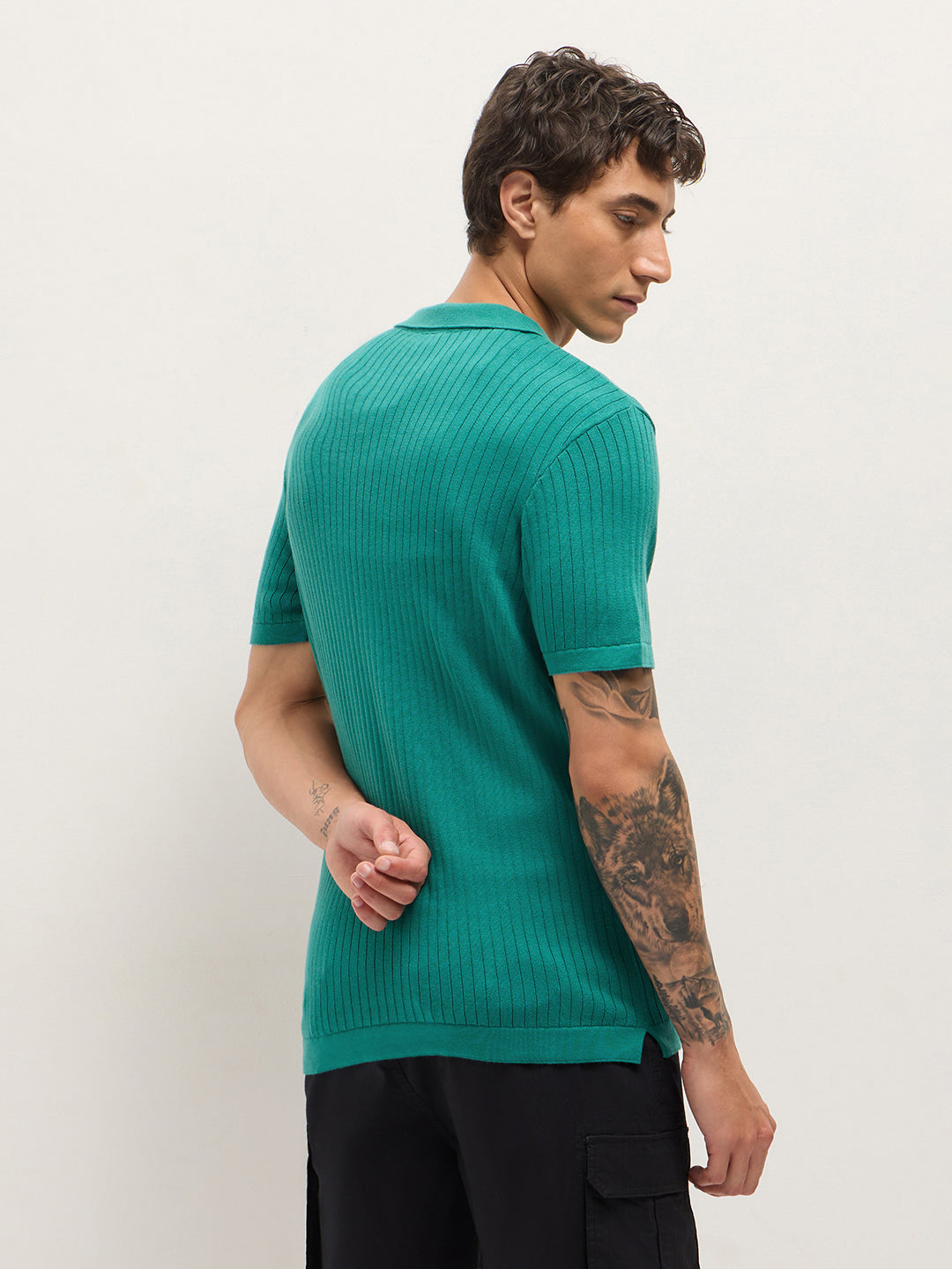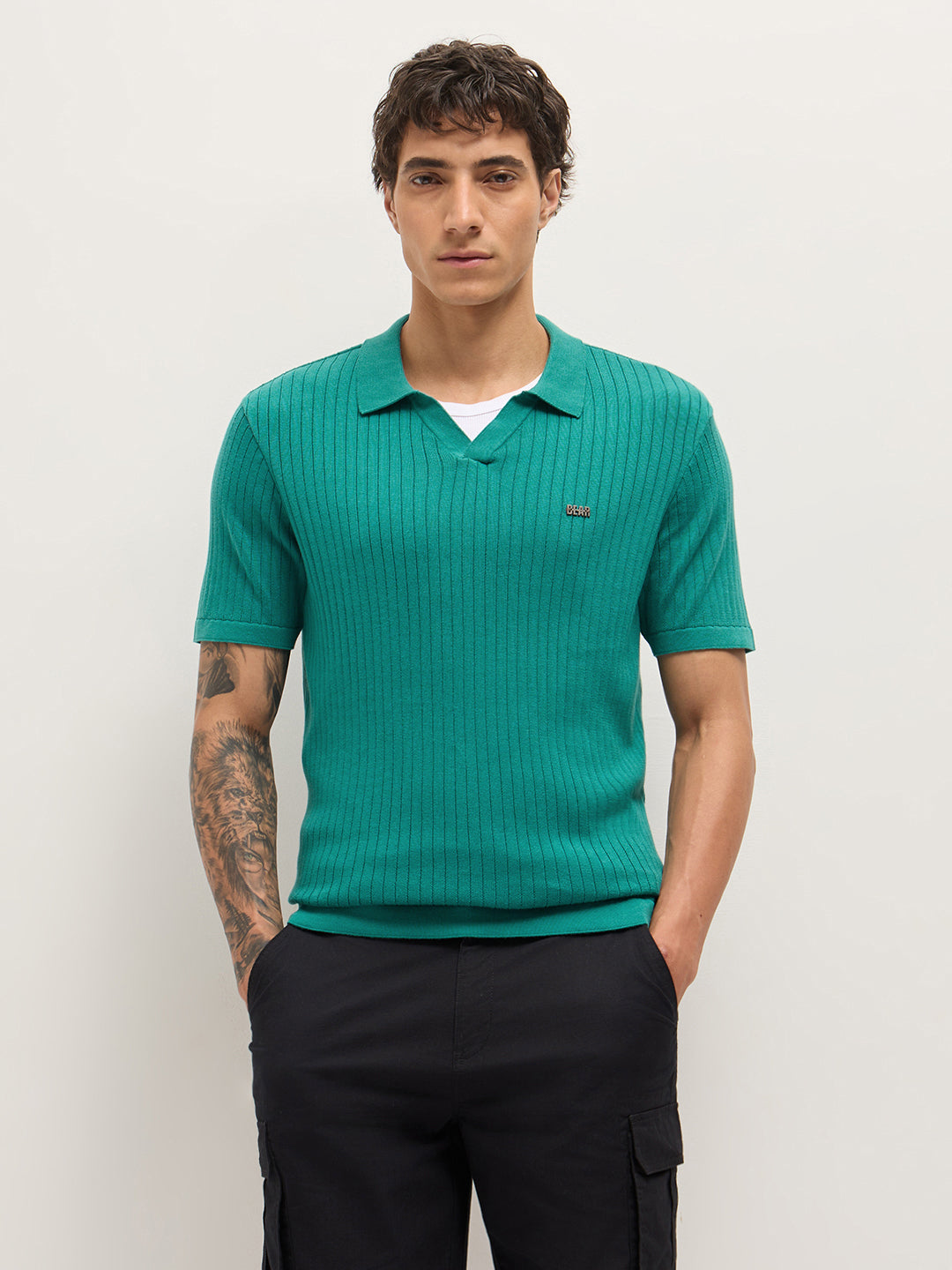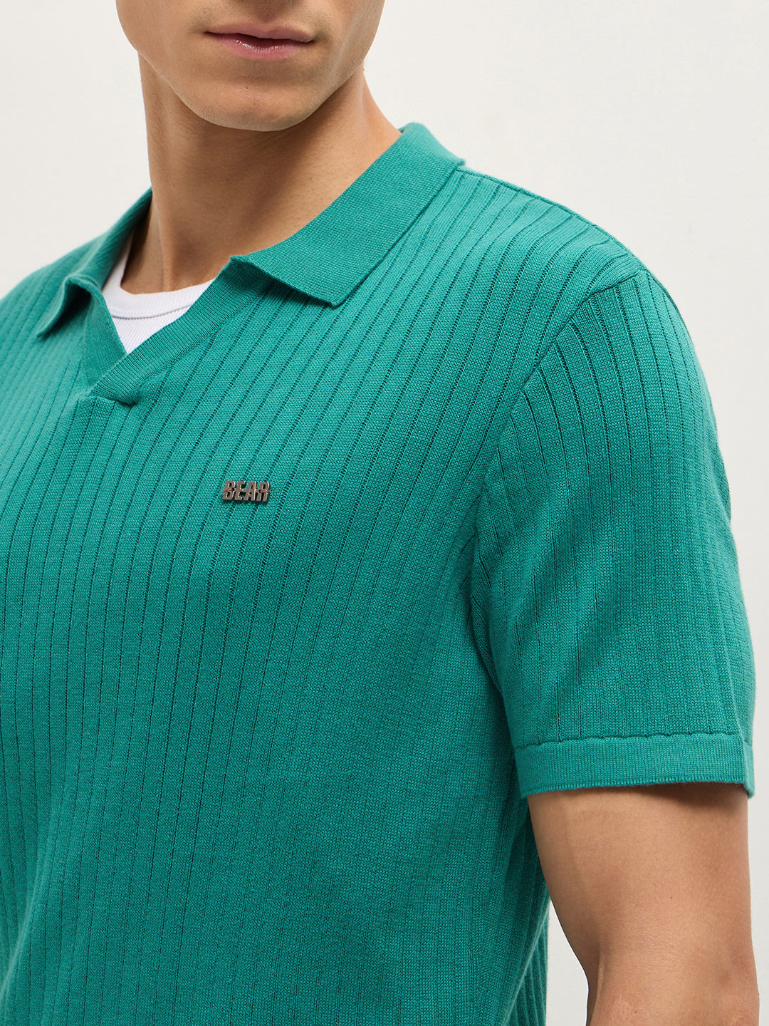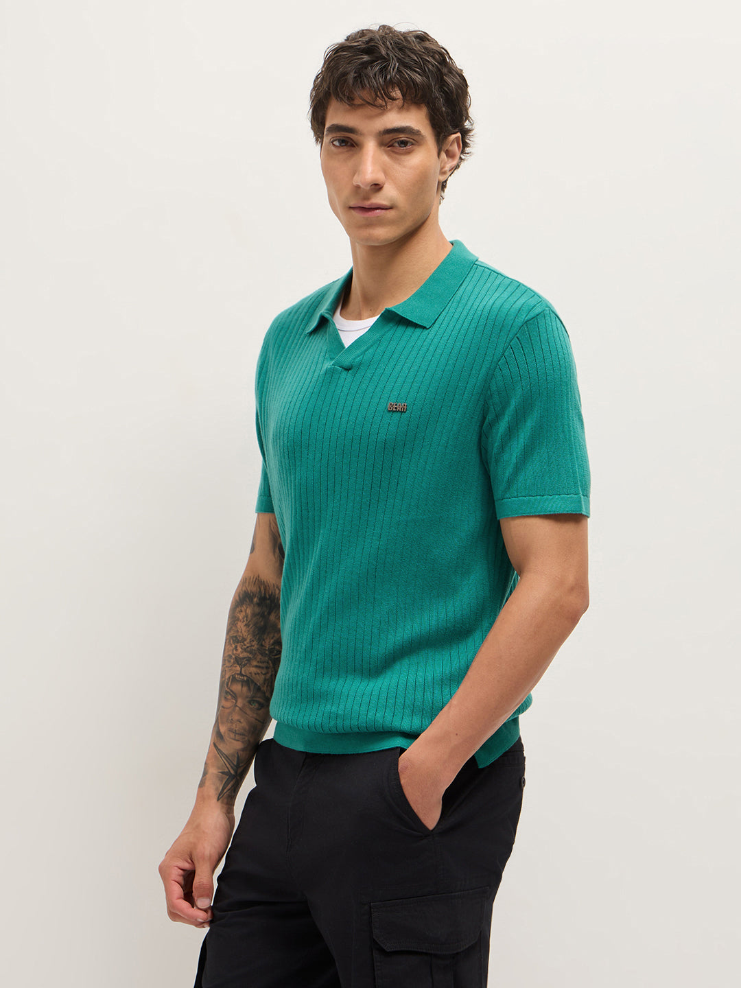 Teal Drop-Needle Vertical Stripe Knit Regular Fit Polo with Open V-Neck Placket Online.
