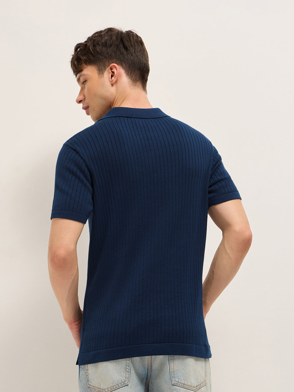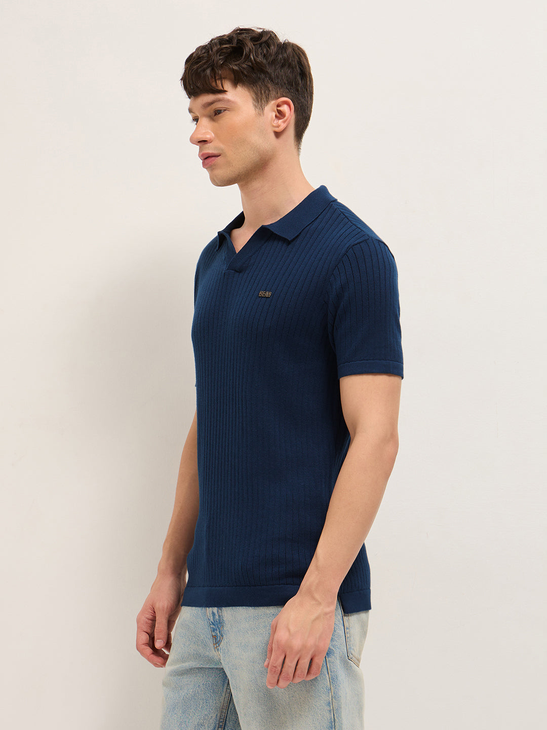 Shop Blue Drop-Needle Vertical Stripe Knit Regular Fit Polo with Open V-Neck Placket Online.