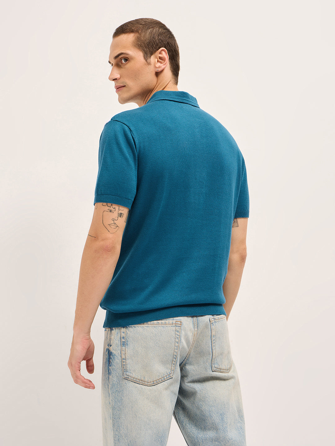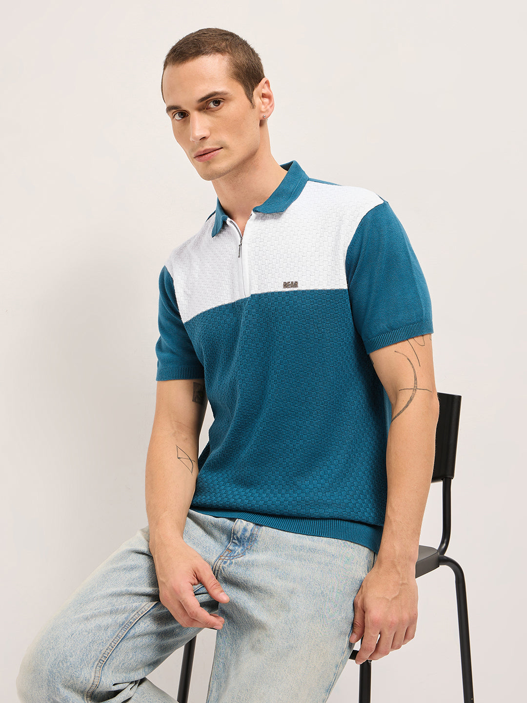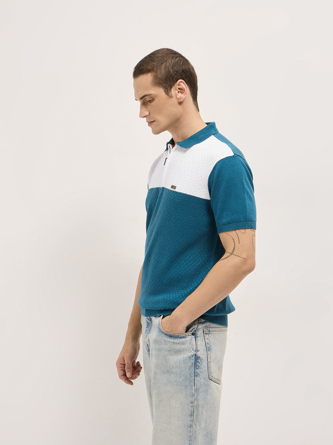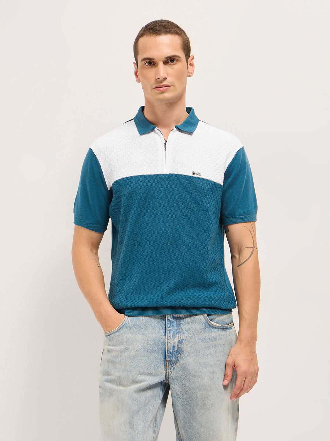 Shop Blue & White Geometric Textured Knit Regular Fit Polo with Zip Placket Online.