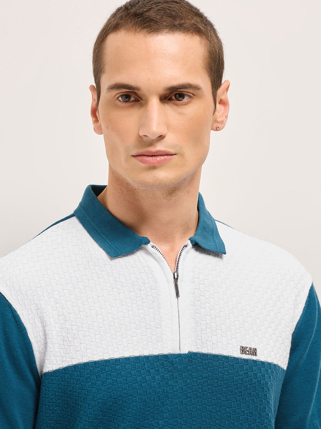 Blue & White Geometric Textured Knit Regular Fit Polo with Zip Placket