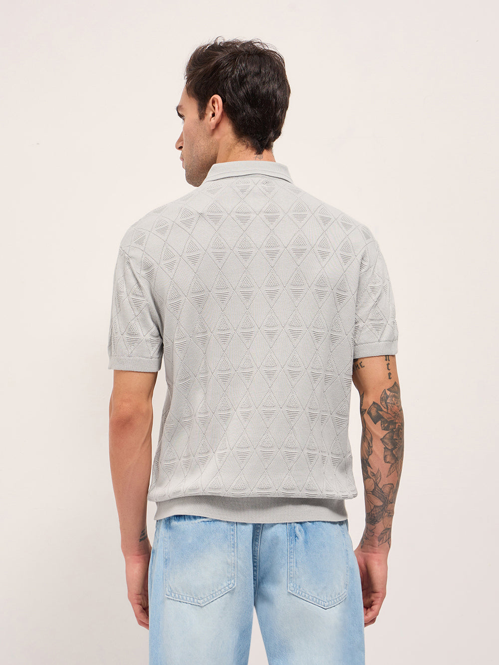 Grey Textured Knit Design Regular Fit Polo with Zipper Placket
