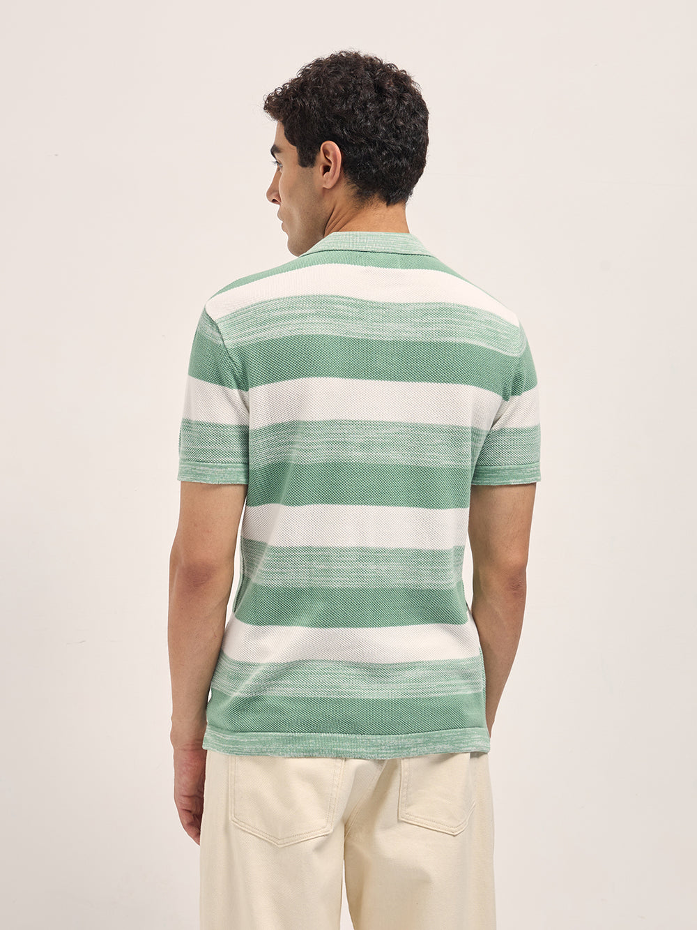 Green & White Horizontal Ribbed Stripes Slim Fit Polo