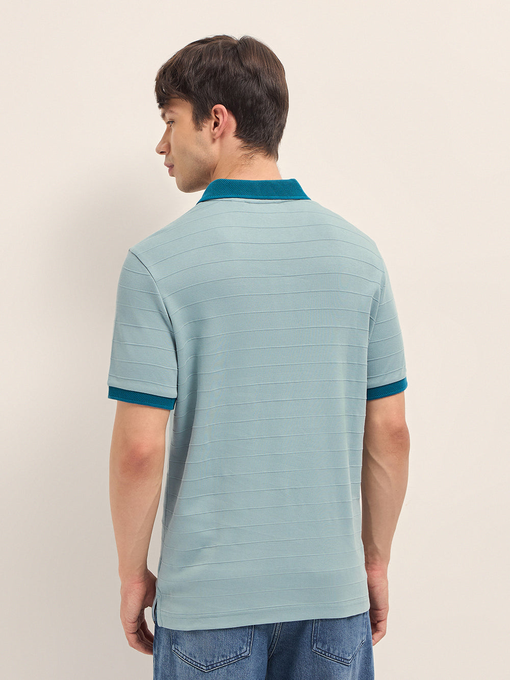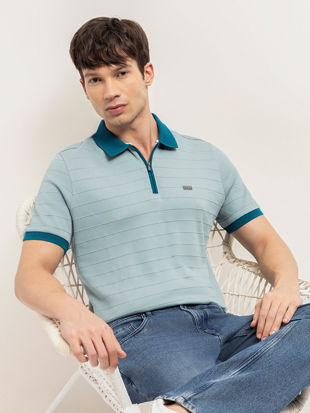 Shop Teal Blue Horizontal Interlock Knit Regular Fit Polo with Contrast Half-Zip Collar & Cuffs Online.