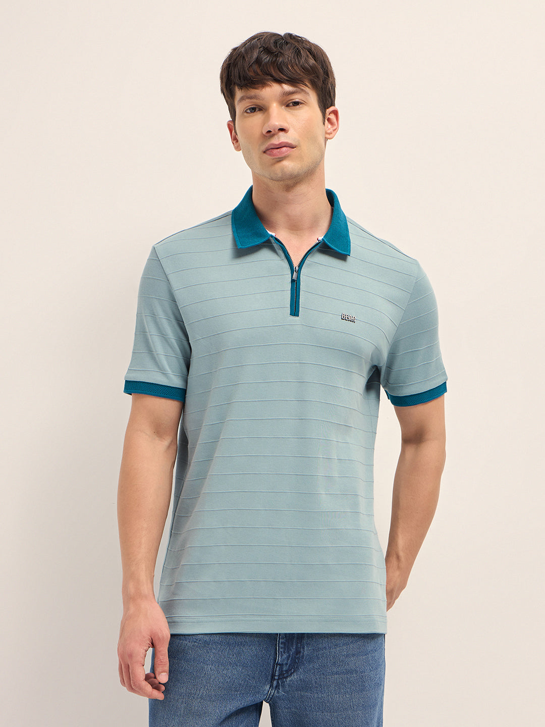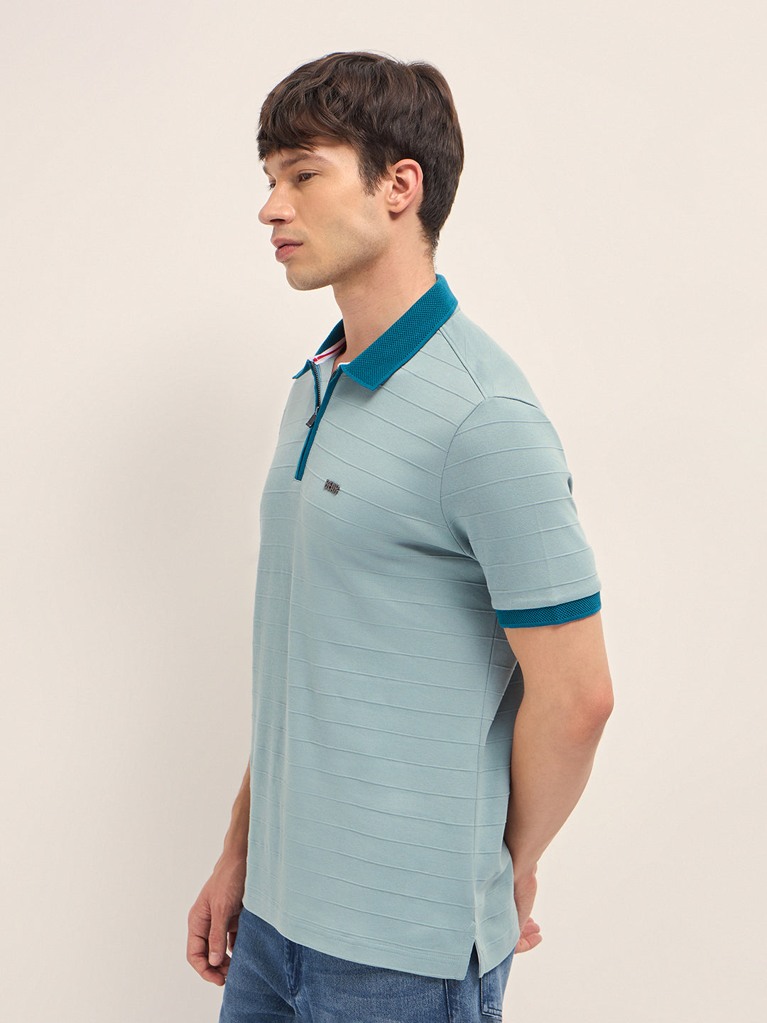 Teal Blue Horizontal Interlock Knit Regular Fit Polo with Contrast Half-Zip Collar & Cuffs