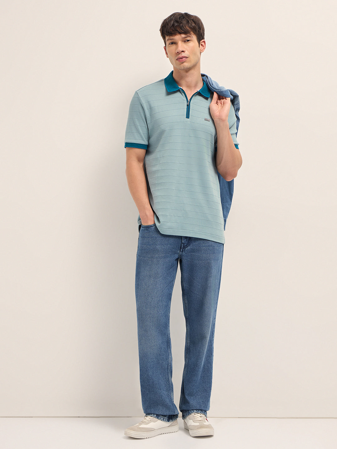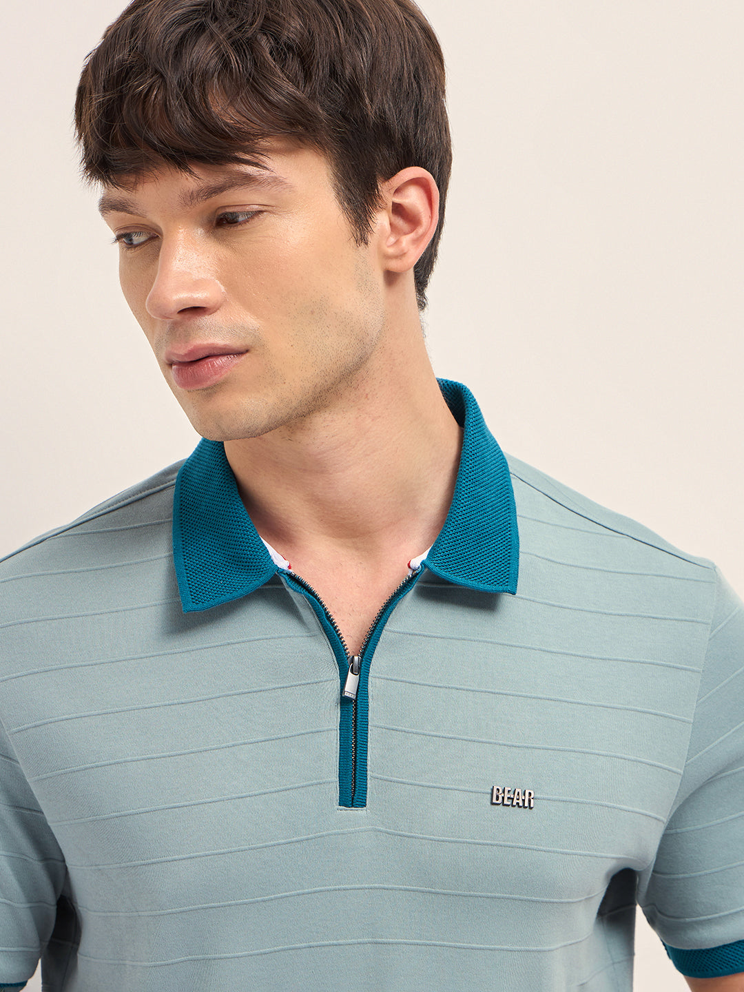 • Collar: Contrast polo collar with a half-zip placket