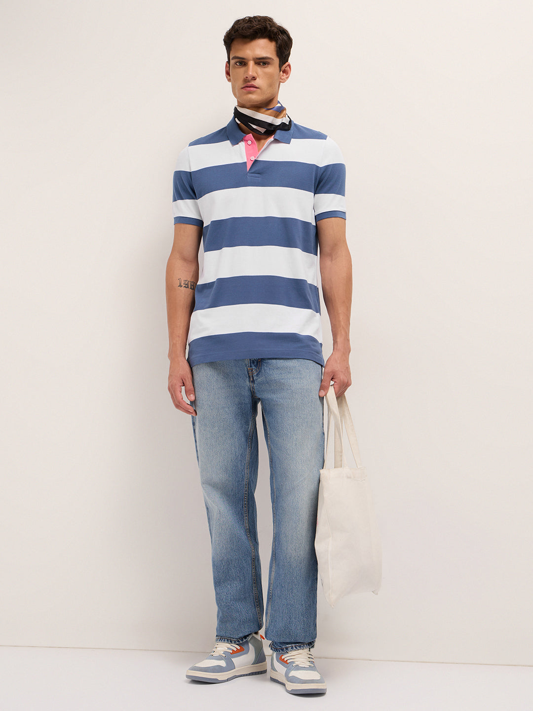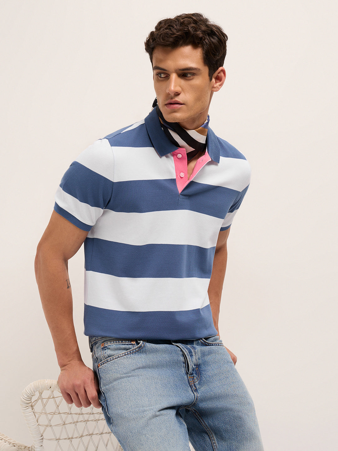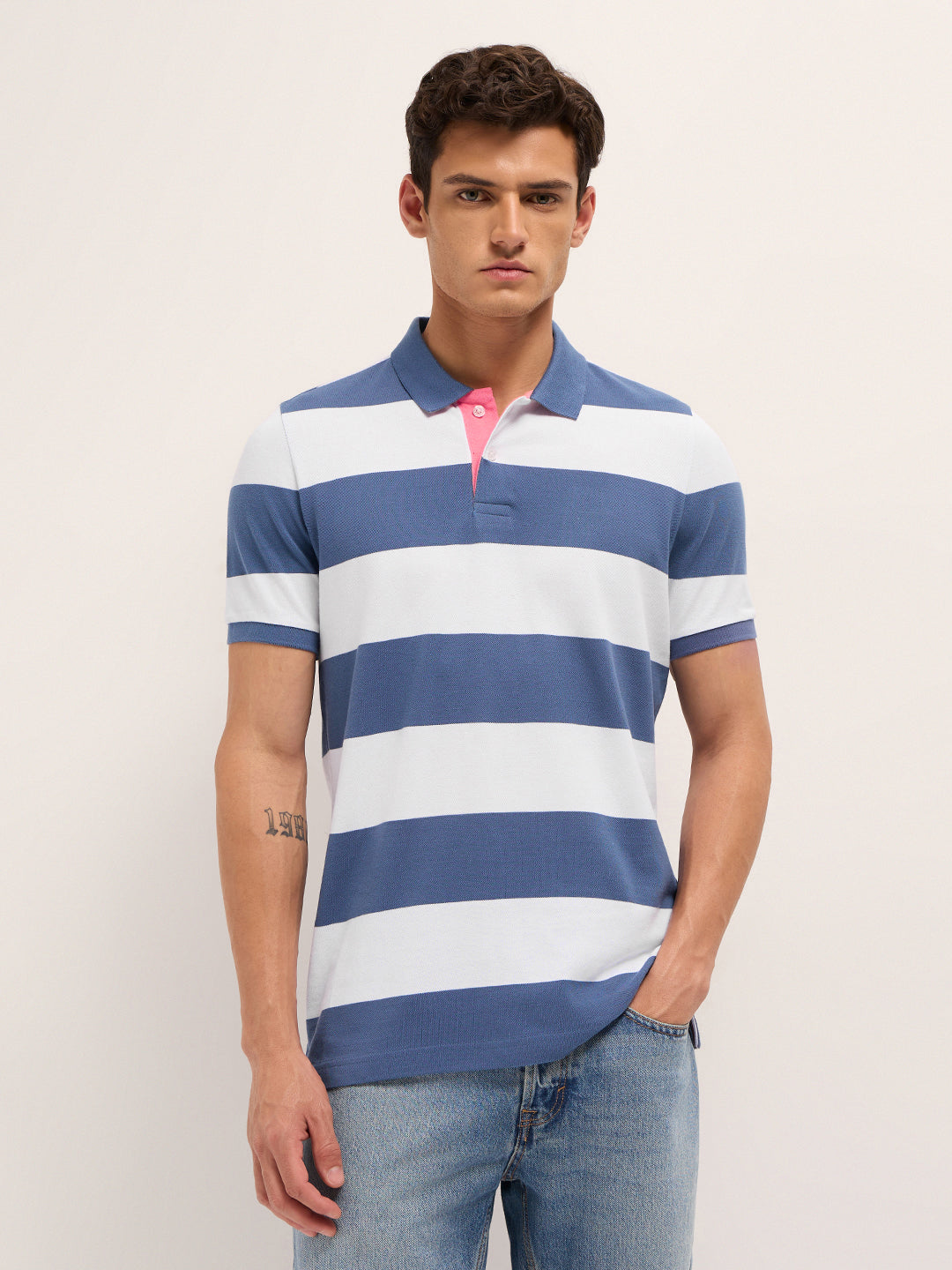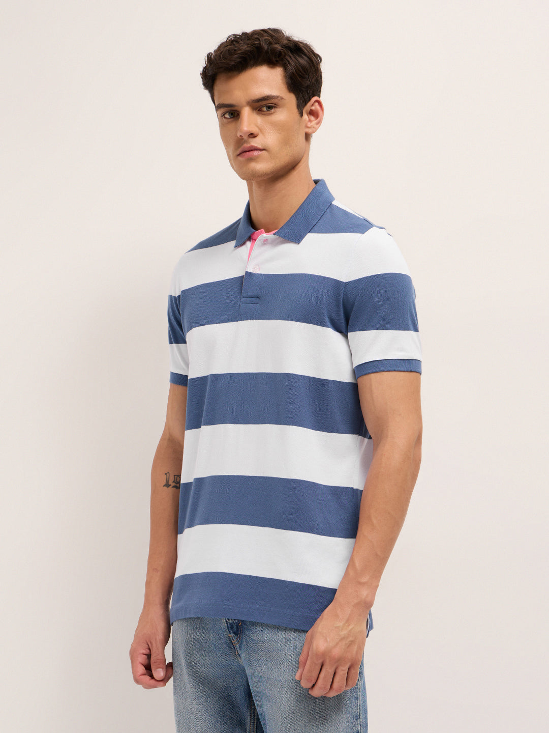 Shop Blue and White Bold Horizontal Stripe Knit Regular Fit Polo Online.