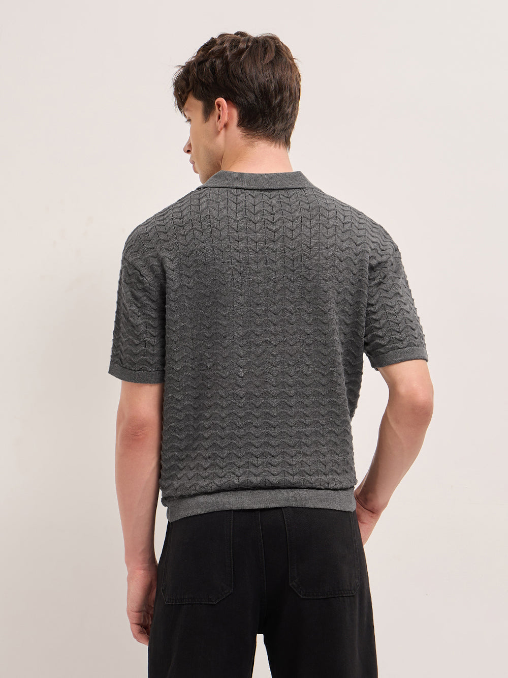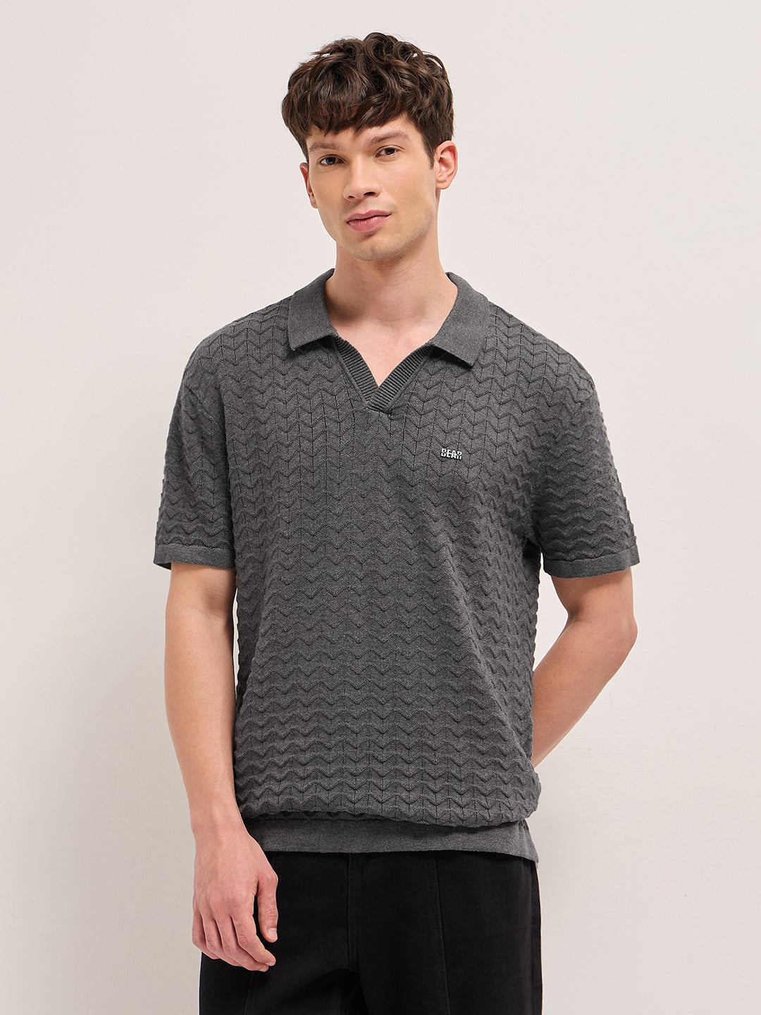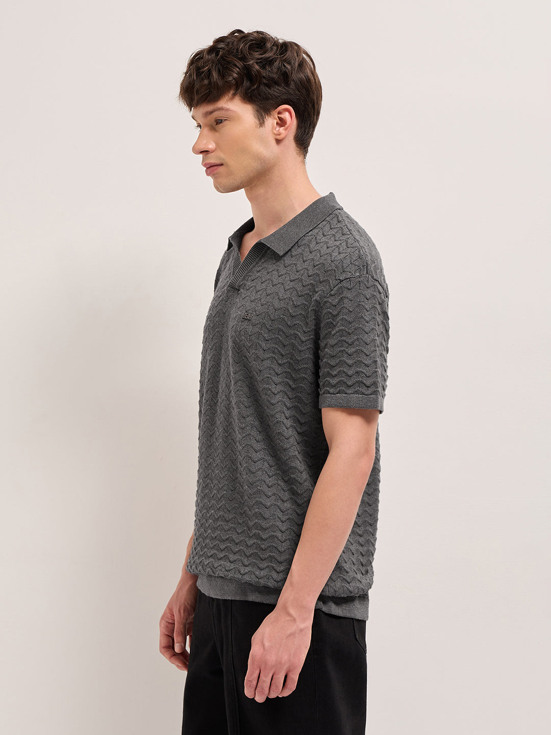 Shop Grey Textured Chevron Knit Relaxed Fit Polo with Open V-Neck Placket Online.