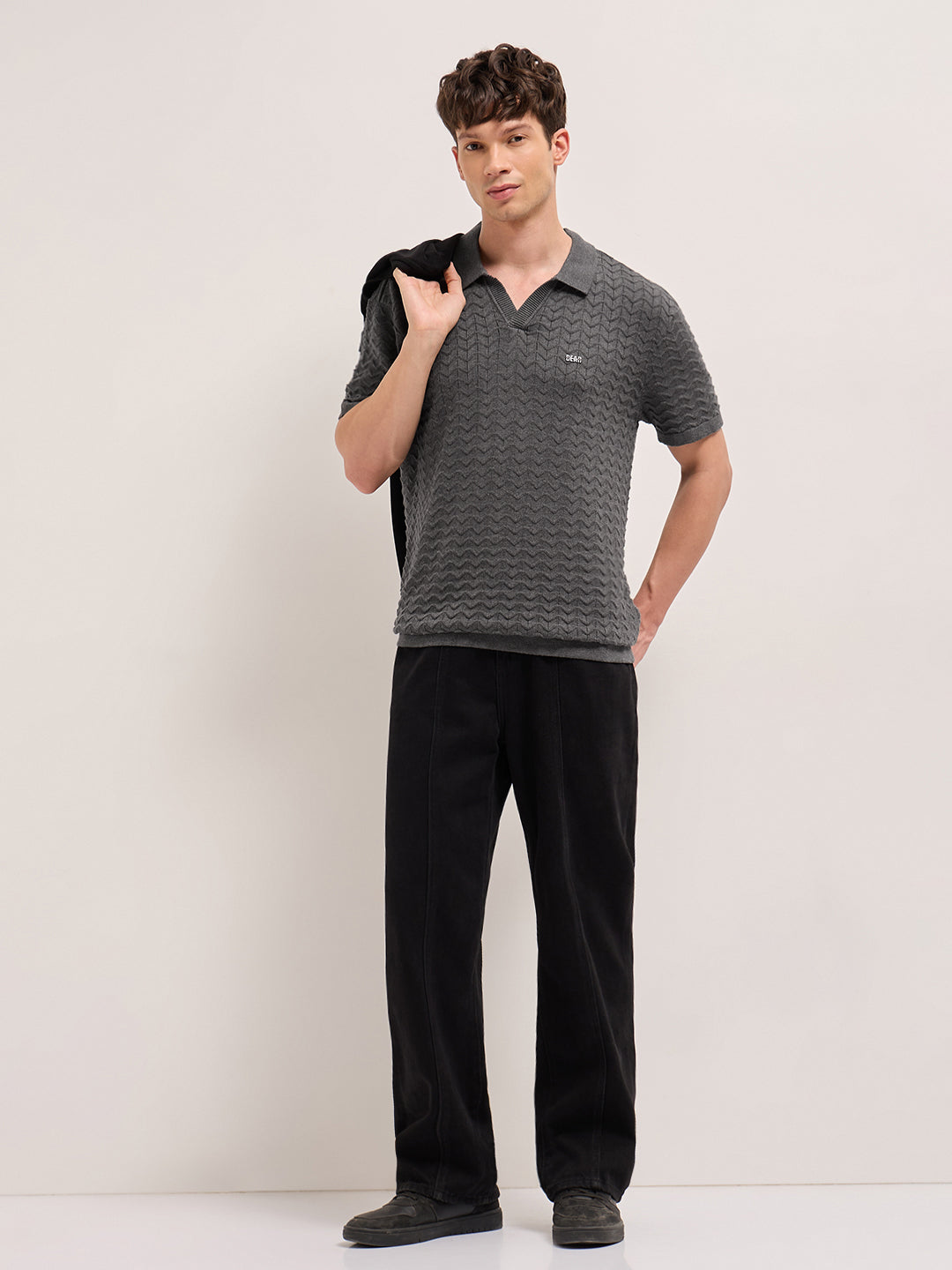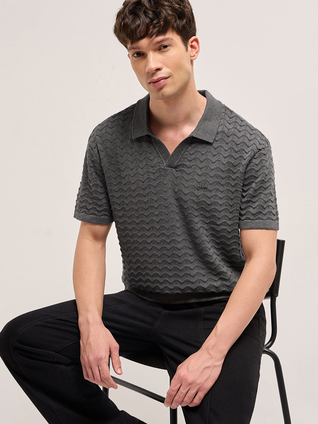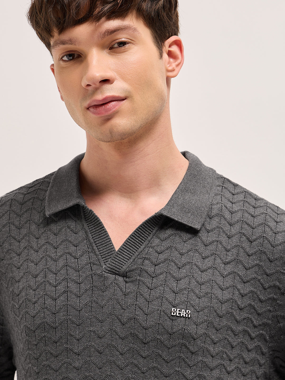 Shop Grey Textured Chevron Knit Relaxed Fit Polo with Open V-Neck Placket Online.