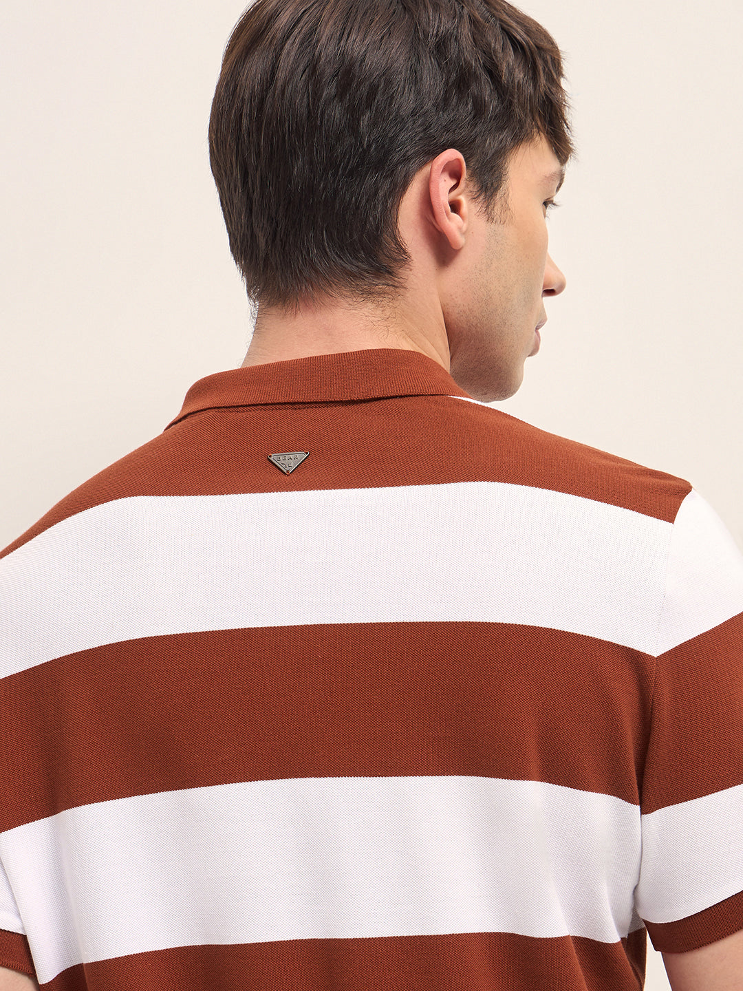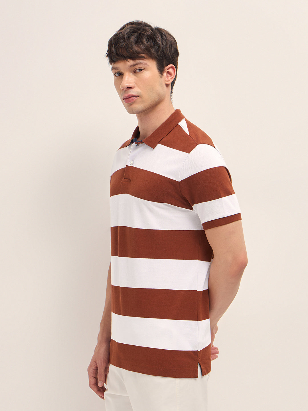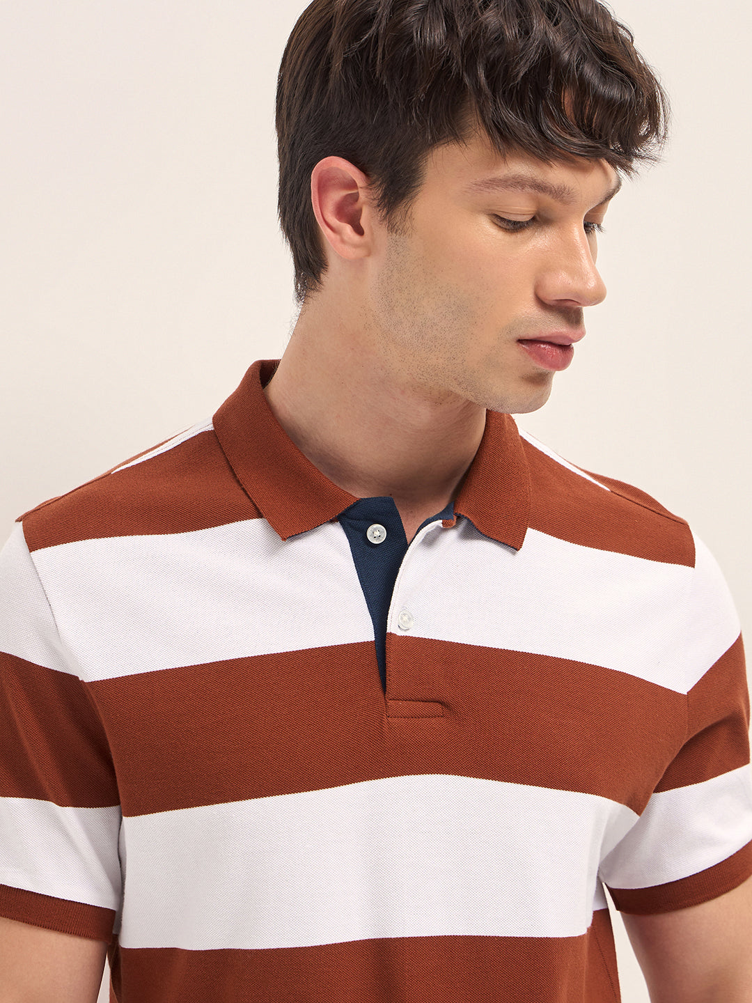 Rust and White Bold Horizontal Stripe Knit Regular Fit Polo