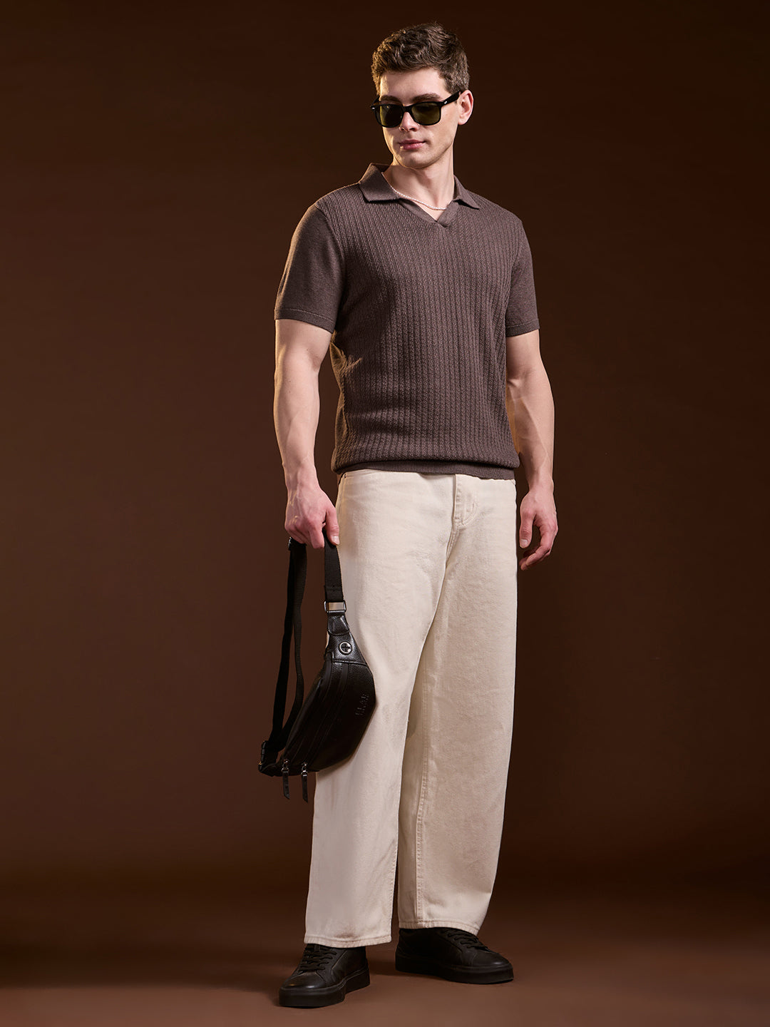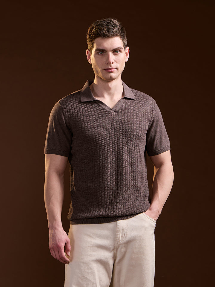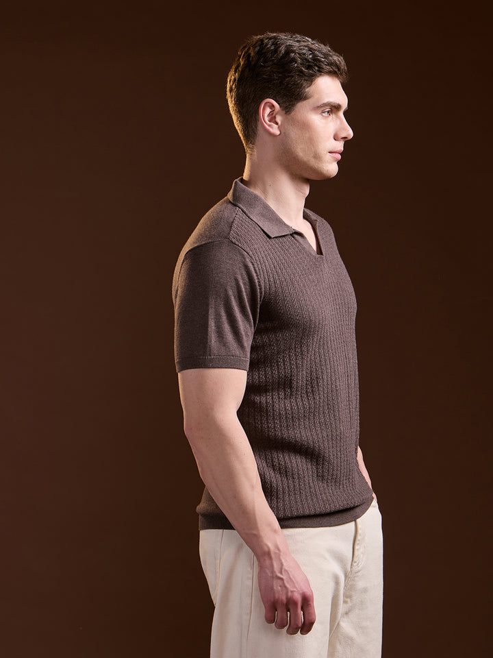 Shop Brown Ribbed Texture Design Slim Fit Polo Online.