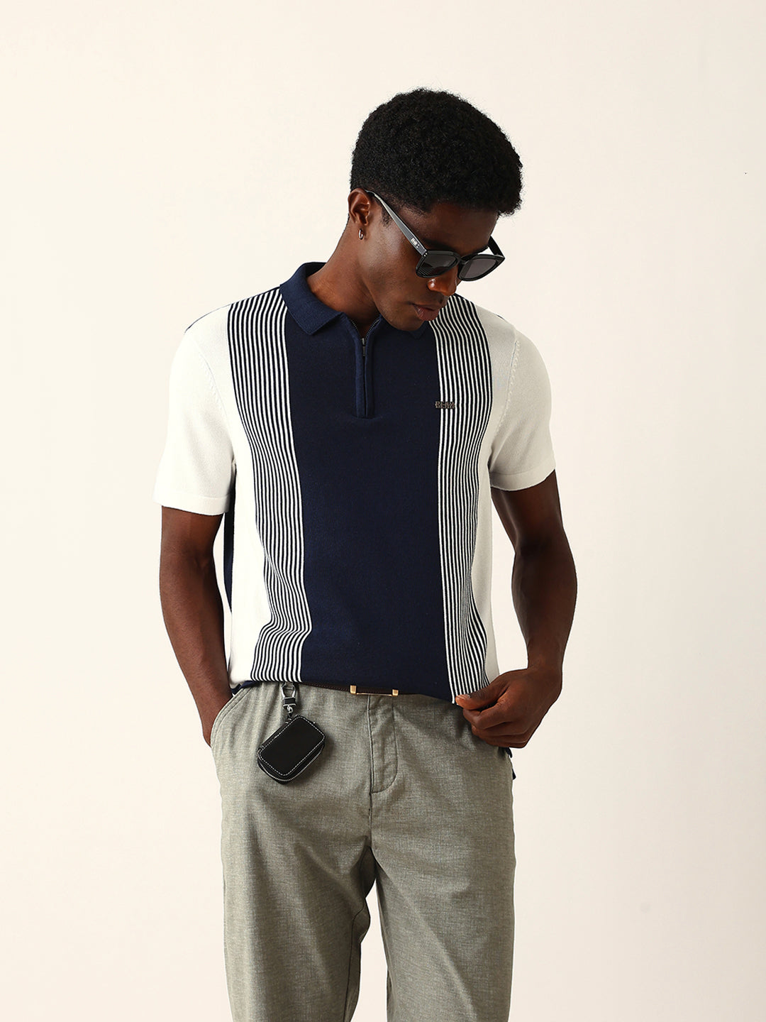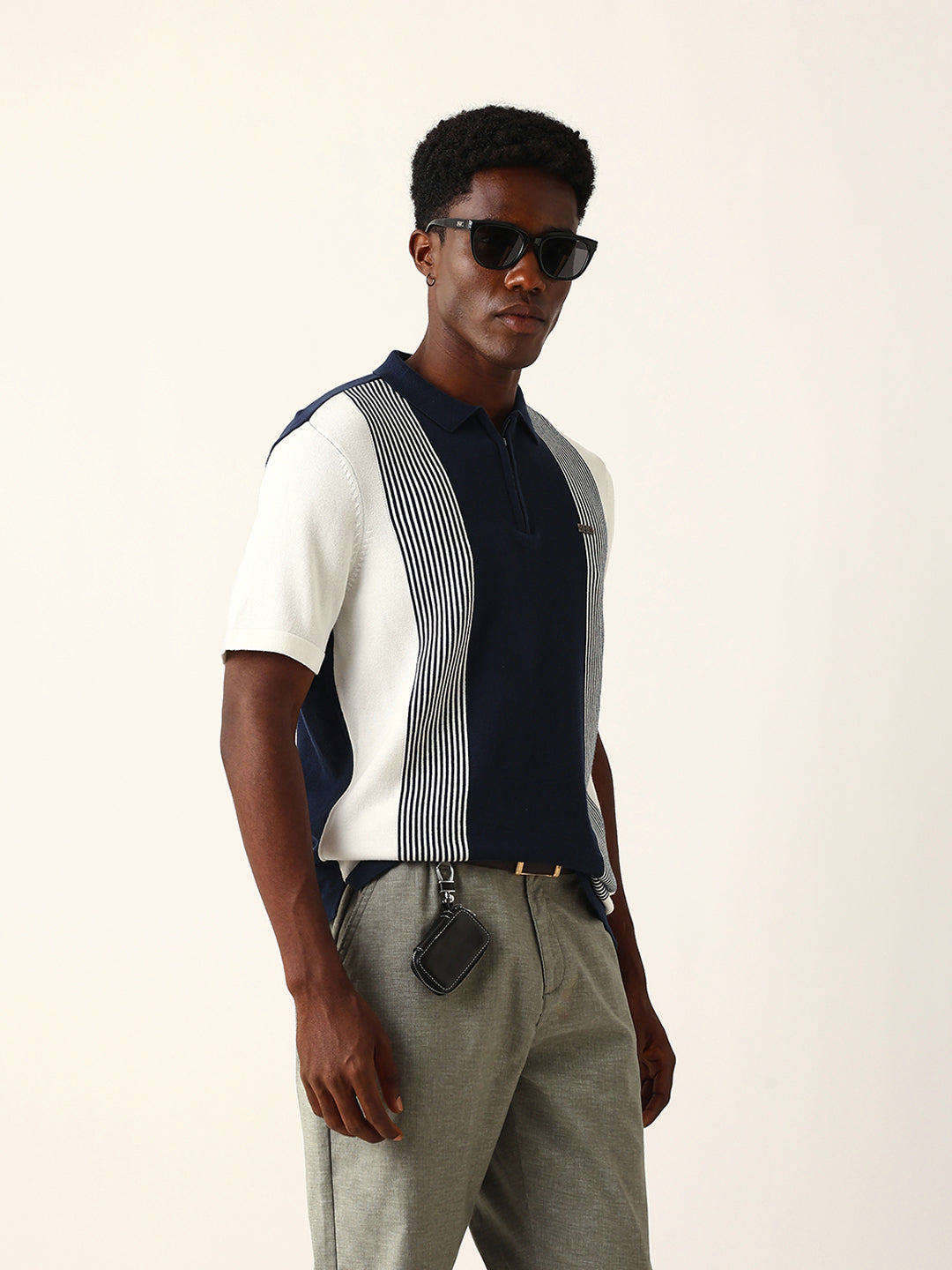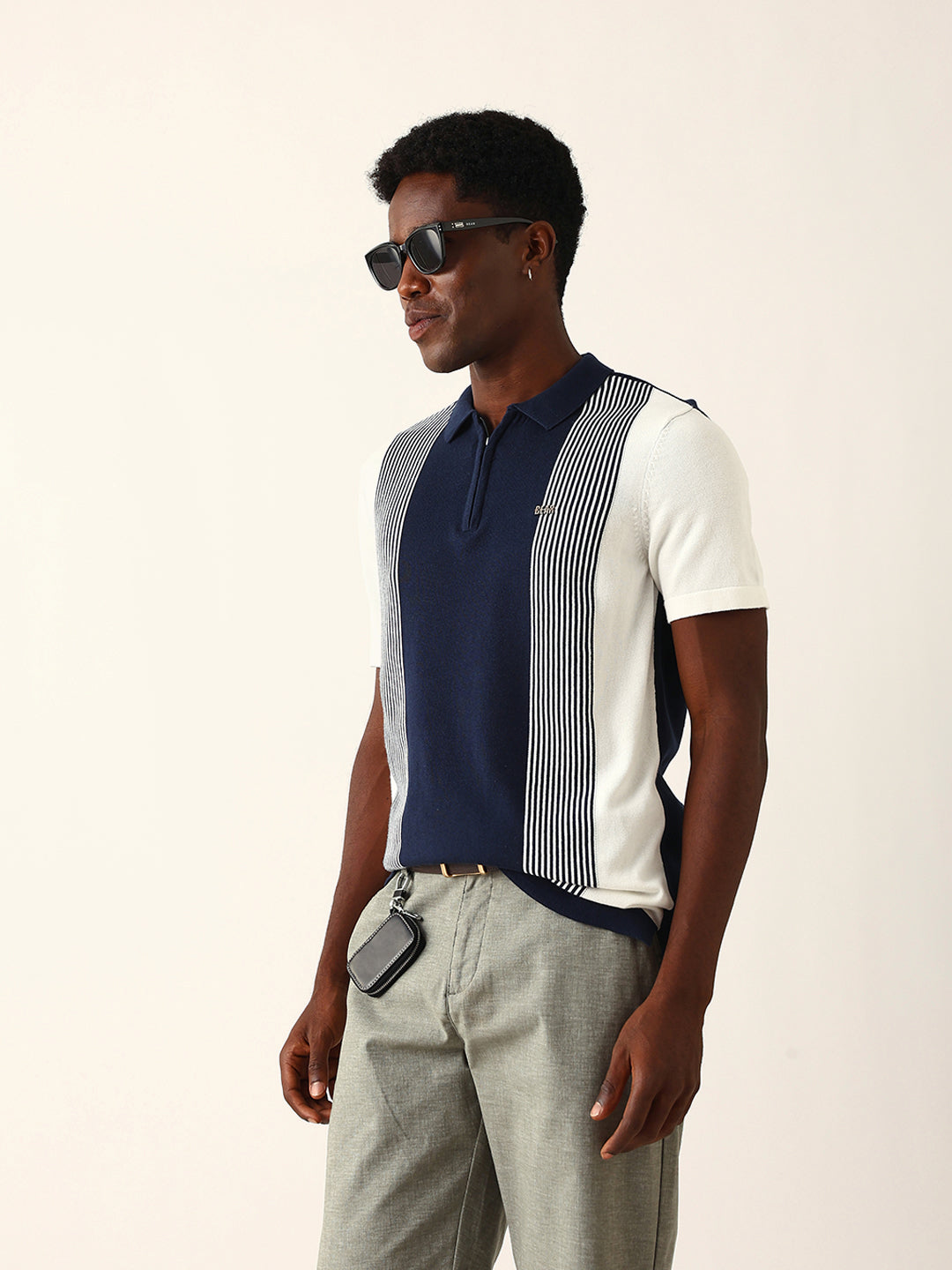 Blue & White Vertical Pinstripe Panel Polo with Half-Zip Placket