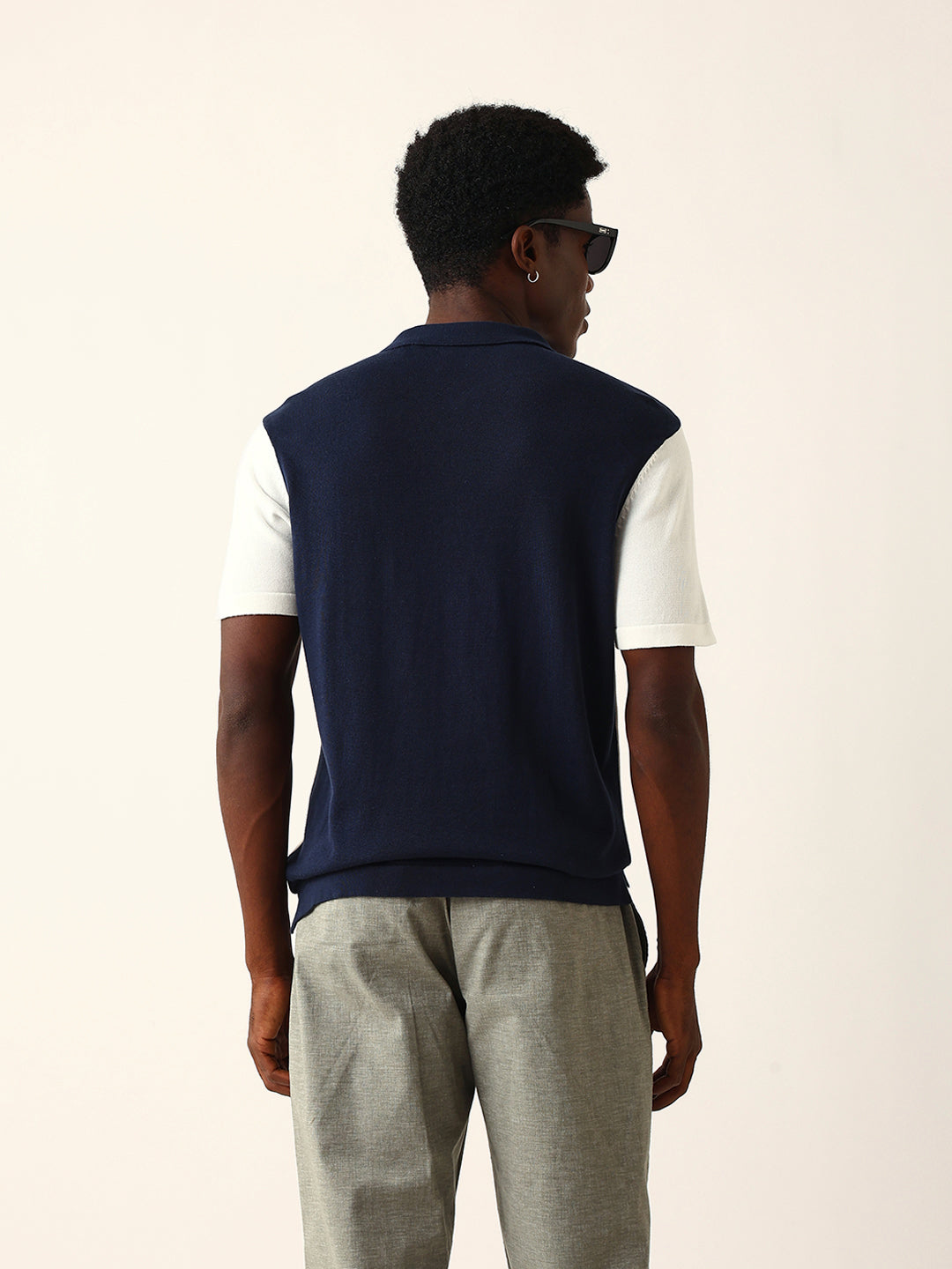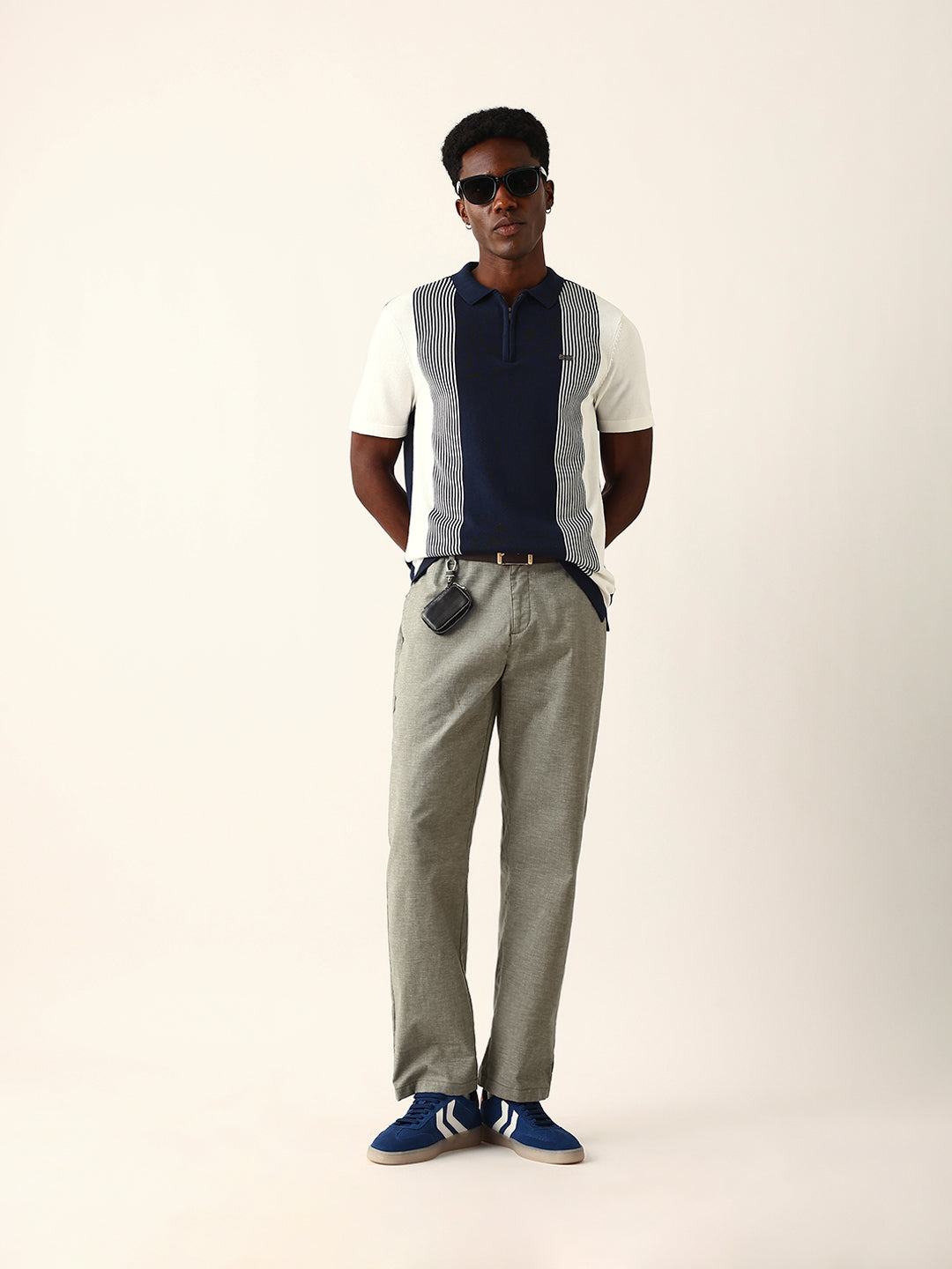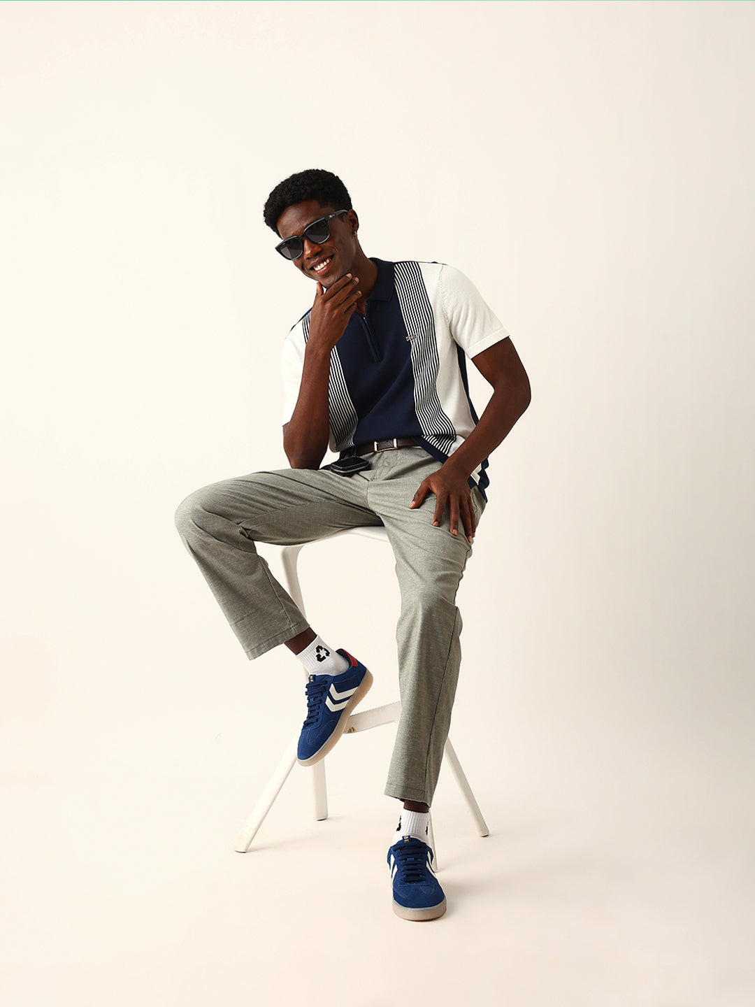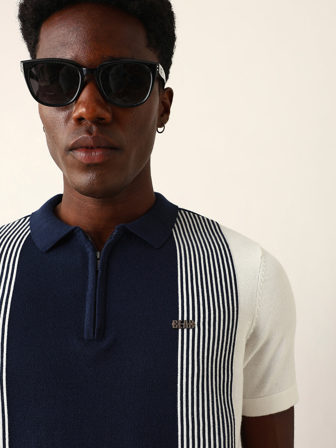 Blue & White Vertical Pinstripe Panel Polo with Half-Zip Placket