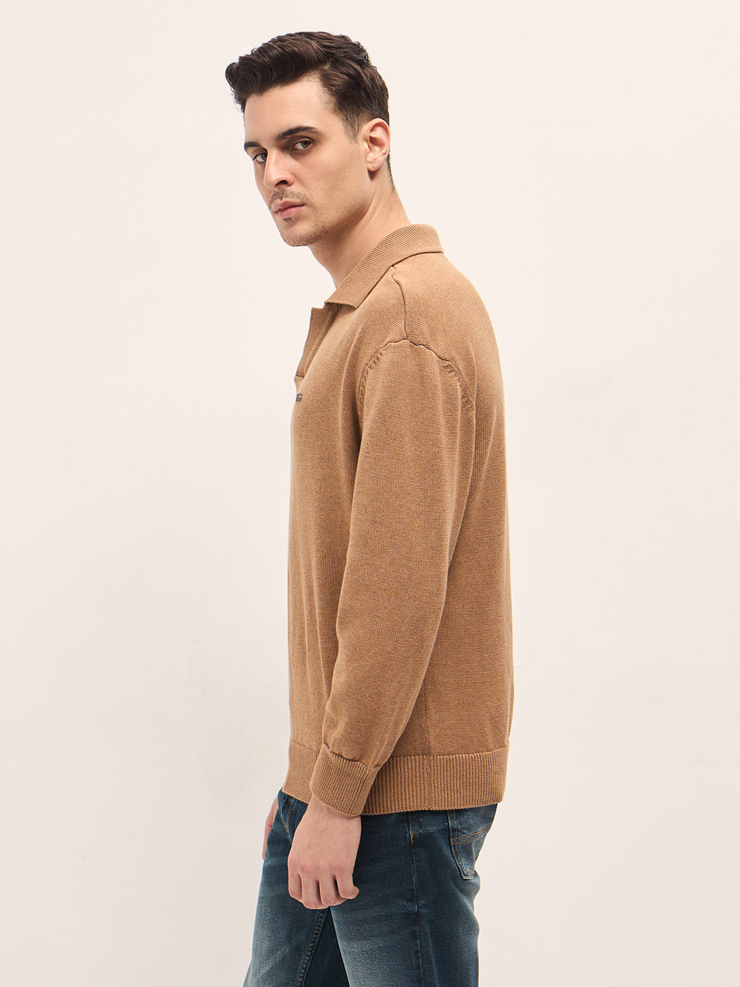 Beige Textured Knit Relaxed Fit Polo with a Stylish Open Placket