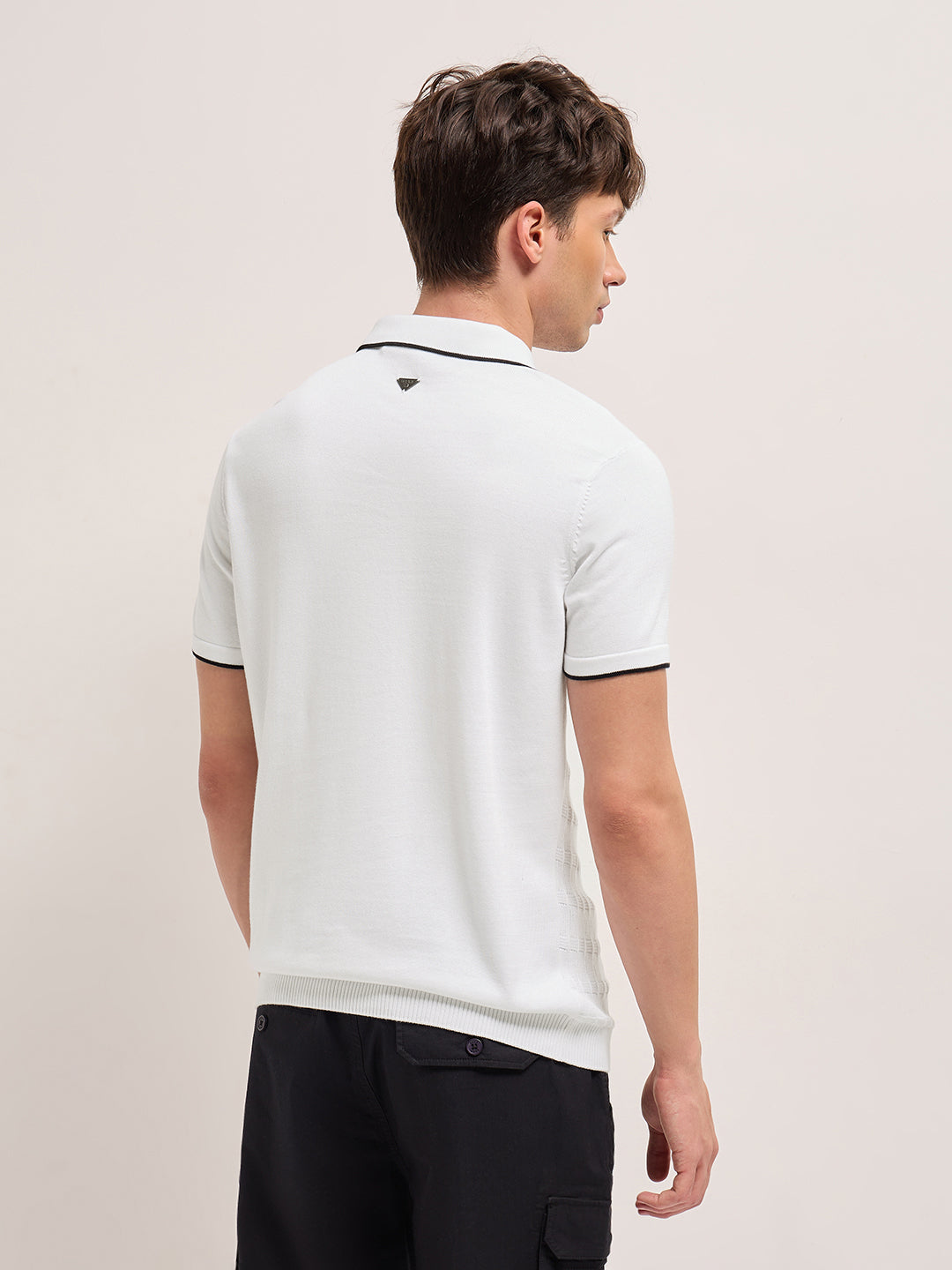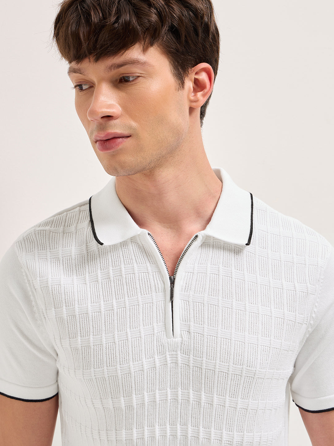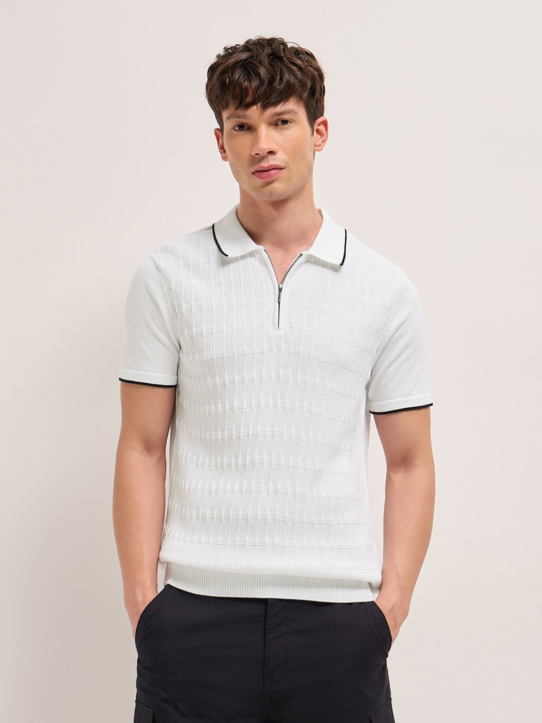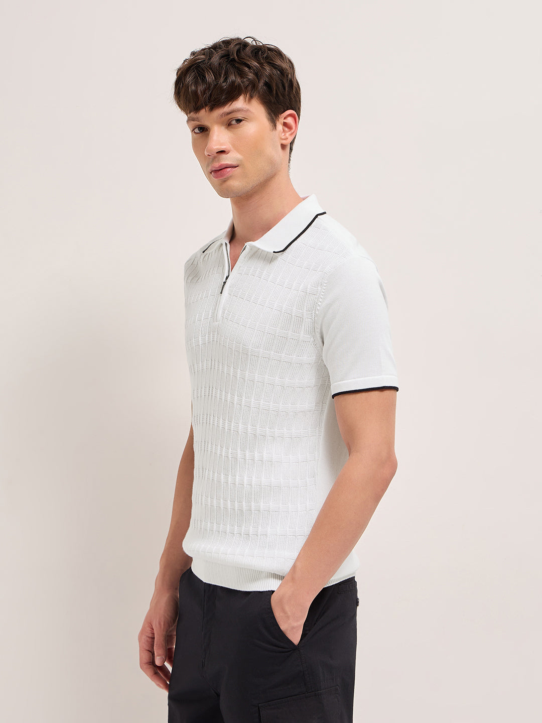 White Geometric Textured Knit Polo with Zip Placket, Regular Fit & Contrast Tipping