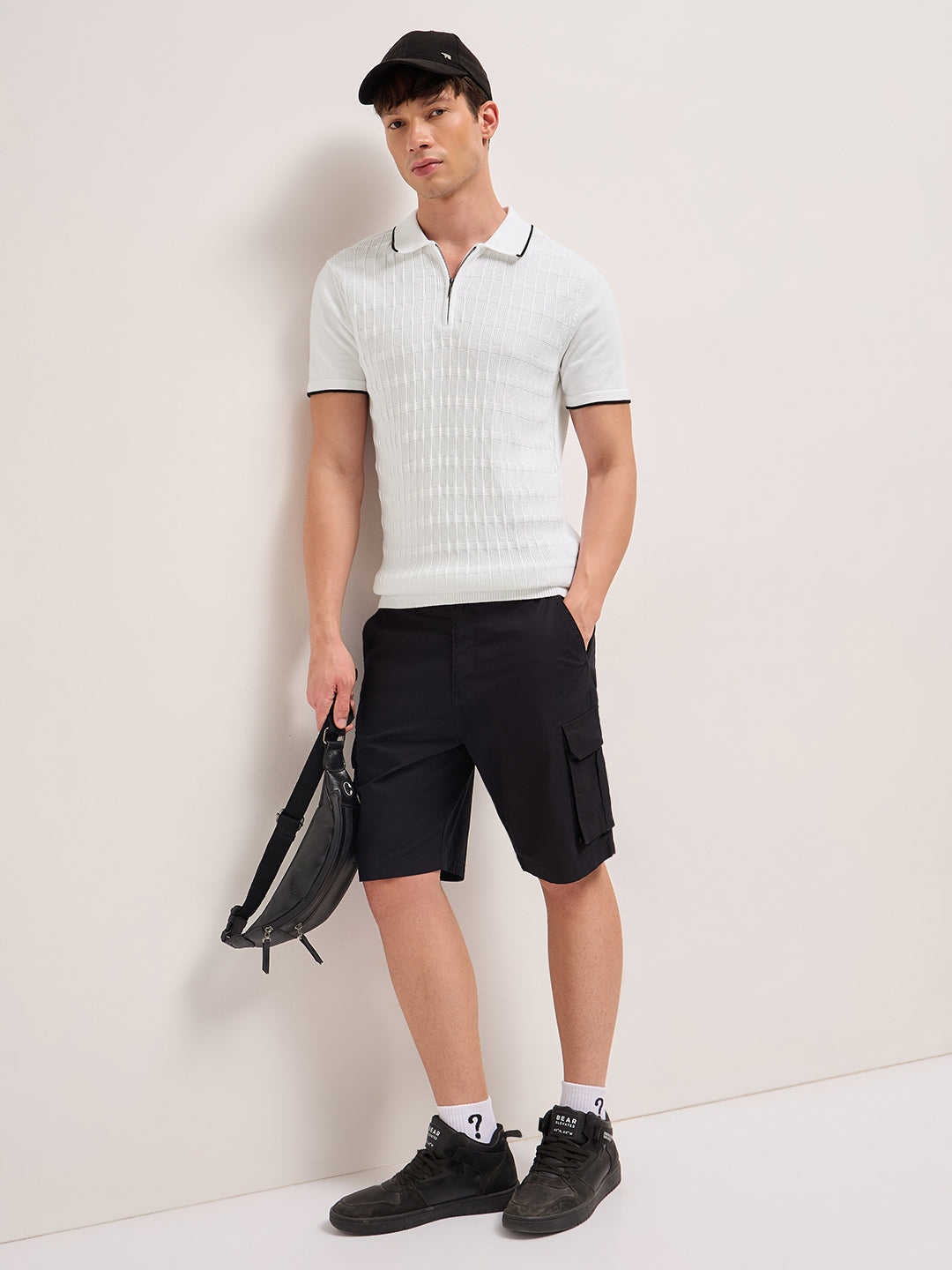 Shop White Geometric Textured Knit Polo with Zip Placket, Regular Fit & Contrast Tipping Online.