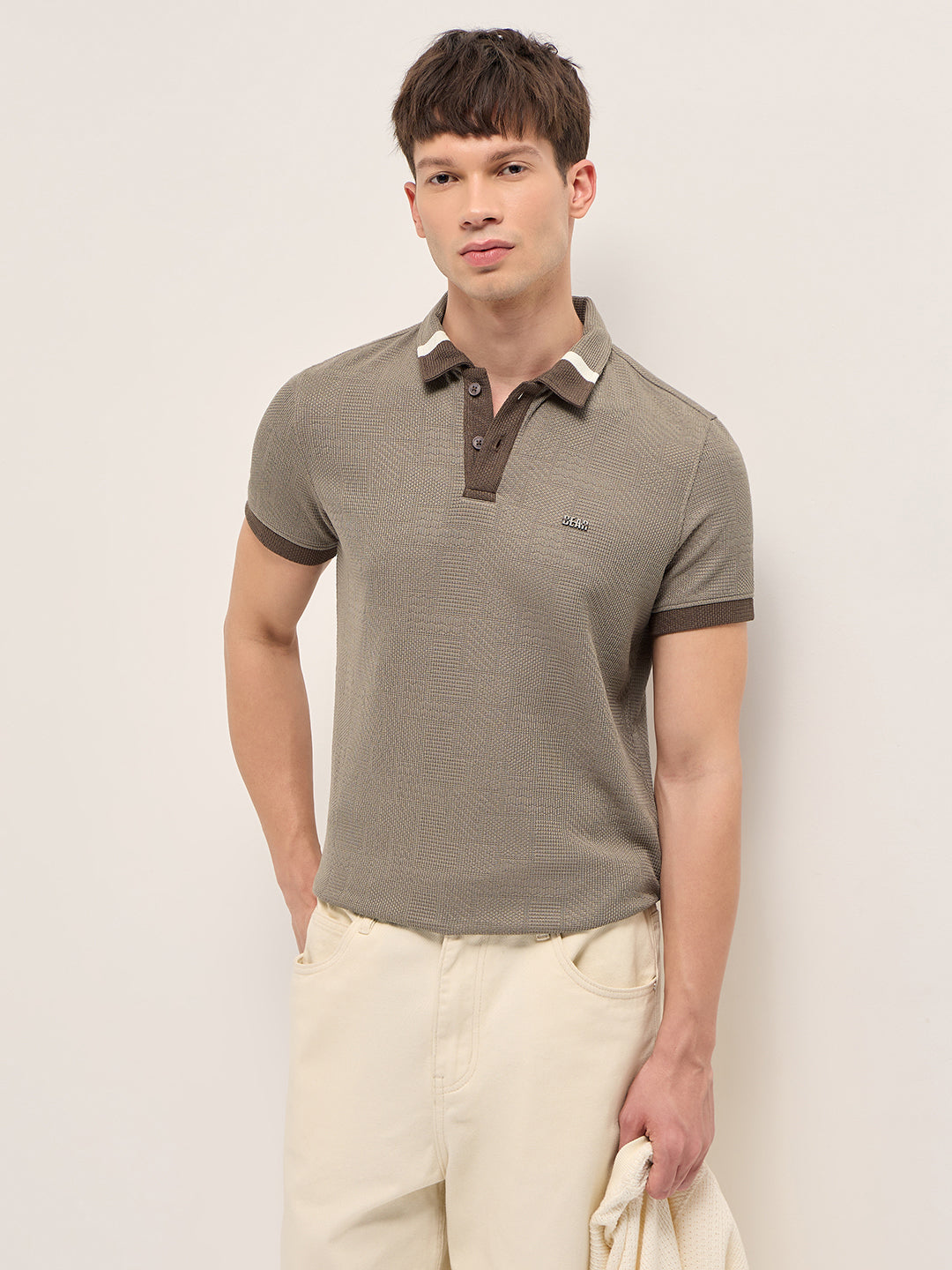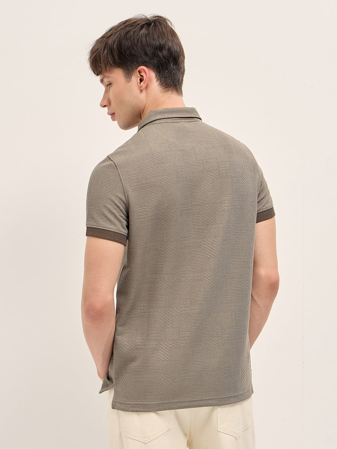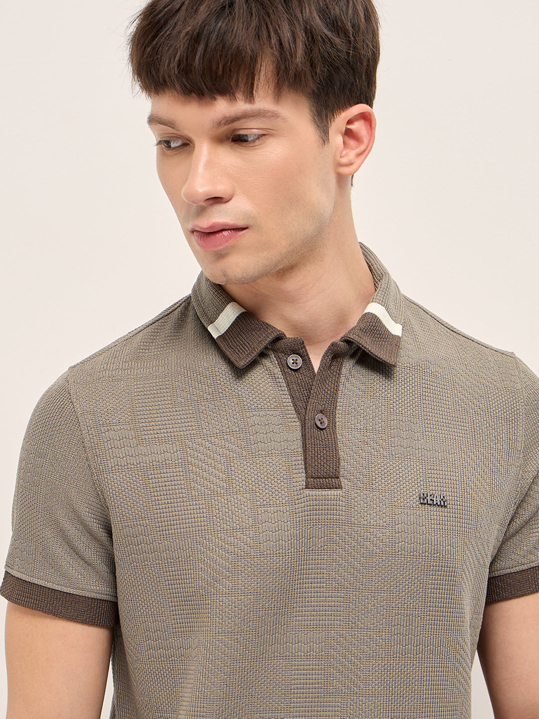 Light Brown Geometric Textured Knit Slim Fit Polo with Contrast Collar and Cuff Detailing