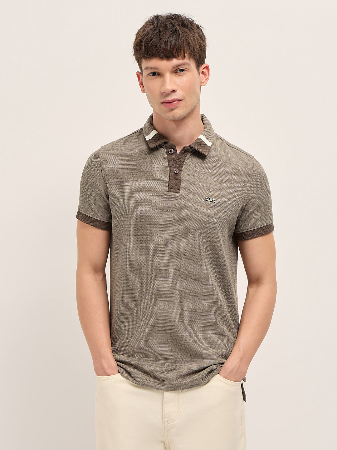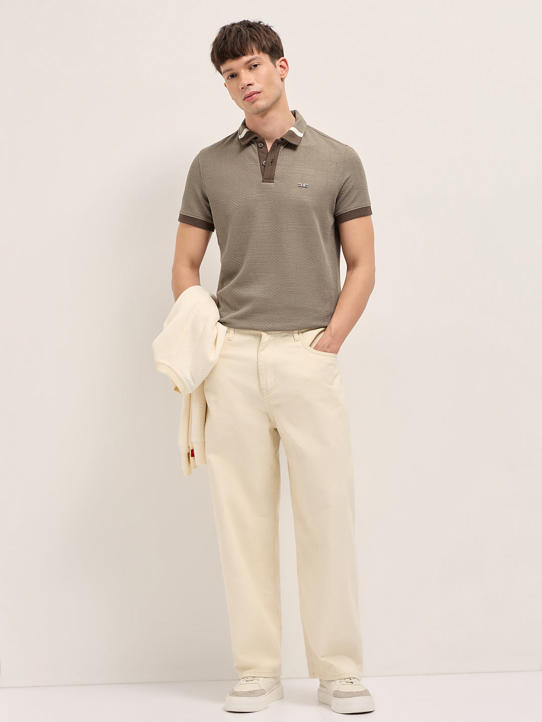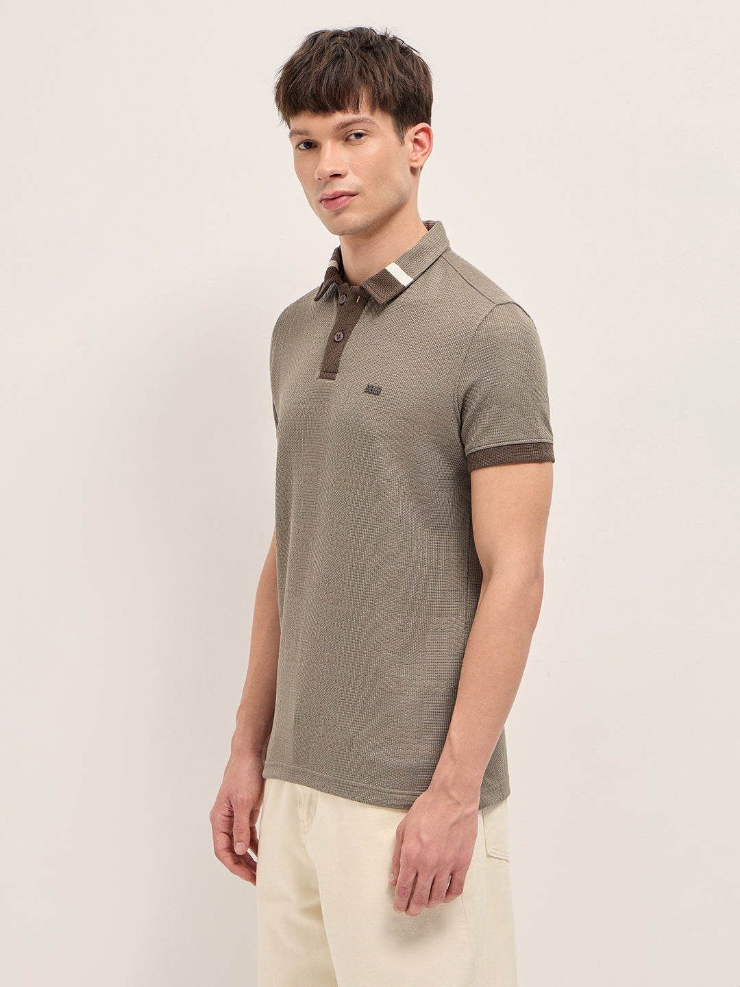 Light Brown Geometric Textured Knit Slim Fit Polo with Contrast Collar and Cuff Detailing
